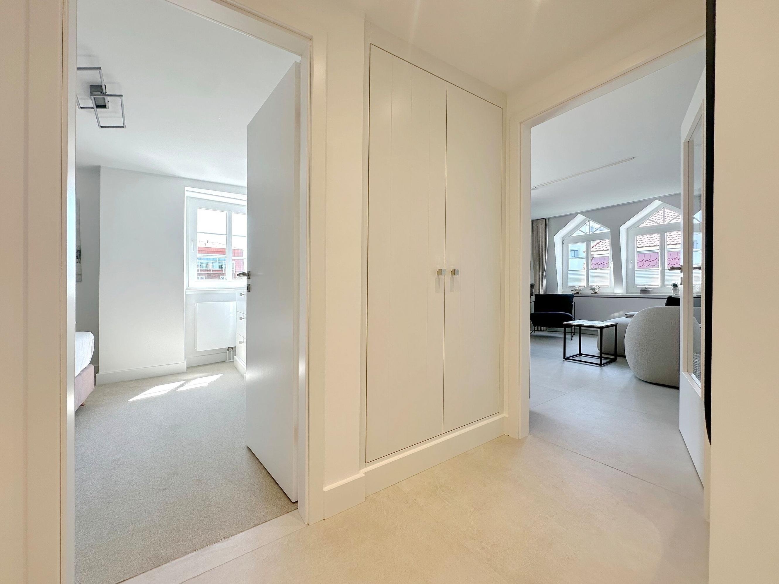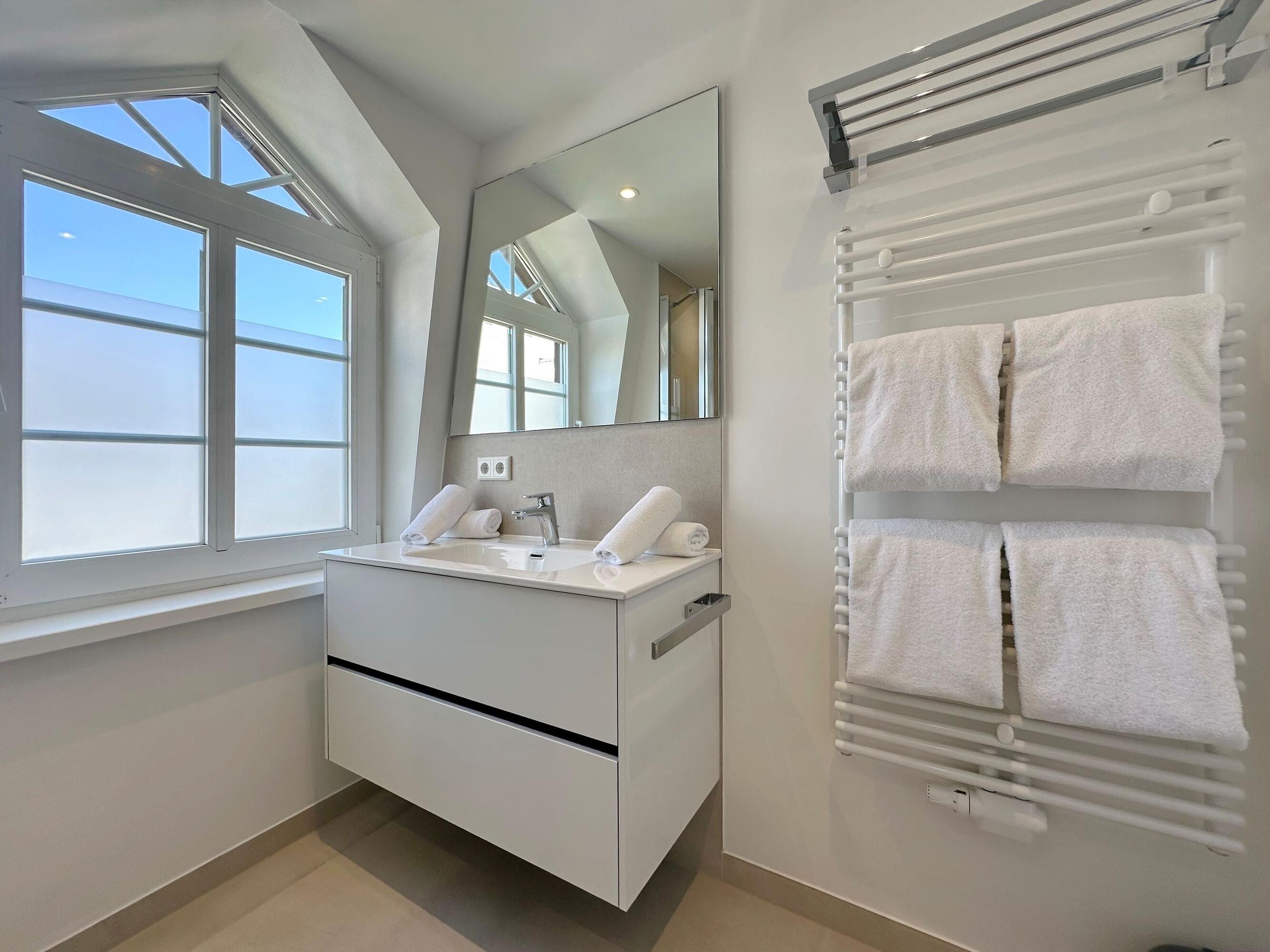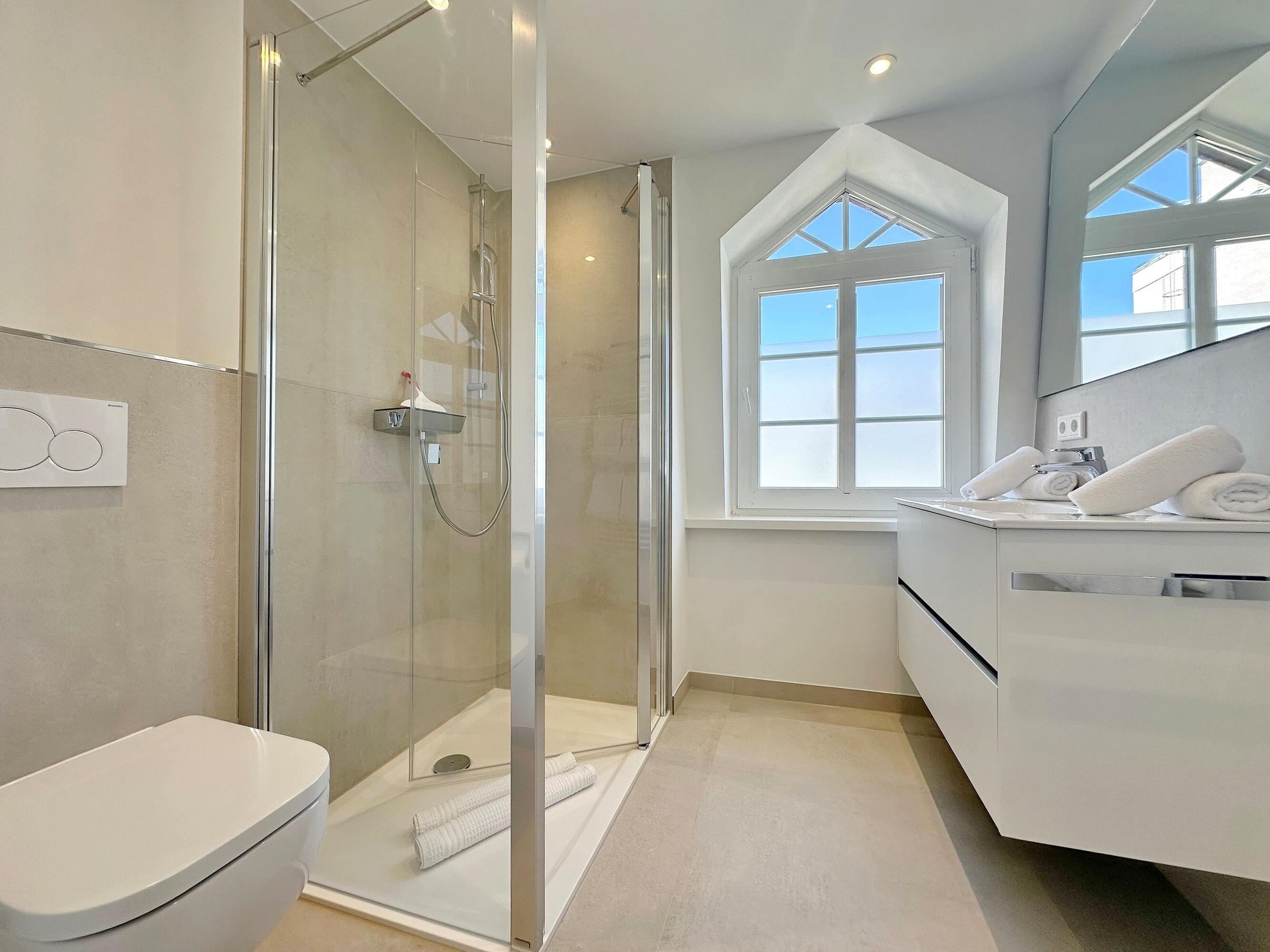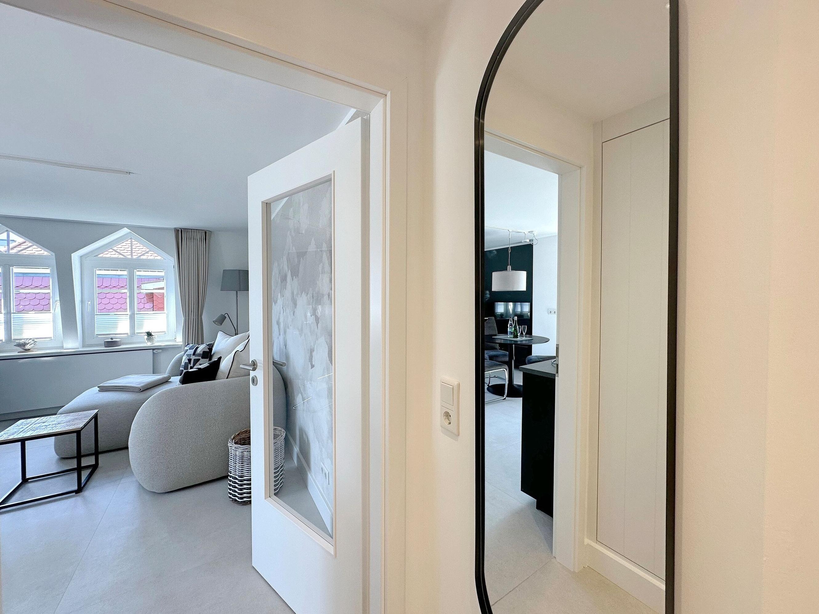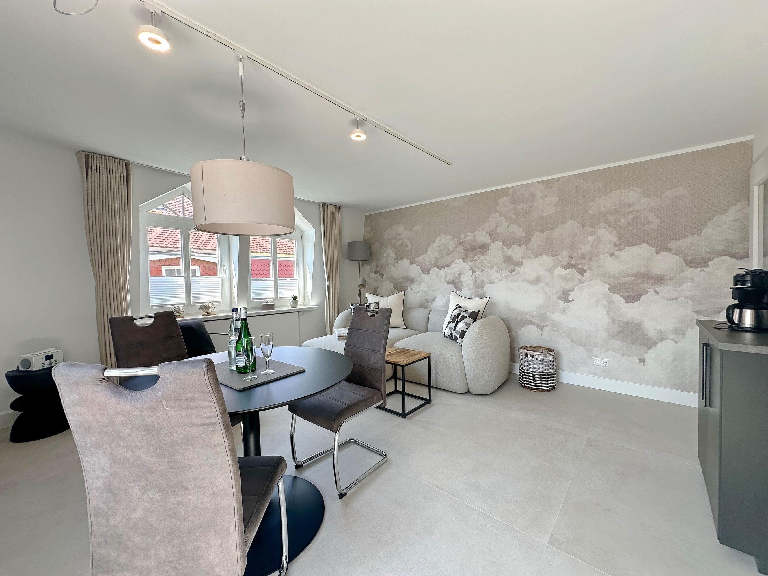 Die Wohnanlage "Olympia" bietet eine zentrale Lage in kurzer Entfernung zur Promenade, dem Badestrand und dem Meer. Auch die Fußgängerzone ist nur wenige Gehminuten entfernt. Die 2-Zimmer-Wohnung liegt im 1. Obergeschoss, wurde im Jahr 2025 renoviert und ist für 2 Personen ideal geeignet. Sie hat eine Größe von ca. 43 m², hat einen geschützten Ostbalkon, der perfekt zum Frühstücken geeignet ist und besteht aus einem Wohn- und Esszimmer mit Couchecke, Essplatz und integrierter Küche. Die Küche ist mit einem Induktionskochfeld, einem Geschirrspüler und einer Mikrowelle mit Grillfunktion ausgestattet. Im Schlafzimmer befindet sich ein Box-Spring-Doppelbett, Einbauschränke und ein weiterer Flat-TV. Das moderne Duschbad verfügt über ein Fenster. Im Dielenbereich befinden sich Einbauschränke und eine Garderobe für Jacken und andere Dinge. WLAN steht zur Verfügung, jedoch ohne Gewähr. Das Mitbringen von Haustieren und das Rauchen sind nicht gestattet. Bei Anreise sind Bettwäsche und Handtücher bereits aufgezogen. Die Wohnanlage verfügt über einen Schwimmbad- und Saunabereich sowie einen zusätzlichen Wellnessbereich mit finnischer Sauna, Dampfsauna und Ruhebereich. Fahrzeuge können gegen Gebühr und vorheriger Anmeldung in der Tiefgarage abgestellt werden. Eine Waschmaschine und ein Trockner stehen kostenfrei zur Verfügung. Für Fahrräder gibt es einen Abstellbereich in der Garage.