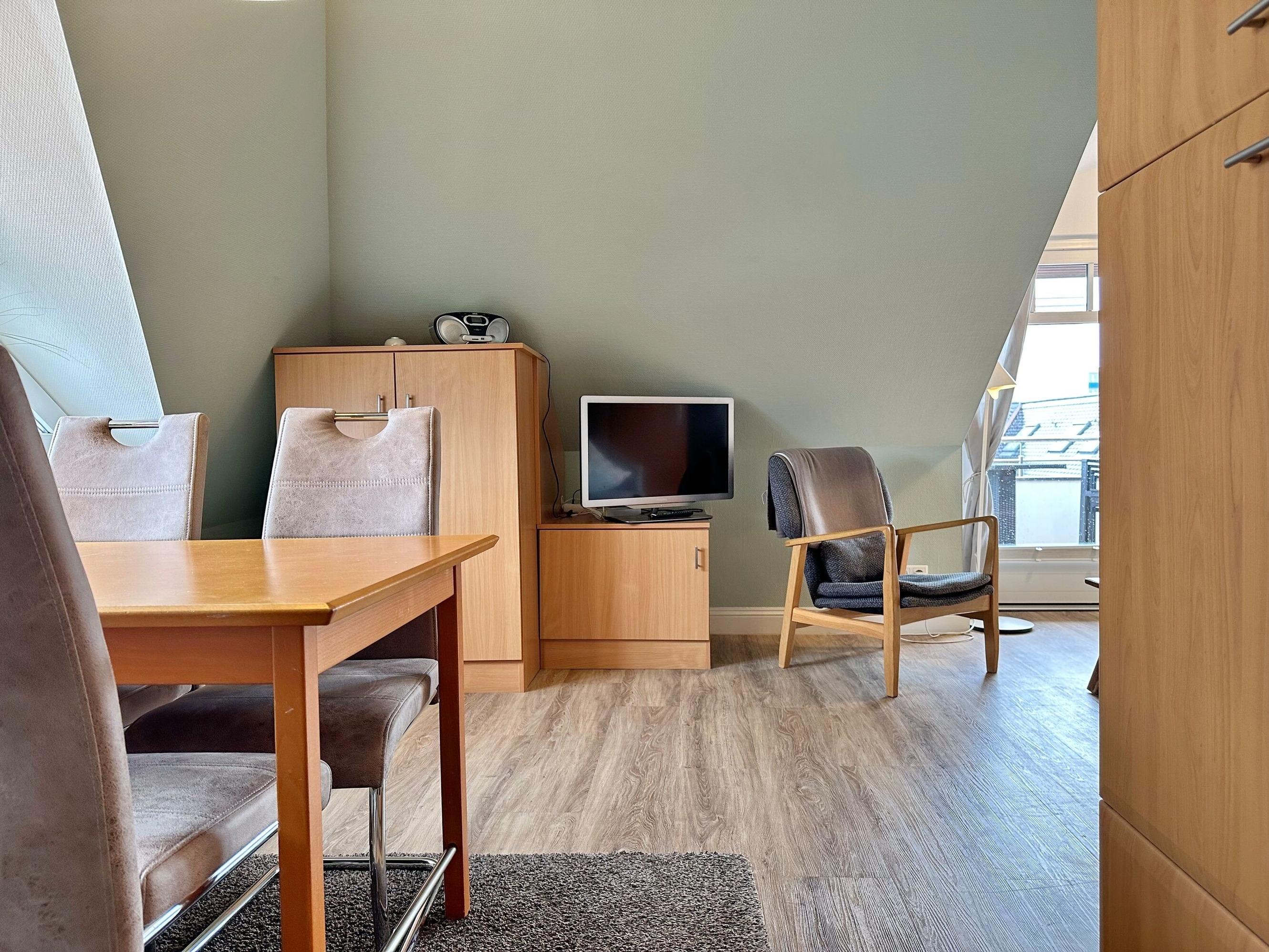 Hübsche 3-Zimmer-Wohnung im Haus "Olympia IV" im DG (mit Schrägen) mit sonnigem Südbalkon. Ca. 55m². Nichtraucherwohnung. Wohnzimmer mit Küchenzeile mit Geschirrspüler und Backofen, Couch und Essplatz für 4 Personen, Duschbad/WC, 2 kleine Schlafzimmer mit Doppelbetten und kleiner Schrankfläche, Flur mit Garderobe, Kabel-TV und Radio. Unter Haus 4 befindet sich das Schwimmbad mit Finnischer Sauna. Unter Haus 2 befindet sich ein separater Wellnessbereich mit Dampfsauna, Finnischer Sauna und Ruhebereich. Eine Waschküche mit Gemeinschaftswaschmaschine/Trockner ist vorhanden. Offenes W-LAN-Netzwerk steht zur Verfügung (ohne Gewähr). Bettwäsche und Handtücher sind zur Anreise aufgezogen. Ein Garagenstellplatz kann kostenpflichtig gebucht werden!