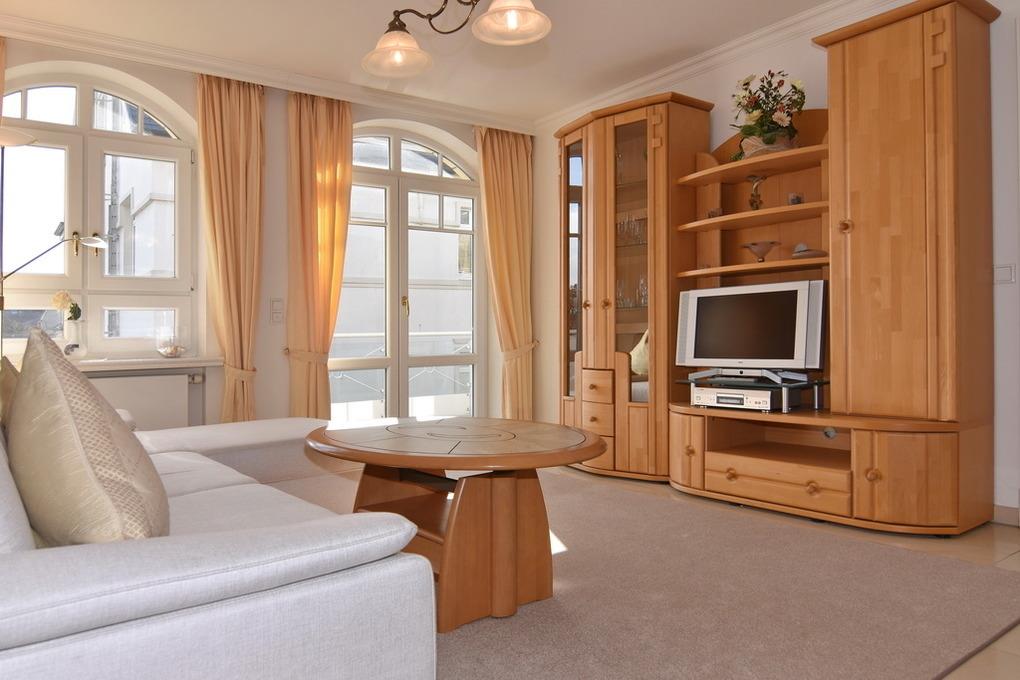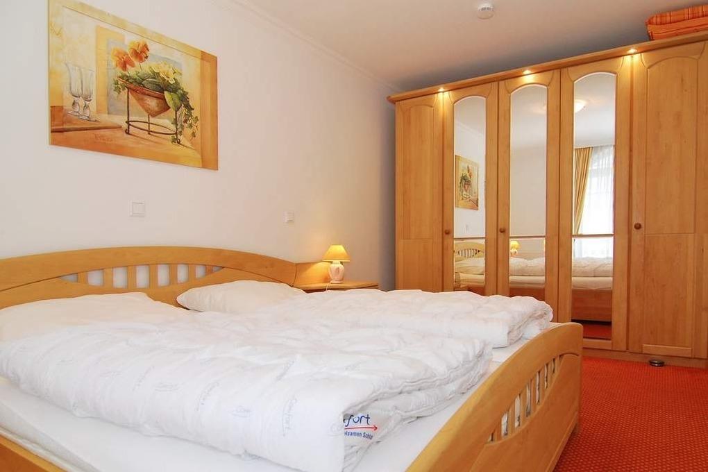 Schöne 2-Zimmer-Ferienwohnung im Haus " Residenz Bismarck", ca. 60 m² im 1.OG. Wohnraum mit Couchecke und Esstisch, Kabel-TV, Radio, Südbalkon mit Balkonmöbeln, offene Küche mit Geschirrspüler, Mikrowelle und Backofen, Schlafzimmer mit Doppelbett und Zugang zum Balkon, großes Bad mit Dusche und Wanne, Flur mit Garderobe. App. ist außer im Schlafzimmer gefliest. Garagenstellplatz Nr. 11. Tierhaltung ist verboten. Fahrradkeller und Waschküche vorhanden. Im Haus befinden sich ein Schwimmbad und eine Sauna. Bettwäsche und Handtücher sind zur Anreise aufgezogen.