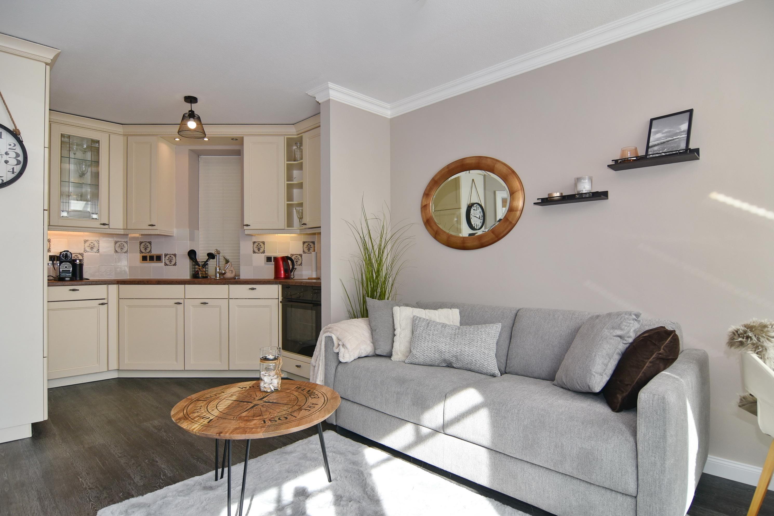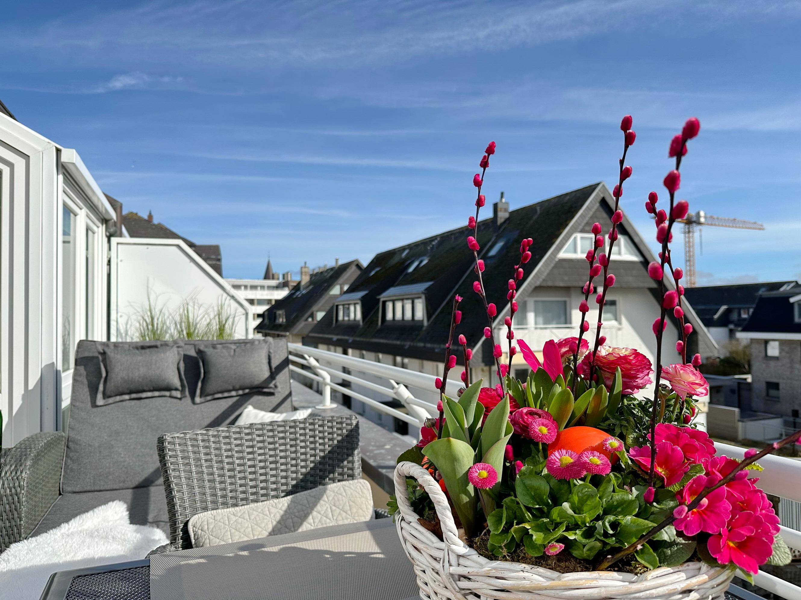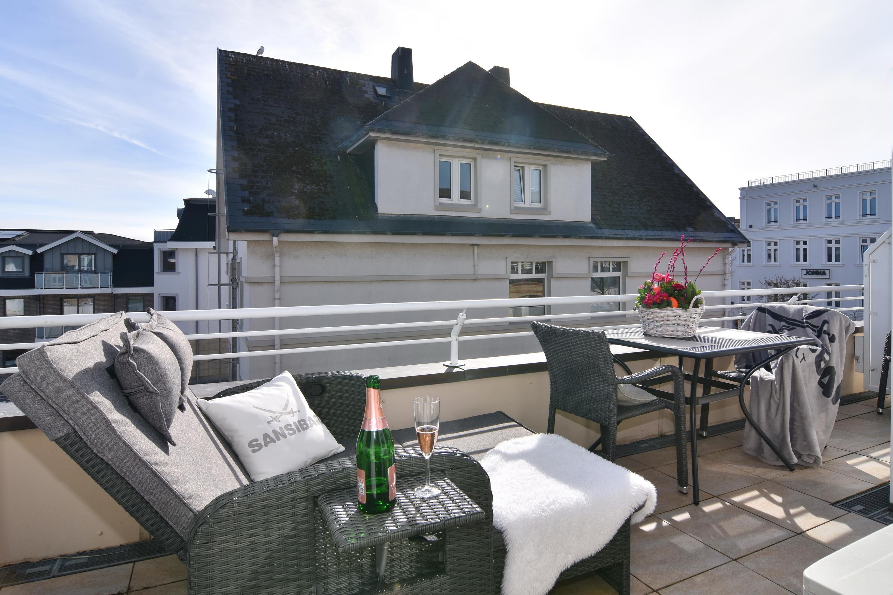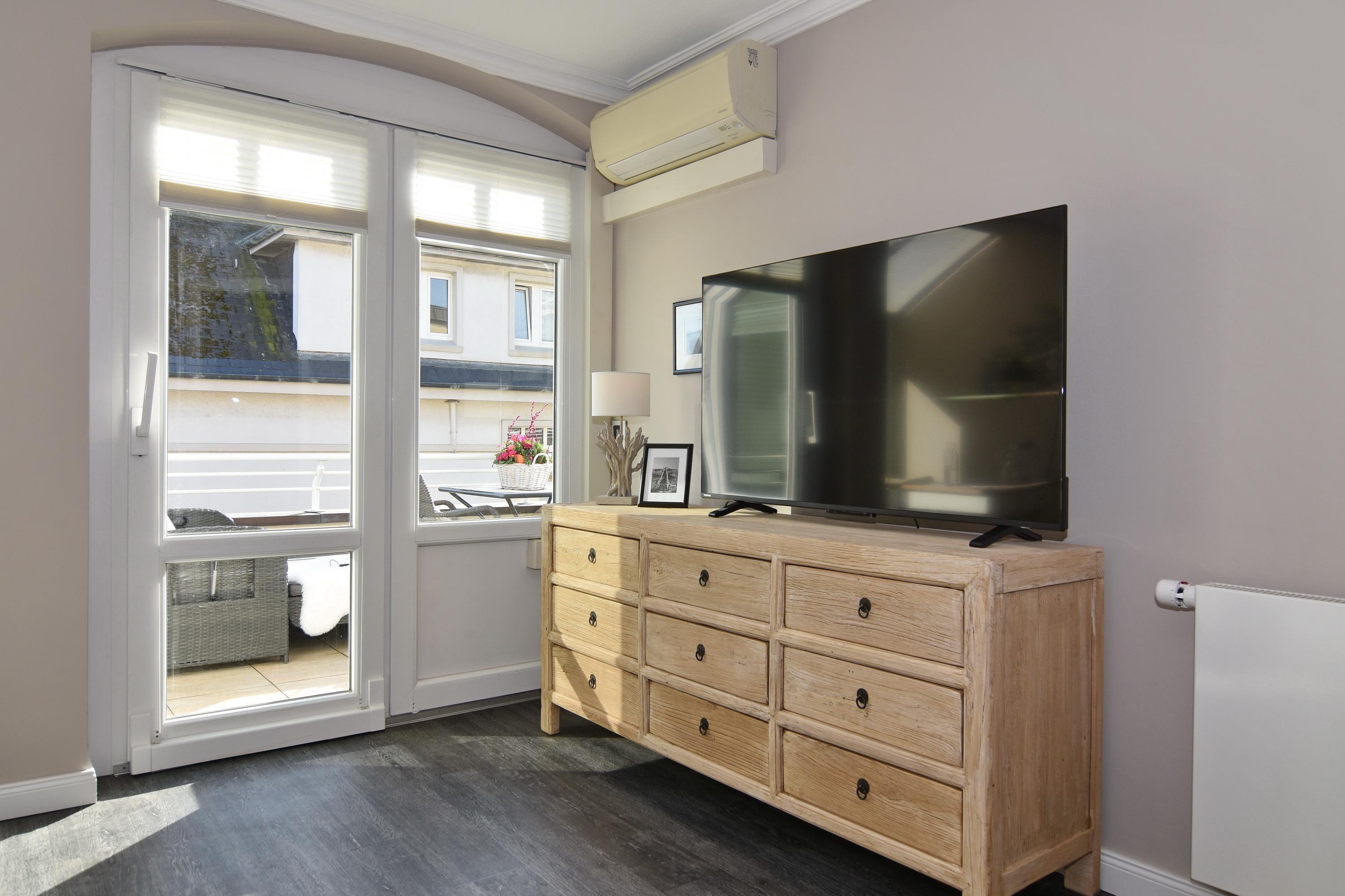 Wunderschöne 2-Zimmer-Wohnung im 2. OG der Residenz Bismarck. Direkt im Herzen Westerlands erwartet Sie eine lichtdurchflutete und modern eingerichtete Wohnung. Die Wohnung verfügt über ein Wohn- und ein Schlafzimmer. Von beiden Räumen gelangen Sie auf die großzügige Südterrasse. Im Wohnzimmer befindet sich der Essplatz im "Wintergarten" und bietet Ihnen selbst an grauen Tagen viel Licht. Das Sofa verfügt über eine Schlaffunktion, so dass Sie auch getrennt schlafen können. Die offene Küche verfügt über Backofen, Mikrowelle, Cerankochfeld, Kühlschrank mit Gefrierfach, Wasch-Trockner, Nespressomaschine und Kaffeefiltermaschine. Das Schlafzimmer hat neben dem komfortablen Boxspringbett (180x200), einen Kleiderschrank, TV und kleine Leseecke mit Sessel im dazugehörigen "Wintergarten". Sämtliche Fenster sind mit Plissees versehen, im Schlafzimmer sind entgegen der Bilder inzwischen Verdunklungsplissees angebracht worden. Wohn- und Schlafraum verfügen über eine Klimaanlage. Das Badezimmer besteht aus Wanne mit Duschvorrichtung, Waschbecken und WC. Die Betten sind zur Anreise bezogen.