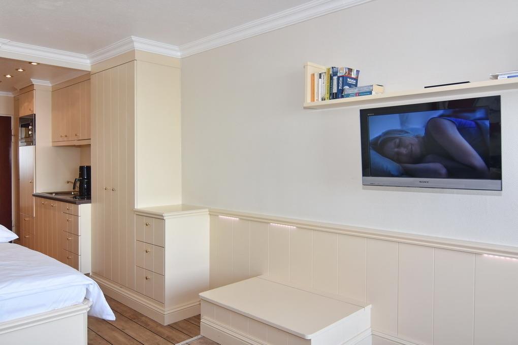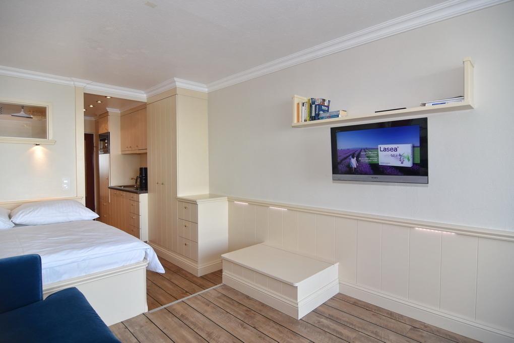 Schöne 1-Zimmer-Ferienwohnung im Haus Sylter Welle, 4.OG, ca. 25 qm; Nichtraucher-Whg.![nbsp][nbsp]Uneingeschränkter Meeresblick. Heller Wohn-/Schlafraum mit Doppelbett (140*200) und Westbalkon zur Seeseite, erhöhter Essplatz (Achtung Stufe) mit herrlichem Meeresblick, 2-Sitzer-Couch, Flat-TV, Radio, W-Lan (ohne Gewähr), Duschbad / WC, hübsche Küchenzeile mit Geschirrspüler und Mikrowelle. Bettwäsche und Handtücher sind zur Anreise aufgezogen. Ein PKW-Stellplatz kann kostenpflichtig zugebucht werden.