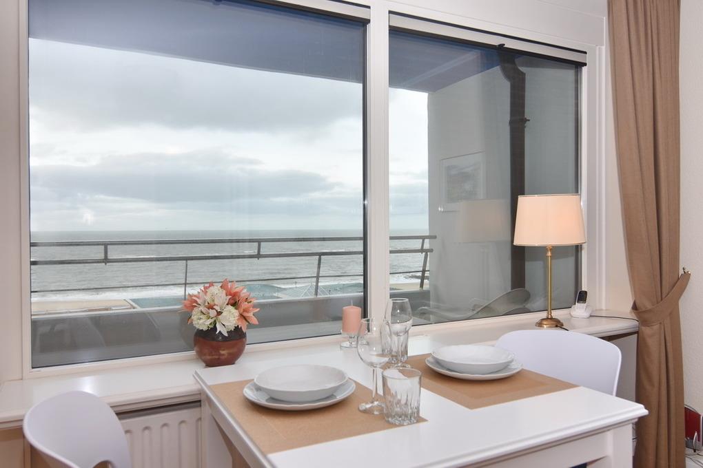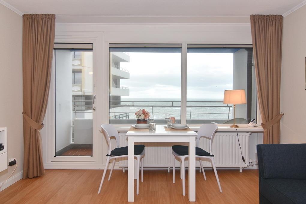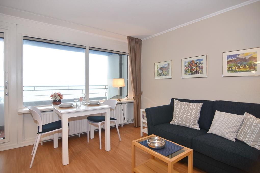 Hübsche 1-Zimmer-Wohnung zur Seeseite, ca. 34m² im 5. OG im Haus Sylter Welle. Wohn-/ Schlafraum mit Einzelschrankbetten (je 90 x 190), Essplatz am Fenster, 2-Sitzer-Couch und Sessel, Flat-TV, W-LAN (ohne Gewähr), Telefon (Festnetzflatrate), Zugang zum Westbalkon mit Blick auf Strand und Meer. Im Flurbereich befindet sich eine Küchenzeile mit Geschirrspüler, Ceranherd und Mikrowelle. Duschbad/WC. Rauchen und Tierhaltung ist hier nicht gestattet. Bettwäsche und Handtücher sind zur Anreise aufgezogen. Ein PKW-Stellplatz kann kostenpflichtig zugebucht werden.