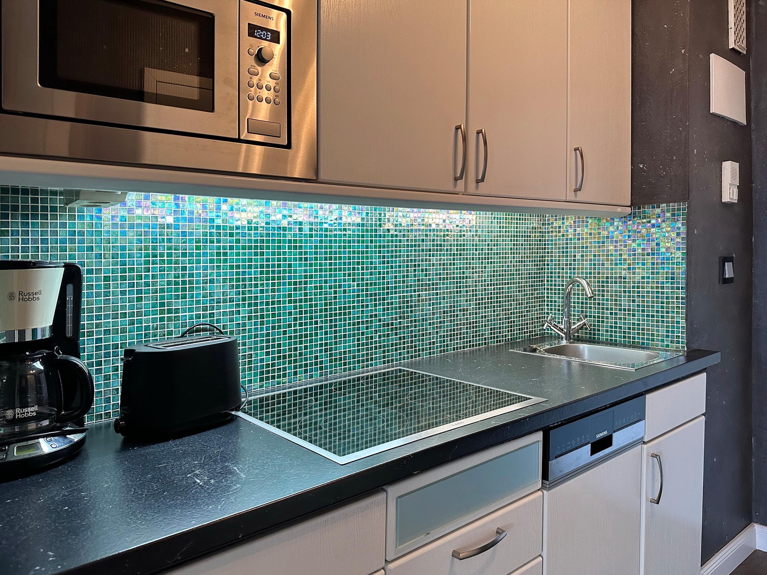 Die moderne 1-Zimmer-Wohnung befindet sich im 8. OG des Haus "Sylter Welle" zur Seeseite. Der kombinierte Wohn-/Schlafraum ist mit einem Doppelschrankbett, 2-Sitzer-Sofa und Sessel sowie einem Essplatz am Fenster ausgestattet. Der Fernseher ist in die Wand eingelassen. Die gut ausgestattete Küche liegt im Flurbereich und verfügt über einen 4-Platten-Ceranherd, Nespressomaschine, Mikrowelle und Geschirrspüler. Das edle Bad besticht mit seiner bodentiefen Glasdusche, dem Waschsteinbecken, der Regendusche und den kleinen Extras.. Die gesamte Wohnung ist mit Designboden in Holzoptik ausgelegt. Im Haus stehen Ihnen zwei Fahrstühle, hauseigenes WLAN-Netz (ohne Gewähr) sowie eine gemeinschaftliche Waschküche zur Verfügung. Ein Pkwstellplatz kann bei Verfügbarkeit kostenpflichtig dazu gebucht werden. Ein Hund kann gegen Gebühr und Anmeldung mitgebracht werden.