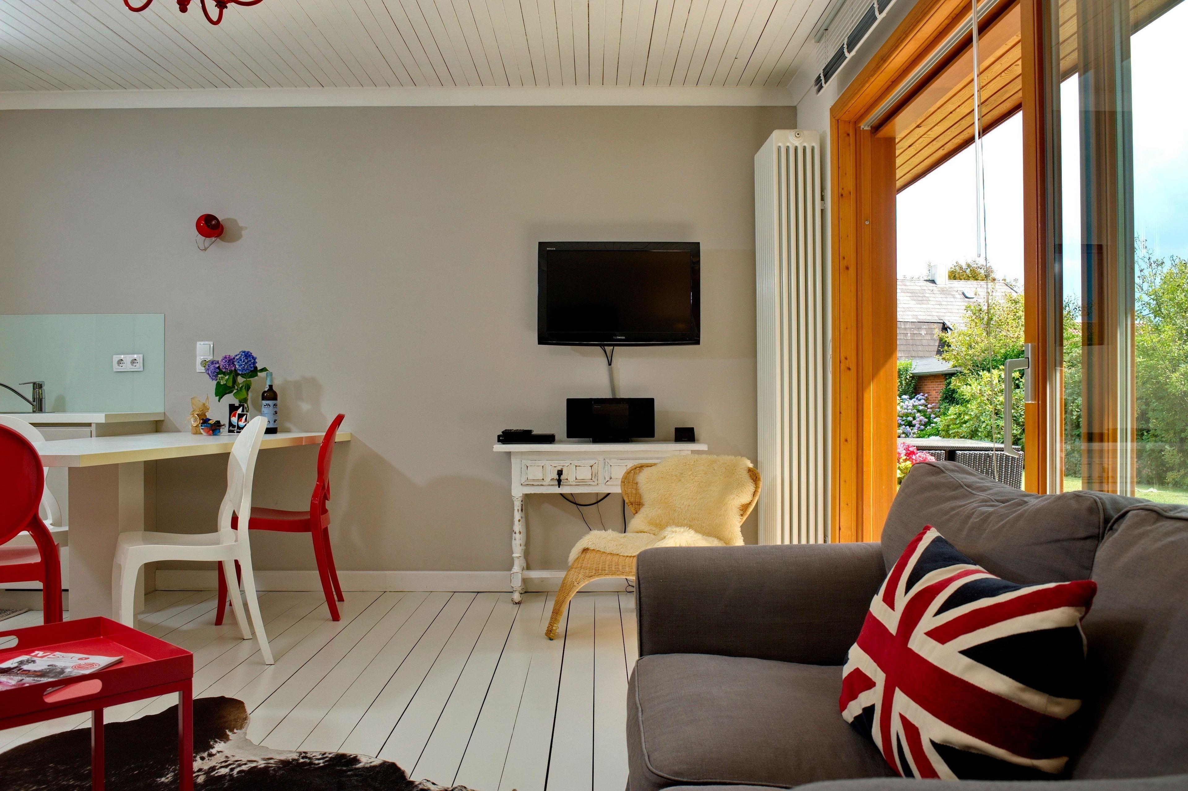 Schicker lichtdurchfluteter Bungalow in Toplage: 400m vom Strand und 800m vom Stadtzentrum entfernt - mit grossem Garten und Südterrasse. Er hat 2 Schlafzimmer (1x mit Doppelbett, 1x Etagenbett), eine moderne Küche im Wohnzimmer mit Blick in den Garten.
