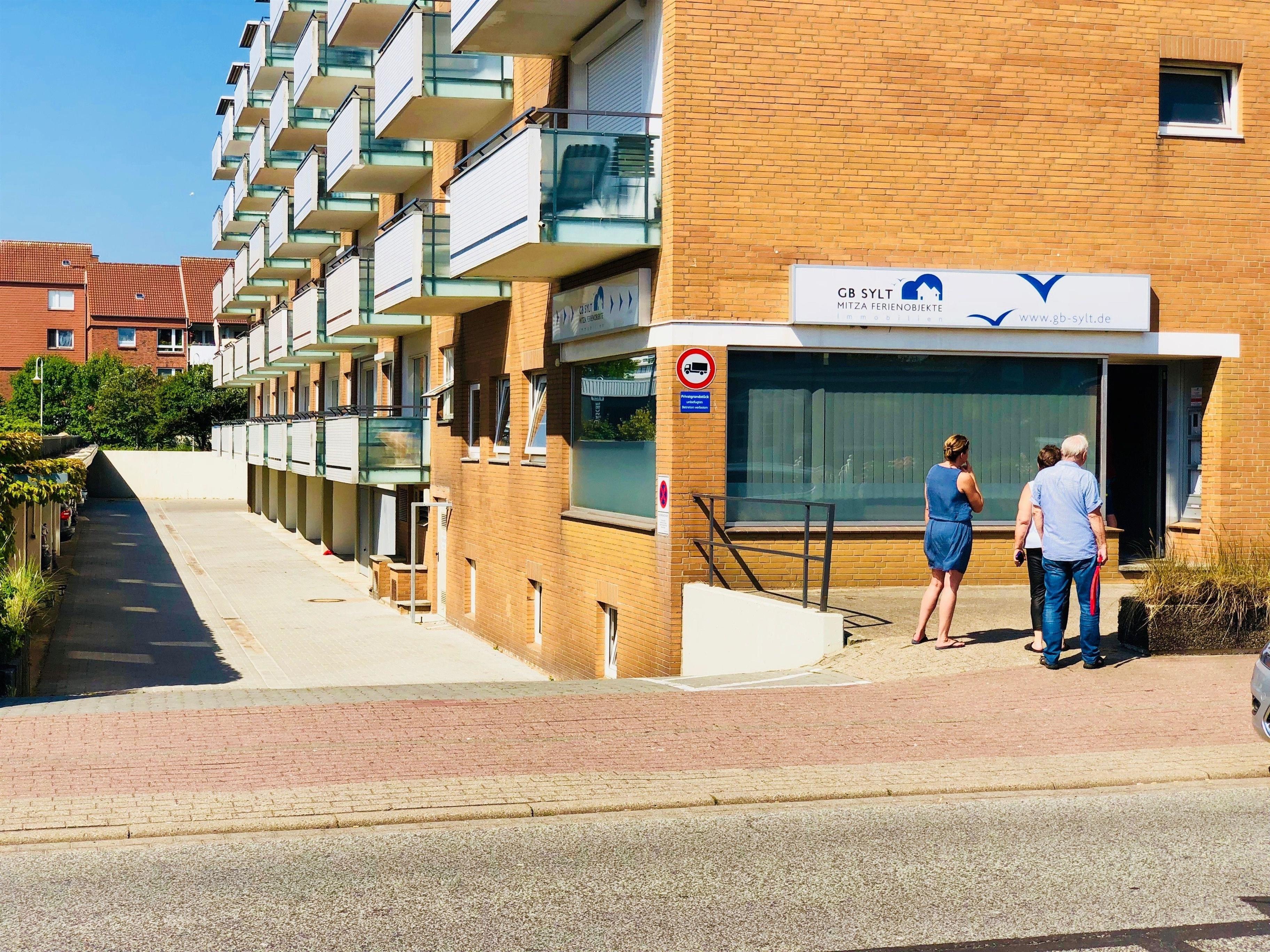 Der Haupteingang zum Haus befindet sich in der Kjeirstraße 19-21 - links davon befindet sich die Einfahrt zu den Stellplätzen. Der Stellplatz Nr. 73 ist für Sie zur Nutzung vorgesehen.