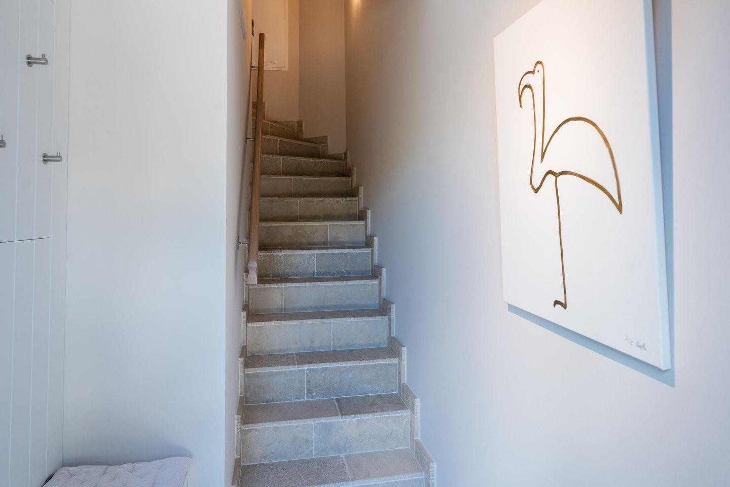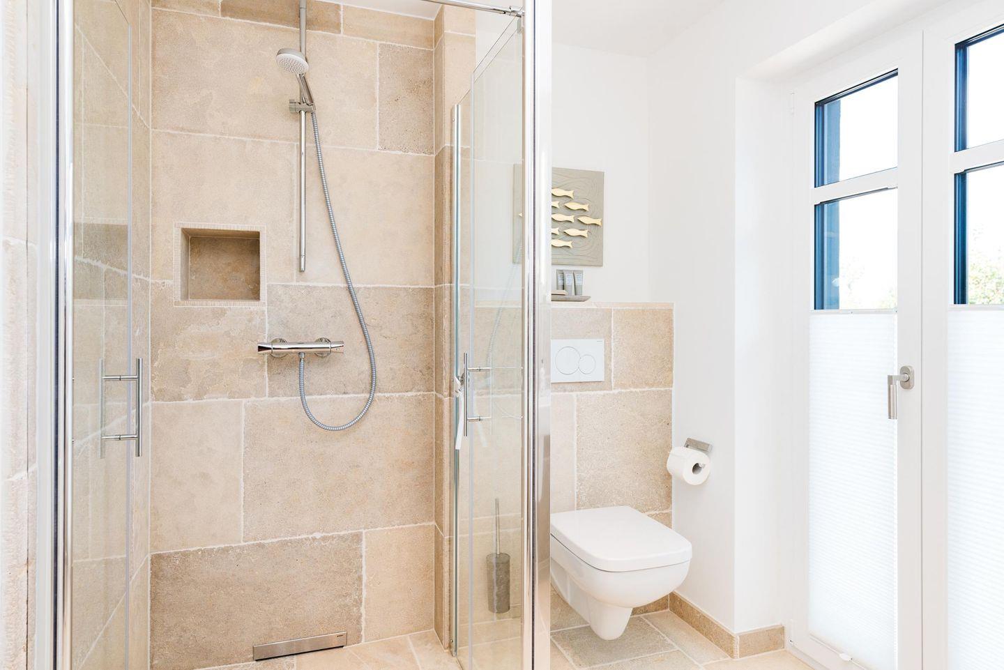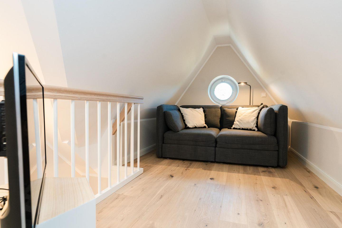 Auch das Bad mit seiner Walk-in-Dusche wirkt durch die sandfarbenen Natursteinfliesen wunderbar einladend. Eine Treppe höher wartet unter dem Dach ein himmlisch gemütliches Boxspringbett und wer einfach nur ein wenig chillen möchte, kann dies hier auf dem Sofa dort tun.