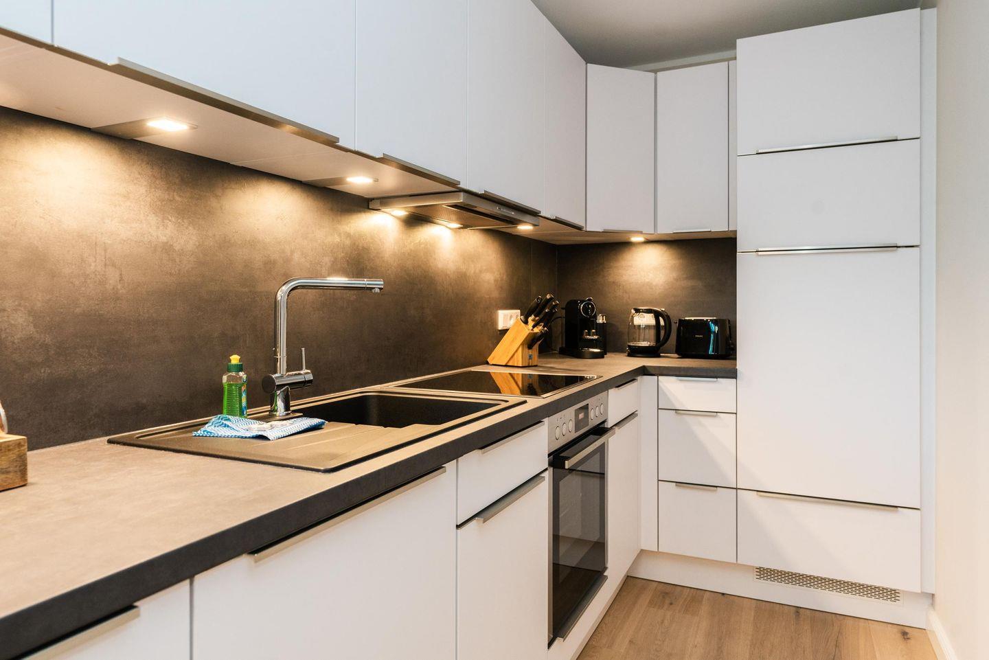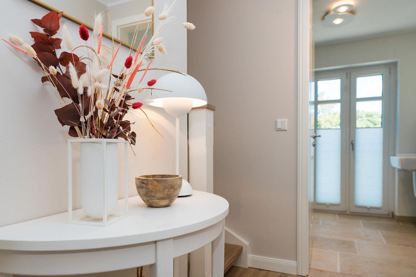 Herzstück ist der helle und sehr hochwertig eingerichtete Wohnraum mit Essbereich und einer offenen Küche, die jeden Hobbykoch glücklich macht. Für Glücksgefühle sorgen auch die vielen liebevoll ausgesuchten Accessoires und Bilder, die perfekt auf die Einrichtung abgestimmt sind.