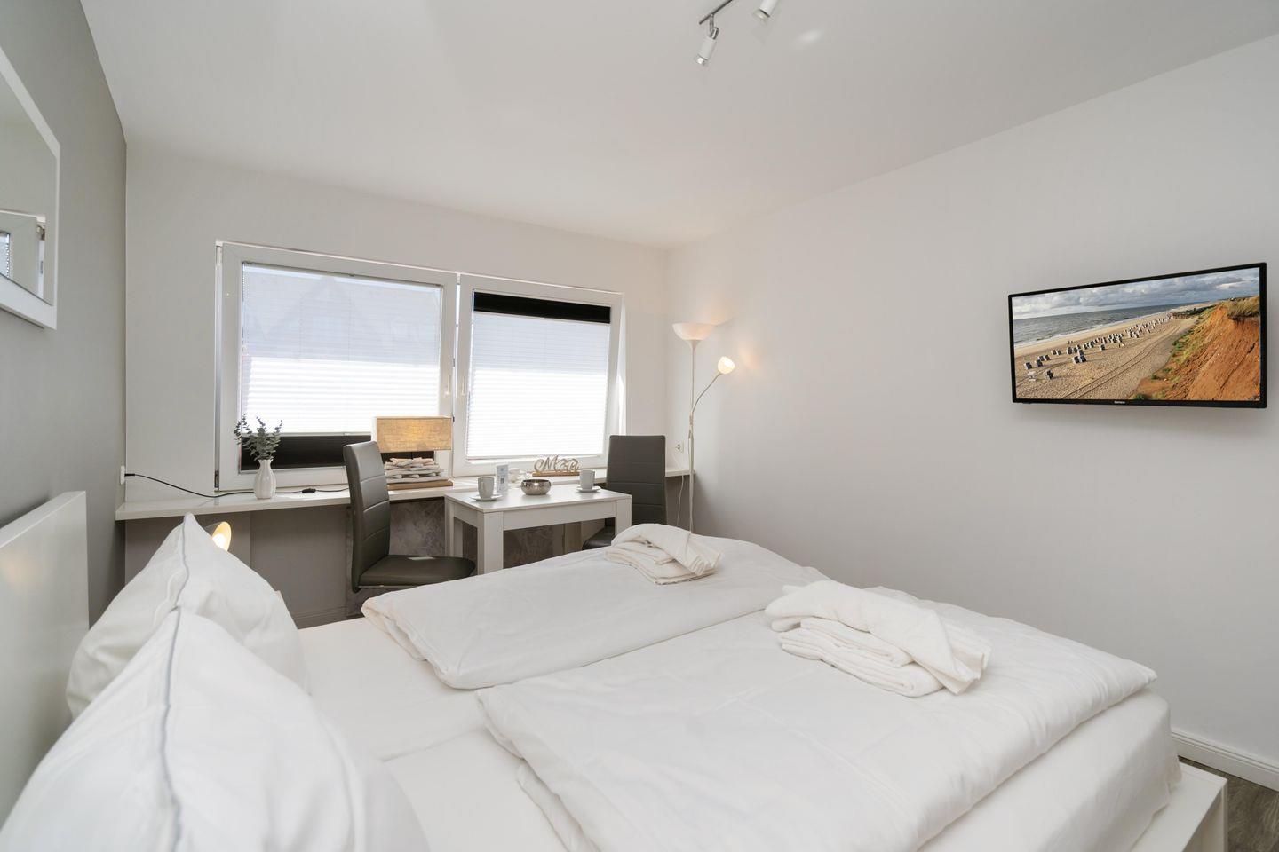 Einfaches Erdgeschossappartement im Zentrum Westerlands für bis zu 2 Pers. in gepflegter Wohnanlage. Inkl. WLAN und Möglichkeit der Nutzung des Gemeinschaftsgartens sowie der Strandkörbe (in der Saison). PKW-Stellplatz optional buchbar. Haustiere erlaubt.