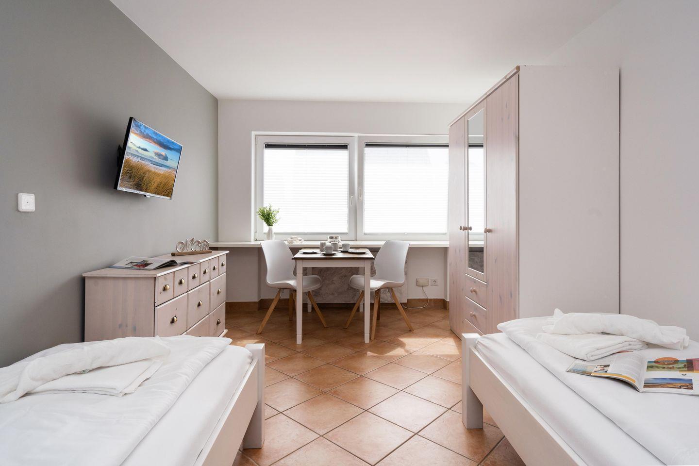 Dieses einfache Einzimmerapartment für bis zu 2 Personen befinden sich in einer absolut zentralen Lage von Westerland. Der Wohnbereich bietet Ihnen zwei Einzelbetten sowie eine Essecke und ist mit einem TV ausgestattet. Die Ferienwohnung verfügt über ein Duschbad sowie eine gut ausgestattete Pantryküche. Nutzen Sie gerne den Gemeinschaftsgarten samt Strandkorb (in der Saison). Kostenloses WLAN sowie ein optional buchbarer PKW-Stellplatz sind vorhanden. Haustiere sind erlaubt. Die Wohnanlage befindet sich ca. 150 m hinter dem Westerländer Bahnhof und ist an einem Parkplatz gelegen.
