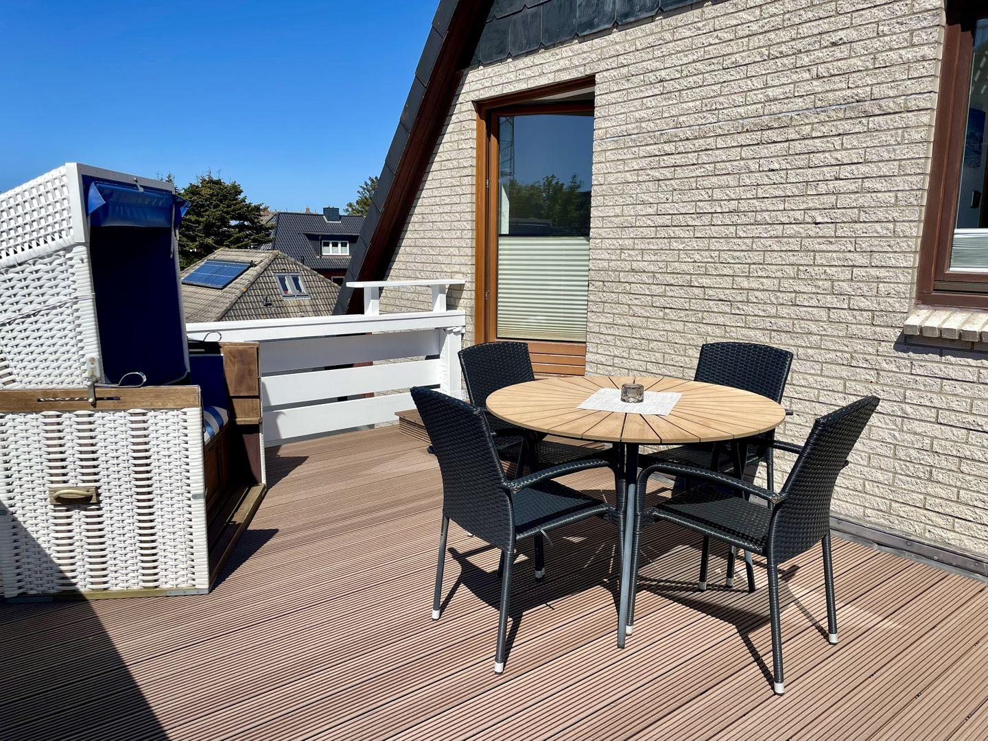 Gemütliche 3-Zimmer Ferienwohnung über zwei Ebenen mit schöner Südterrasse in Westerland. Öffentliche Parkplatzmöglichkeiten in der Umgebung sowie ein Strandkorb (in der Saison).