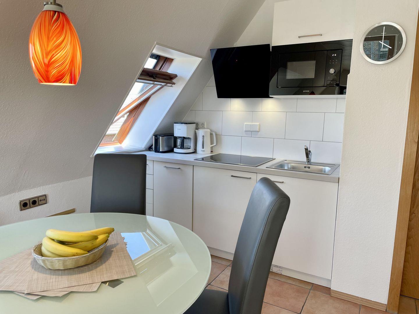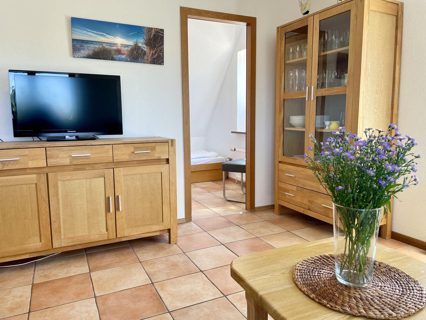Diese gemütliche ca. 55 m² große Ferienwohnung für bis zu 4 Personen verläuft über zwei Ebenen. Das Obergeschoss bietet Ihnen eine offene Küche samt Geschirrspüler mit angrenzendem Wohn- und Essbereich, ein Duschbad sowie ein Einzelschlafzimmer. Im Spitzboden erwartet Sie ein Doppelschlafzimmer mit einem Notbett. Die Treppe in den Spitzboden ist steil. Nutzen Sie gerne die schöne Südterrasse samt Strandkorb (in der Saison). Kostenlose, öffentliche Parkplatzmöglichkeiten vor dem Haus sind vorhanden. Haustiere sind willkommen.