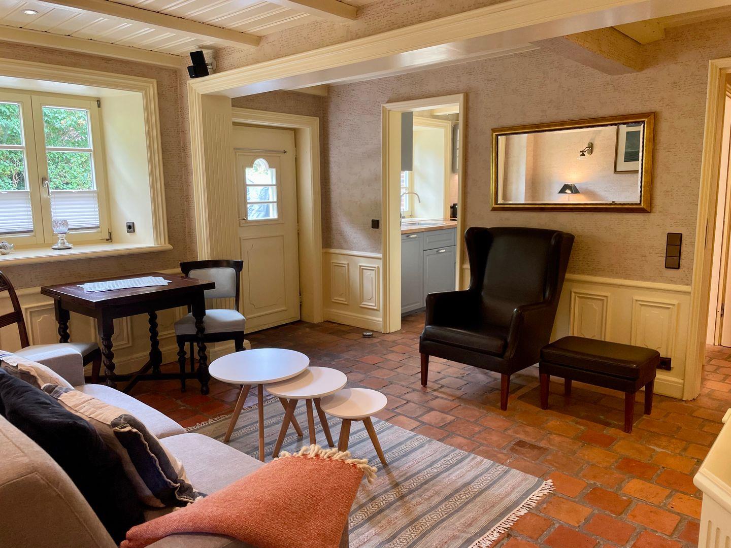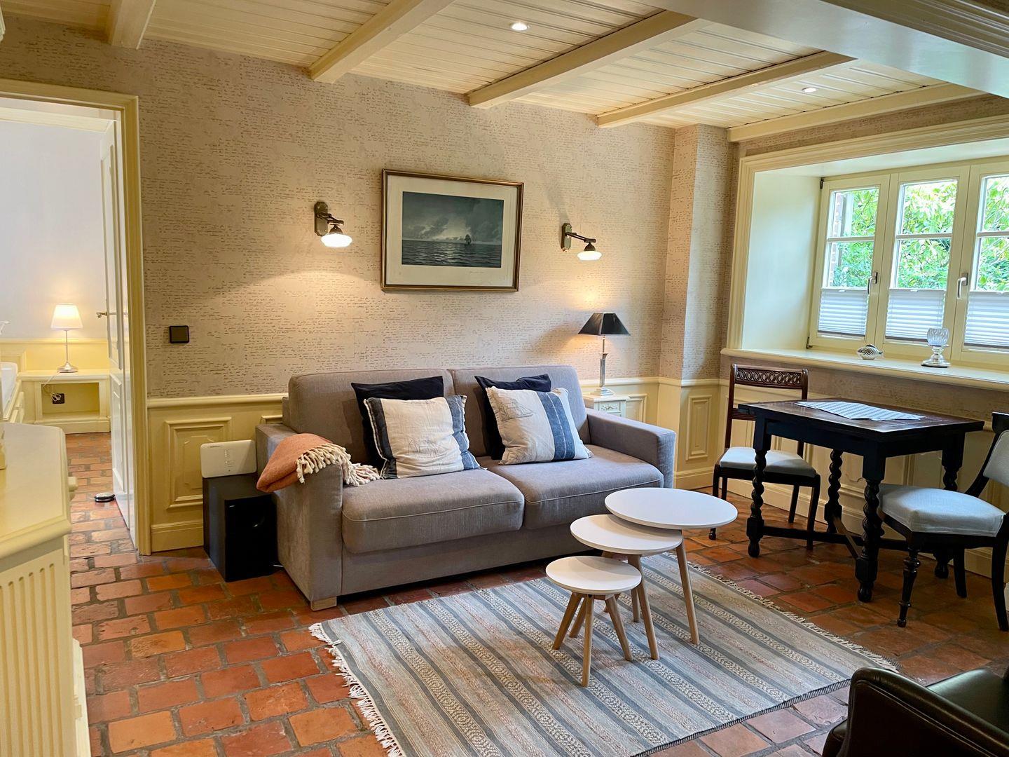Diese charmante ca. 42 m² große Ferienwohnung für bis zu 2 Personen bietet Ihnen eine geschmackvolle Ausstattung. Im Schlafzimmer erwartet Sie ein gemütliches Doppelbett (180x200 cm) unter einer rustikalen Holzbalkendecke. Die moderne Küche samt Geschirrspüler ist voll ausgestattet. Im Wohnraum sind antike Möbel mit modernem Komfort kombiniert. Hier ist ein TV vorhanden. Eine Fußbodenheizung unter den historischen Bodenfliesen sorgt auch in der kalten Jahreszeit für wohlige Wärme. Das Badezimmer verfügt über eine große Dusche. Nutzen Sie gerne die schöne Westterrasse samt Gartenmöbel. Kostenloses WLAN und ein zugehöriger PKW-Stellplatz sind vorhanden. Haustiere sind erlaubt.