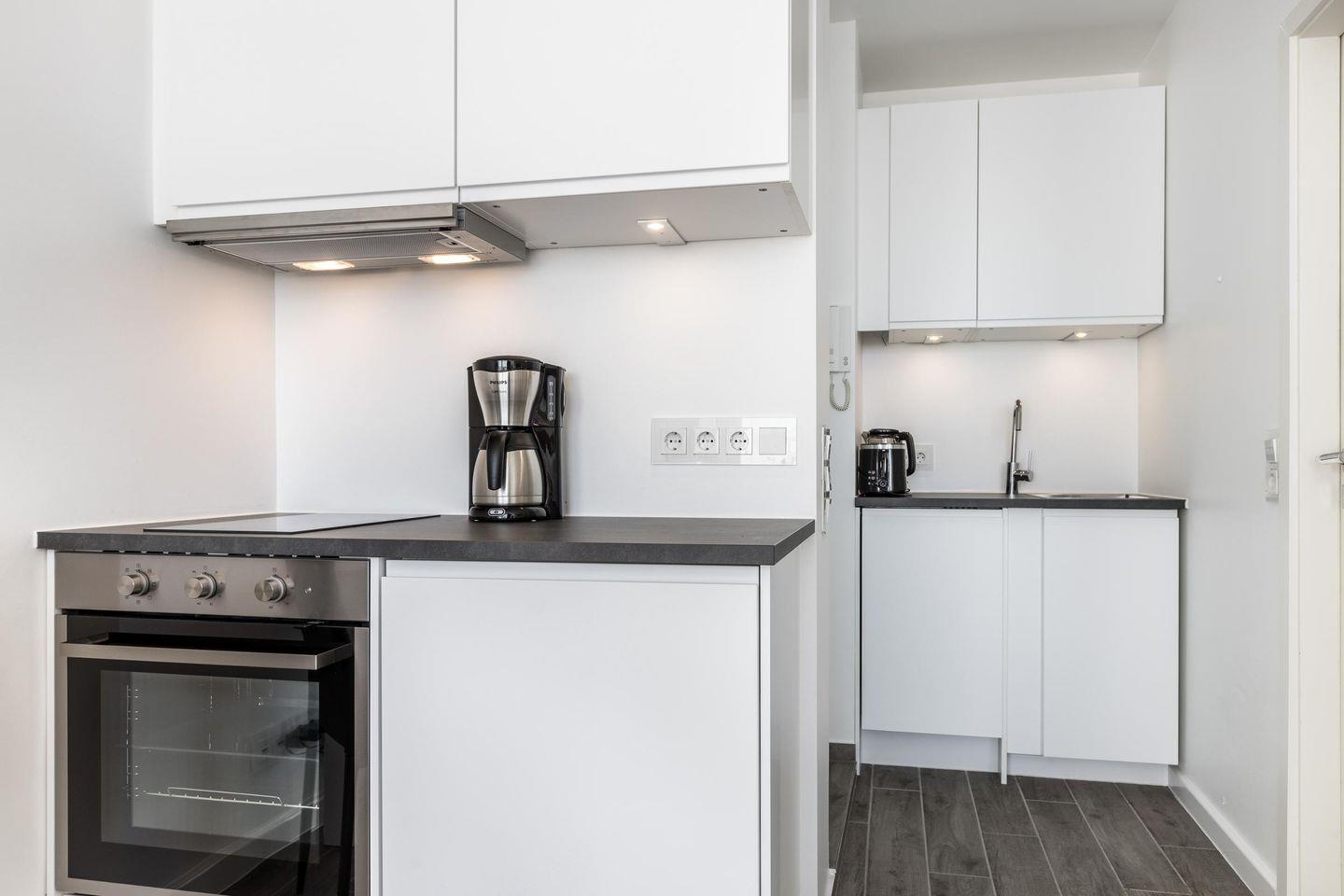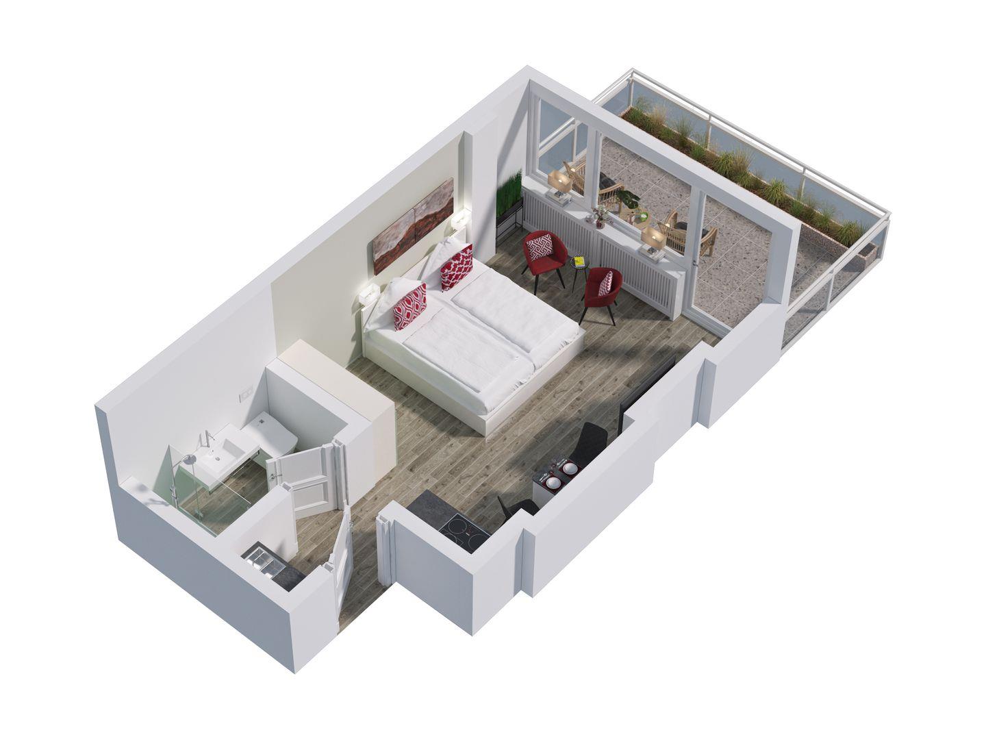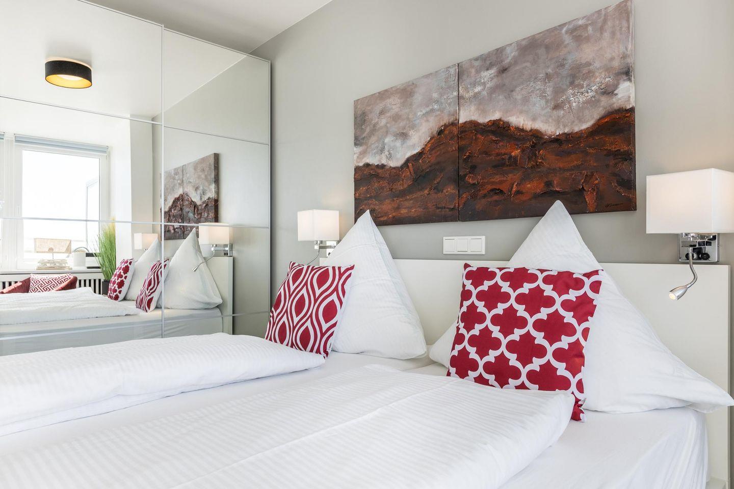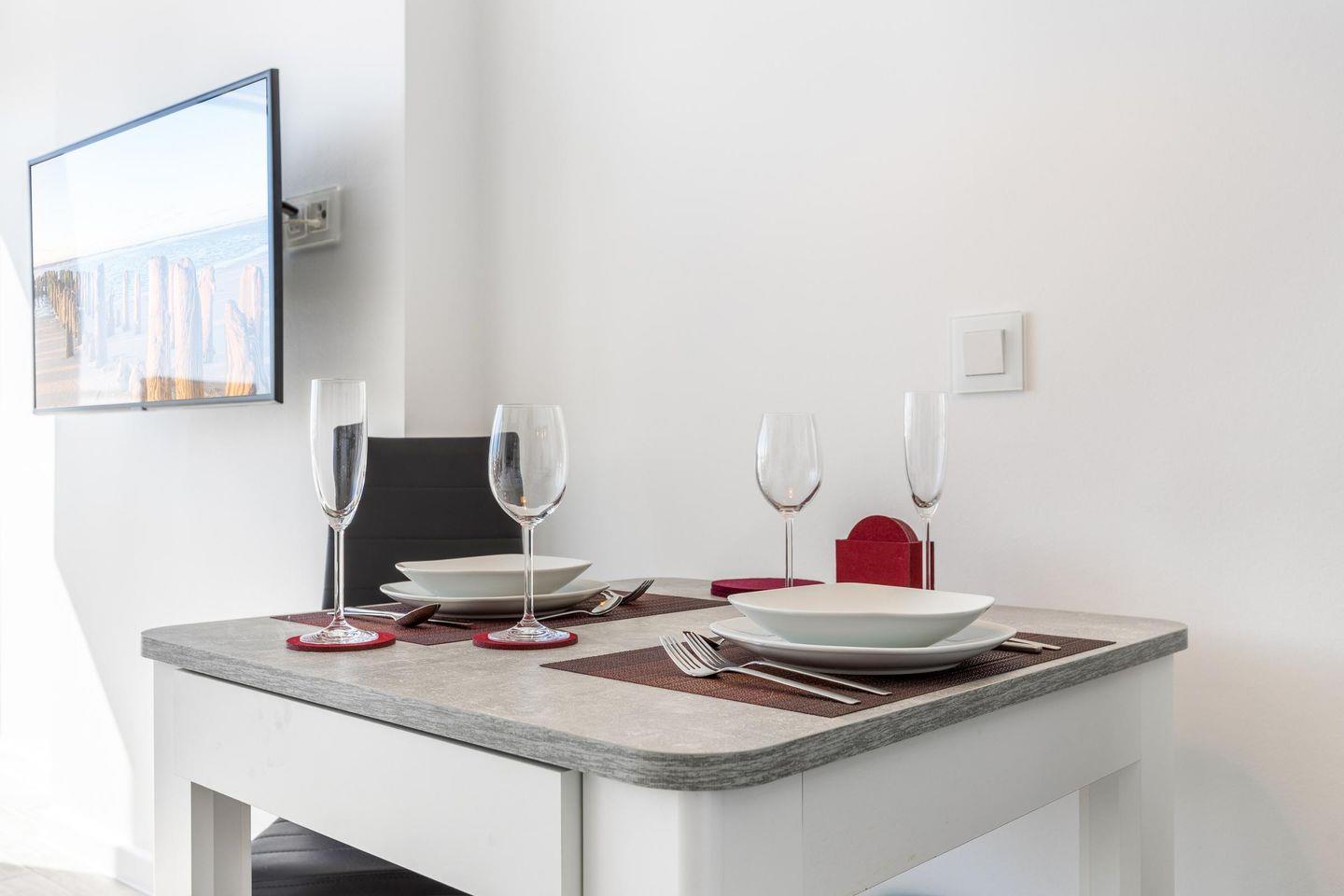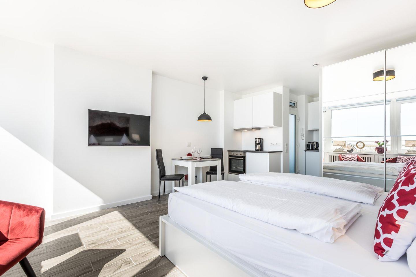 Dieses moderne Einzimmerappartement für bis zu 2 Personen befindet sich im 7. Stock und bietet Ihnen eine hochwertige Ausstattung sowie höchsten Komfort. Die offene Küche samt Geschirrspüler ist voll ausgestattet. Der angrenzende Wohn- und Schlafbereich mit Doppelbett (180x200 cm) und Essecke lädt zur absoluten Entspannung ein. Im Badezimmer erwartet Sie eine großzügige Dusche samt Regenwalddusche. Nutzen Sie gerne den sonnigen Westbalkon samt Meerblick und wetterfesten Balkonmöbeln. Der weitreichende Blick über die Friedrichstraße vom Balkon der Ferienwohnung ist einzigartig. Kostenloses WLAN, ein zugehöriger PKW-Stellplatz (max. Einfahrtshöhe 2,50 m) sowie ein Fahrstuhl (bis in den 6. Stock) sind vorhanden. Haustiere sind erlaubt.