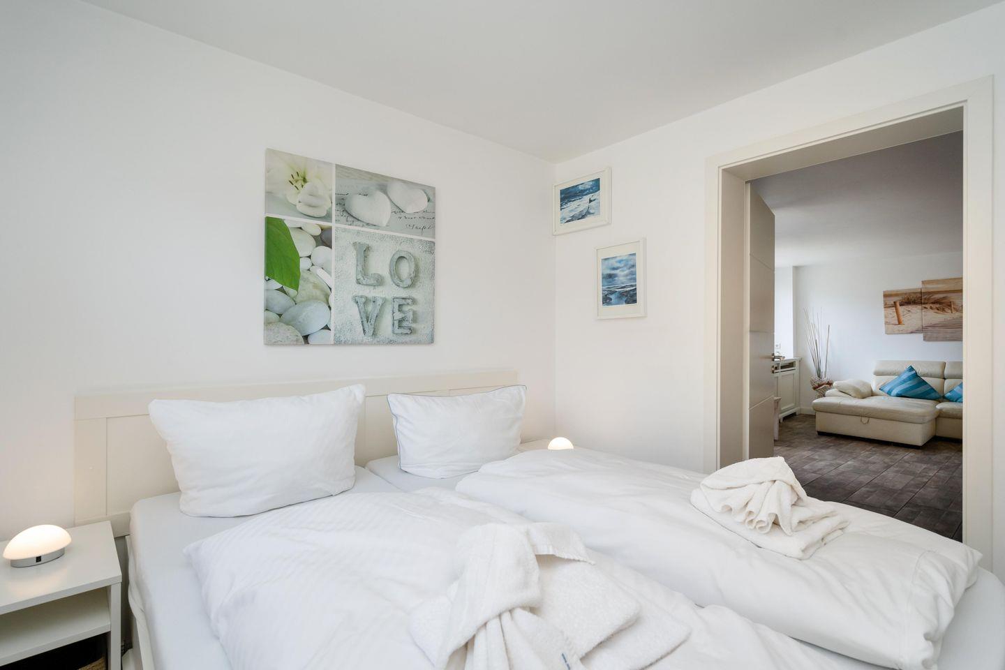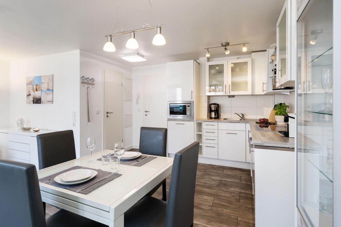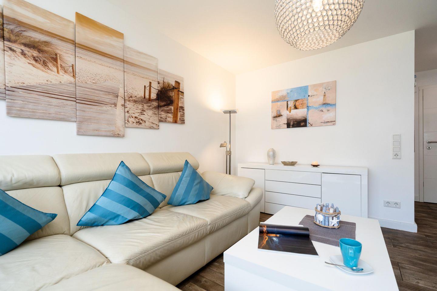 Moderne ca. 49 m² große 2-Zimmer Ferienwohnung für bis zu 2 Pers. mit schönem Westbalkon in stadt- und strandnaher Lage. Inklusive WLAN, zugehörigem Tiefgaragenstellplatz sowie Fahrstuhl.