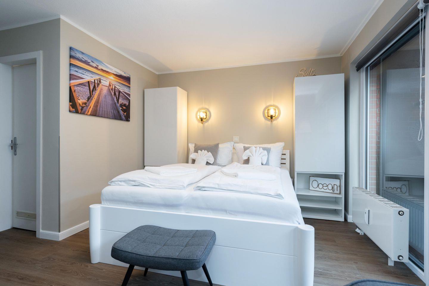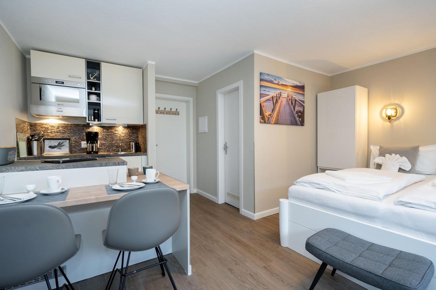 Dieses moderne 1-Zimmer Appartement für bis zu 2 Personen bietet Ihnen eine schicke, in warmen Tönen getauchte Atmosphäre. Es erwartet Sie eine offene, voll ausgestattete Küche mit angrenzendem Wohn- und Essbereich. Dieser ist durch ein komfortables Doppelbett (160 cm) sowie eine gemütliche Essecke ausgestattet. Das Badezimmer verfügt über eine Dusche und ist modern gestaltet. Nutzen Sie gerne die schöne Terrasse mit Gartenmöbeln und Strandkorb (in der Saison). Kostenloses WLAN, ein zugehöriger PKW-Stellplatz sowie eine gemeinschaftliche Waschmaschine (gebührenpflichtig) stehen Ihnen zur Verfügung. Haustiere sind erlaubt.