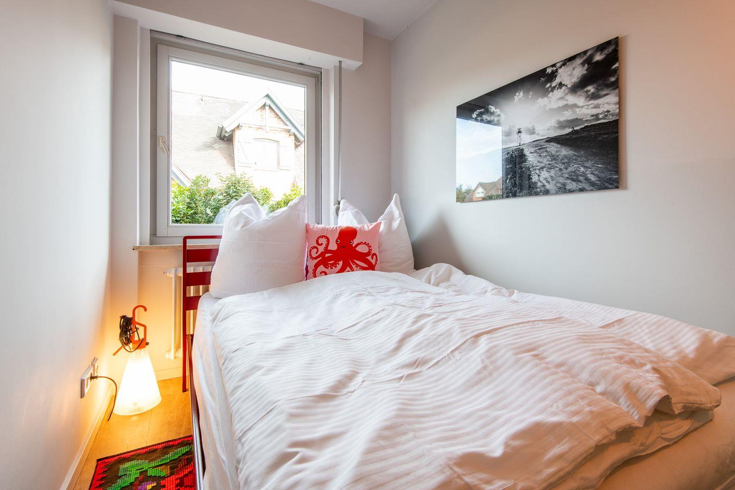 Diese gemütlich eingerichtete ca. 85 m² große Ferienwohnung für bis zu 6 Personen befindet sich in einer direkten Strandlage von Westerland. Es erwartet Sie ein liebevoll eingerichtetes Wohn- und Esszimmer mit angeschlossener Küche. Die Küche samt Geschirrspüler ist gut ausgestattet. Die Ferienwohnung verfügt über ein Doppelschlafzimmer (180 cm) mit angeschlossenem Bad en Suite, einem kleinen Schlafzimmer mit französischem Doppelbett (140 cm) sowie einem Schlafzimmer mit Doppelbett (160 cm). Die zwei Badezimmer verfügen über eine moderne Regenwalddusche sowie Tageslicht. Kostenloses WLAN, eine Waschmaschine sowie ein Wäschetrockner stehen Ihnen zur Verfügung. Haustiere sind willkommen. Für Ihr Auto besteht eine öffentliche Parkmöglichkeit direkt am Grundstück auf der Uthlandstraße. Be- und Entlademöglichkeiten gibt es direkt in der Einfahrt.