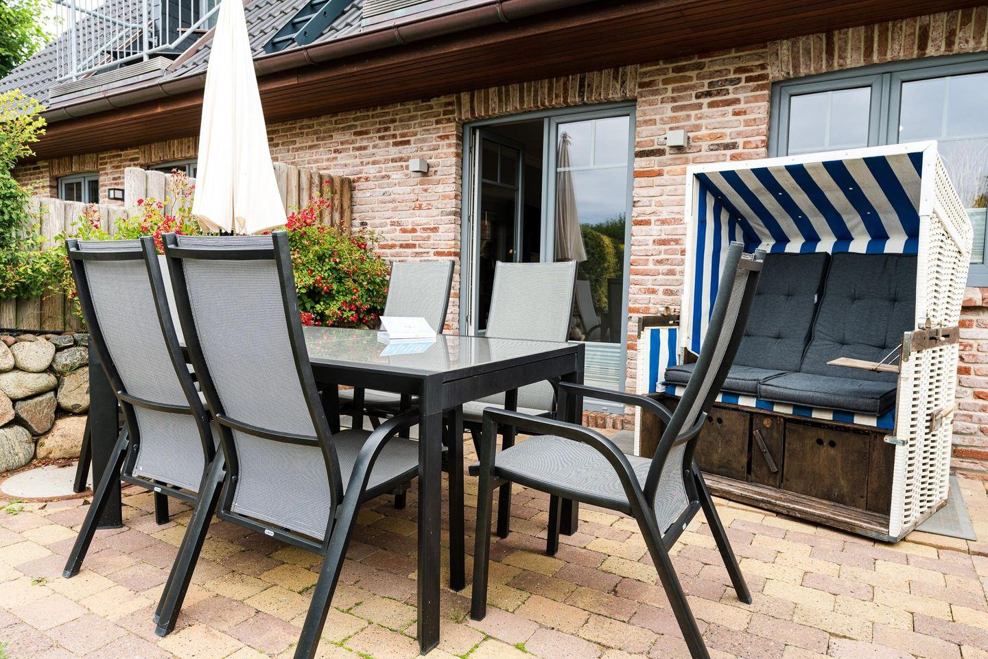 Charmantes Appartement Lille Kamp 1 in Westerland mit Terrasse und Strandkorb für erholsamen Urlaub.