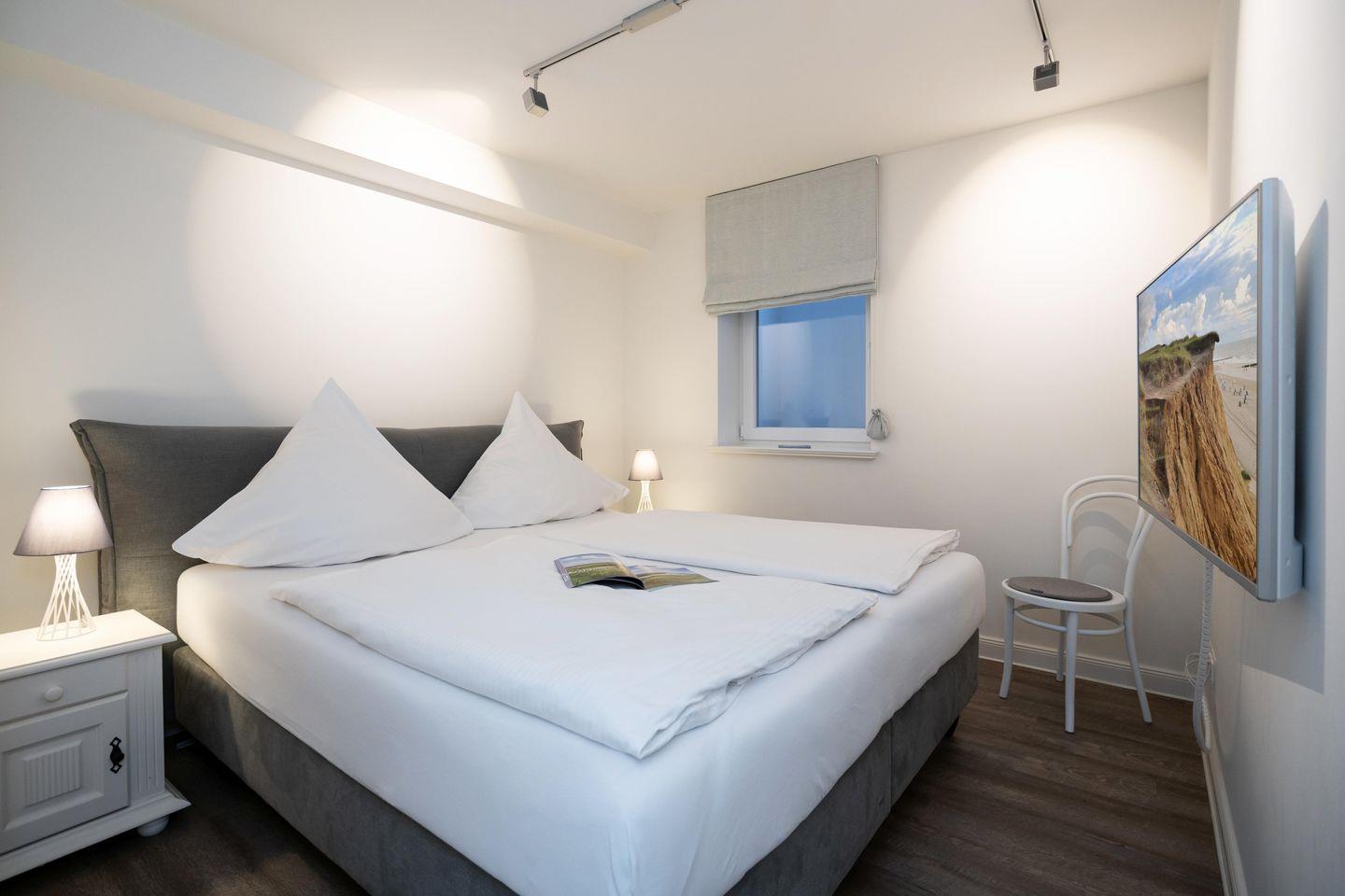 Drei Schlafräume, zwei Bäder und ein großzügiger Wohn- und Essbereich erstrecken sich auf 86,25 qm, garantieren Wohlfühlmomente und sorgen für ein erholsames Urlaubsvergnügen. Im Wohn- und Essbereich befindet sich eine hochwertige Küchenzeile im U-Format, die durch Großzügigkeit und Ausstattung besticht. Hochwertiges Geschirr, edle Töpfe, Kaffee-/Smoothie-Maschinen, Wasserkocher, Toaster, Mixer, Espresso-Maschine, Mikrowelle, Geschirrspüler, Kühl-/Gefrierschrank, Backofen, Getränkekühler und Ceranfeld sind vorhanden. Die drei Schlafräume im Souterrain sind alle mit Ruf-Boxspringbetten ausgestattet, wobei der On Suite Bereich über ein separates Bad inkl. einem Einbauschrank verfügt. Zwei Zimmer teilen sich ein Bad. Die beiden Hauptschlafzimmer sind mit einem Boxspringbett 1,80m x 2,00m ausgestattet, während das dritte Schlafzimmer über 2 Einzelbetten, die zusammengestellt werden können, verfügt.