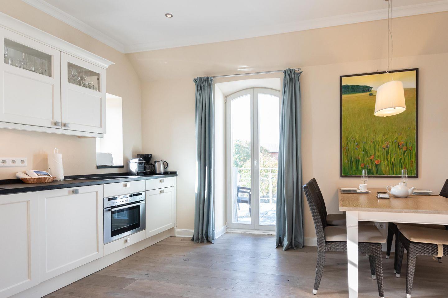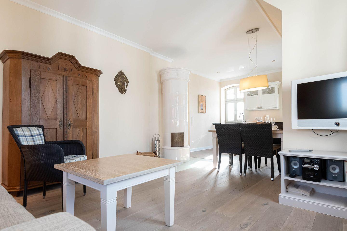 Wohn-/Koch-/Ess-/Schlafbereich: Die helle Küche lässt keine Wünsche offen. In dem modernen Wohnzimmer befindet sich ein herrlicher Kaminofen und ein TV für gemütliche Stunden. Das hochwertige Sofa bietet in Sekundenschnelle eine Schlafstätte für 2 Personen. Zur Sonnenseite ausgerichtet befindet sich der großflächige Süd/ Westbalkon mit edlen Gartenmöbeln und einem Sonnenschirm.