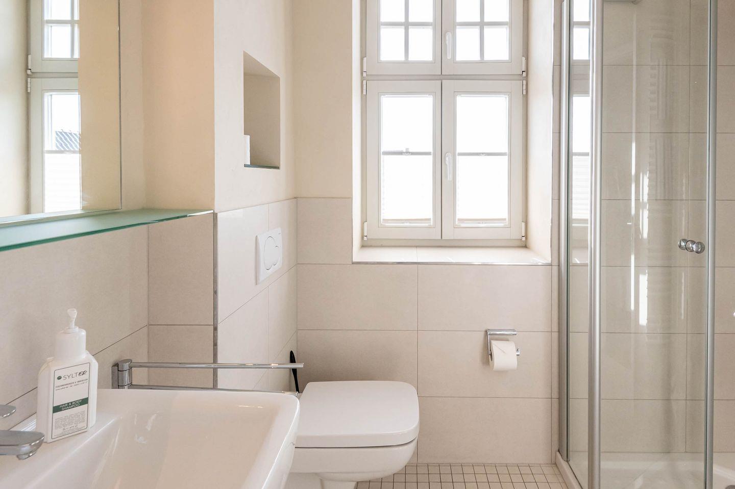 Badezimmer: Modernes Duschbad mit WC und Fenster.