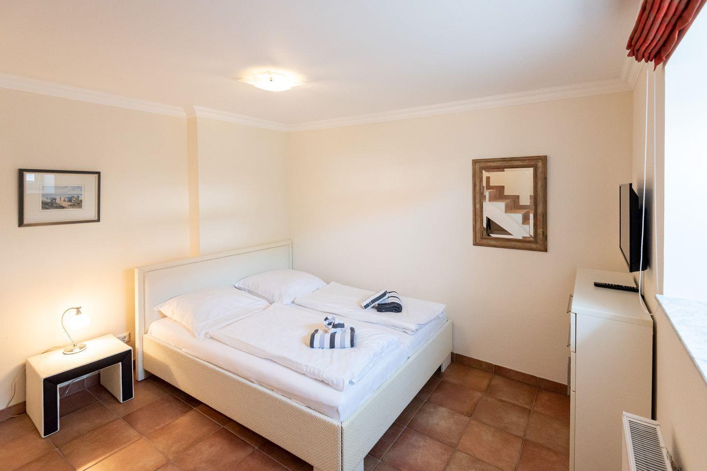 Schlafzimmer 1: Geräumiges Doppelbettzimmer mit viel Stauraum, einem TV und Fenster.
