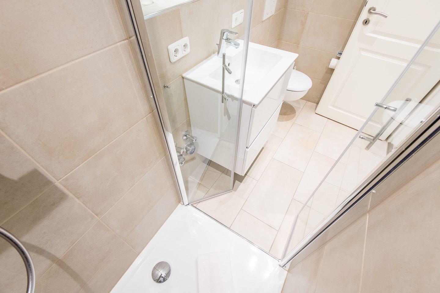 Badezimmer: Modernes und neu renoviertes (April 2021) Duschbad mit WC.
