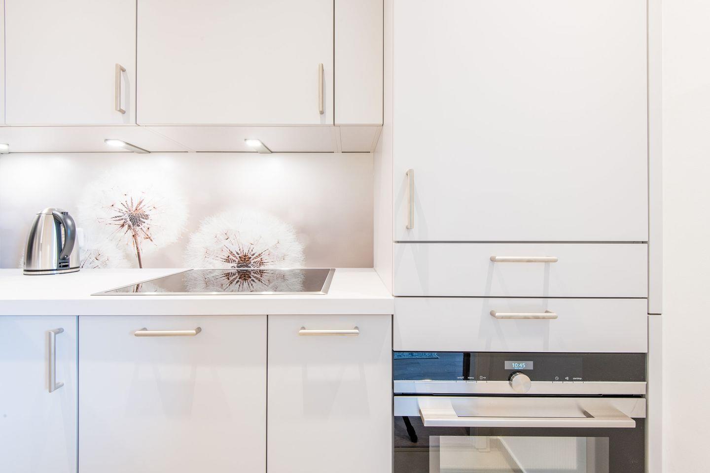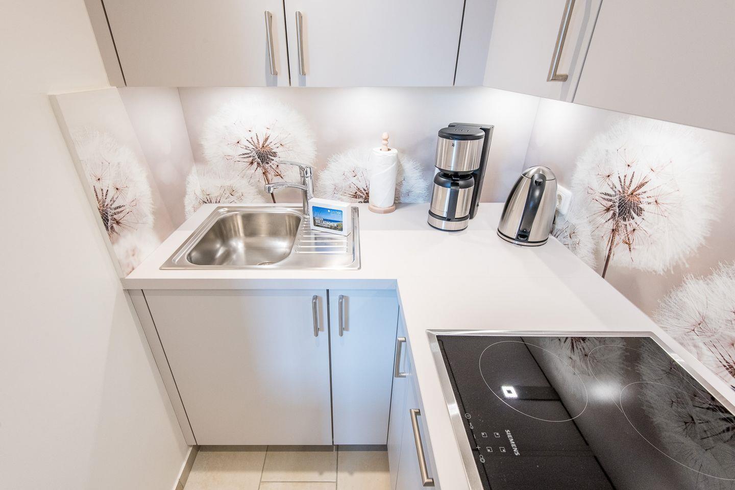 Küche: Komplett neu renovierte und gut ausgestattete kleine Küchenzeile mit Backofen in einem separaten Raum.