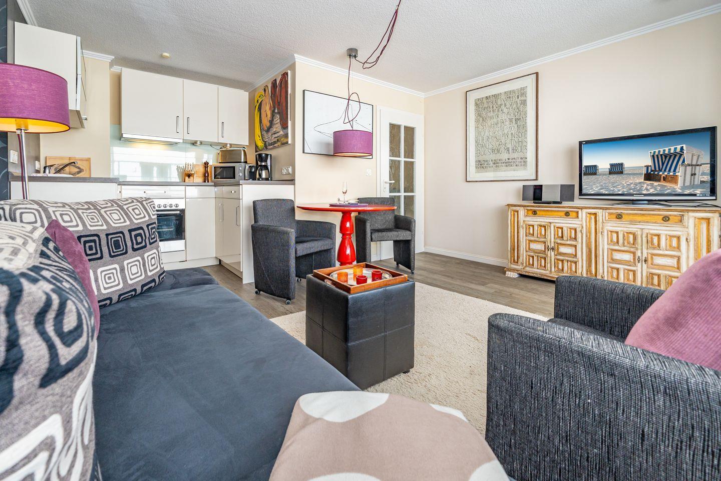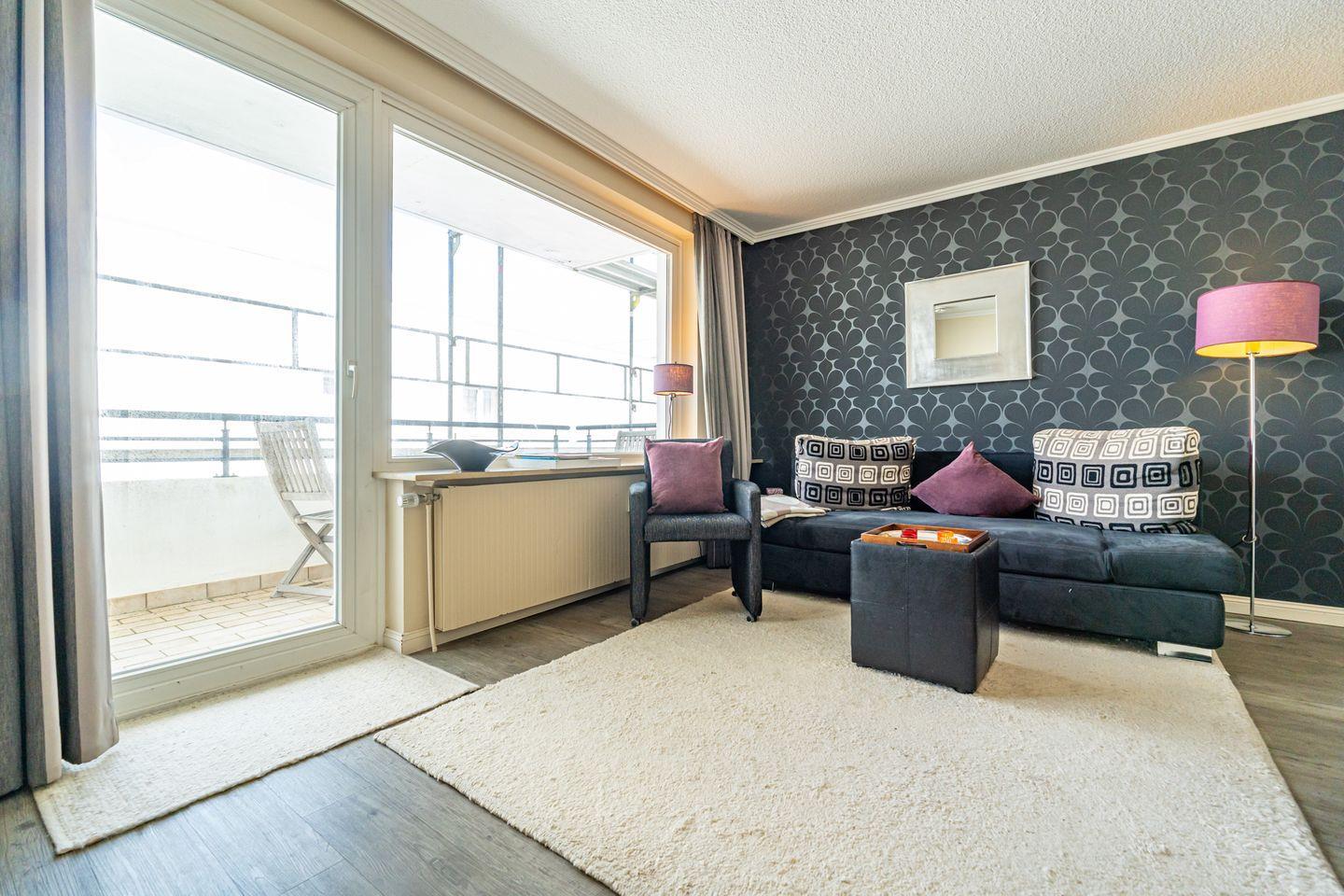 Modernes 2-Zimmer-Appartement in Westerland mit Balkon, offener Küche und Garage, ideal für erholsame Tage zu zweit.