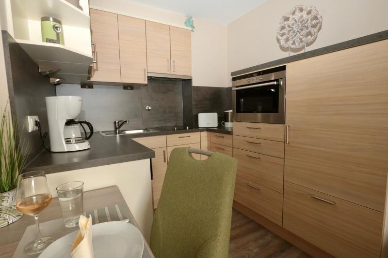 Die offene Küche ist voll ausgestattet und bietet Ihnen sämtliche technischen Geräte für einen entspannten Aufenthalt: Ceranherd, Backofen, Mikrowelle, Kühlschrank mit Gefrierfach, Spülmaschine, Kaffeemaschine, Wasserkocher, Toaster und Eierkocher stehen Ihnen ebenso zur Verfügung wie ausreichend Geschirr und Besteck. Der Essbereich schließt sich nahtlos an die Küche an und lädt zu gemeinsamen Mahlzeiten ein.