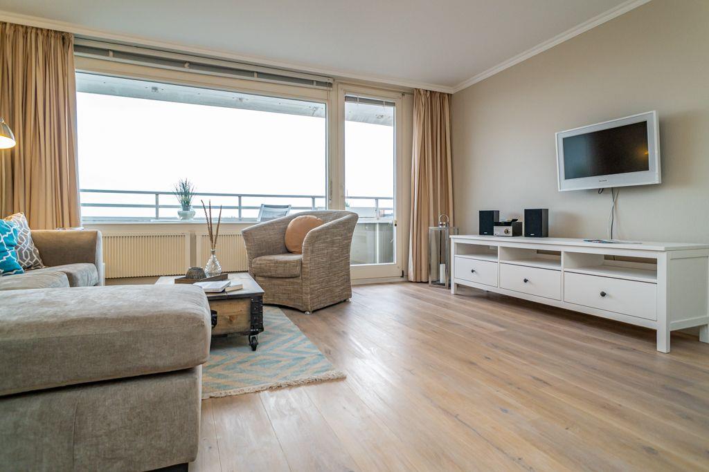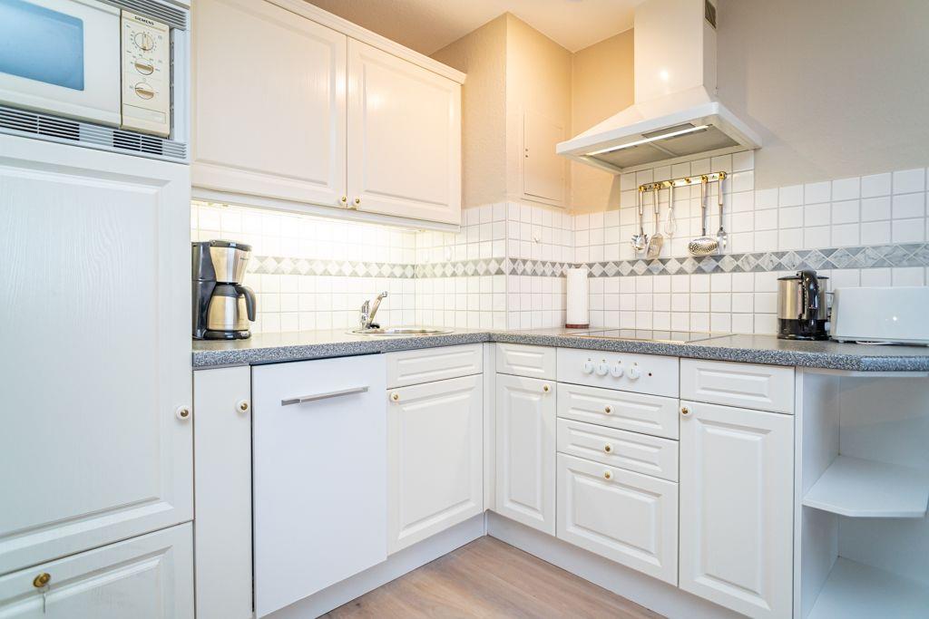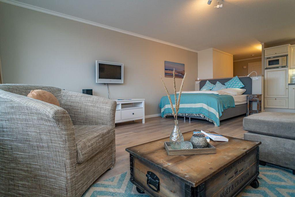 Großzügiger Wohn- und Schlafbereich mit Doppelbett (170x200cm) für bis zu 2 Personen sowie Sitzecke mit Sessel und TV. In der Wohnung ist edler Echtholzboden verlegt. Direkter Zugang zum Balkon mit Ausrichtung nach Osten. Genießen Sie den Ausblick über Westerlands Dächer. Offene Einbauküche mit Tisch und zwei Stühlen als gemütliche Essecke. Mikrowelle, Geschirrspüler Cerankochfeld und der übliche Komfort.