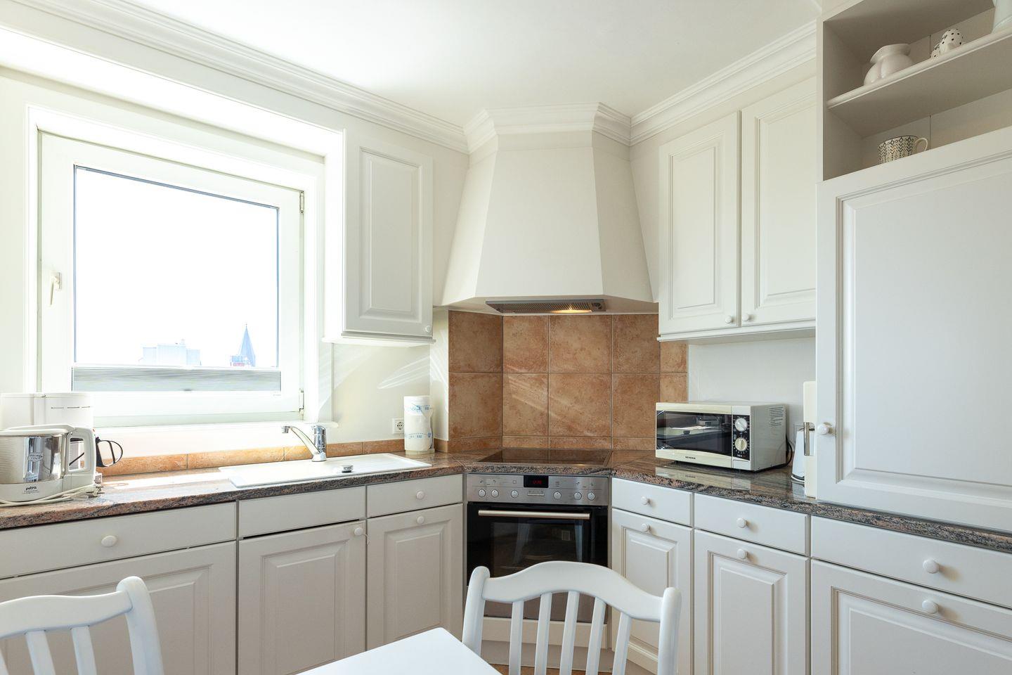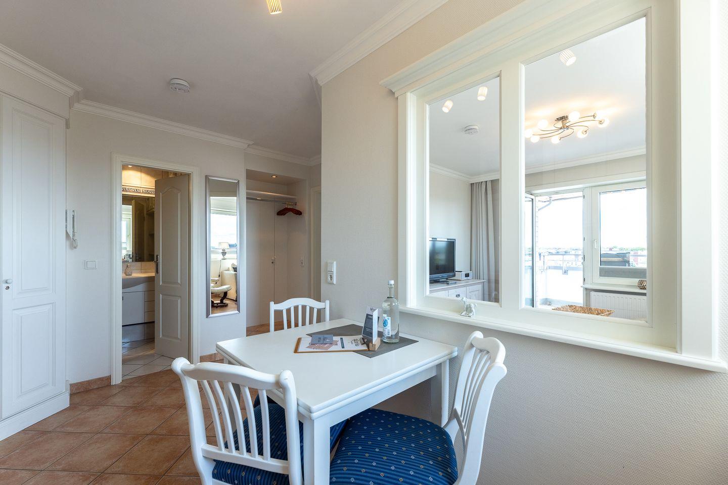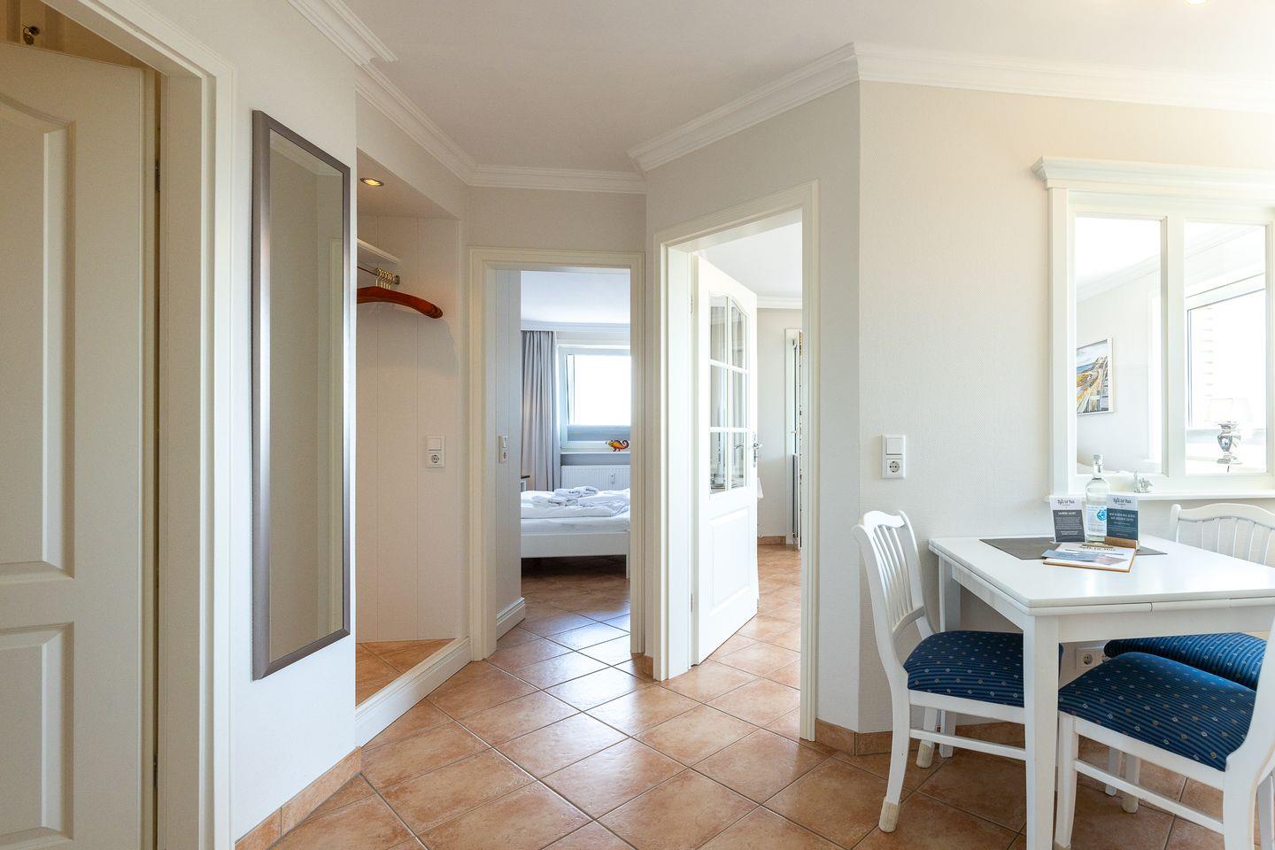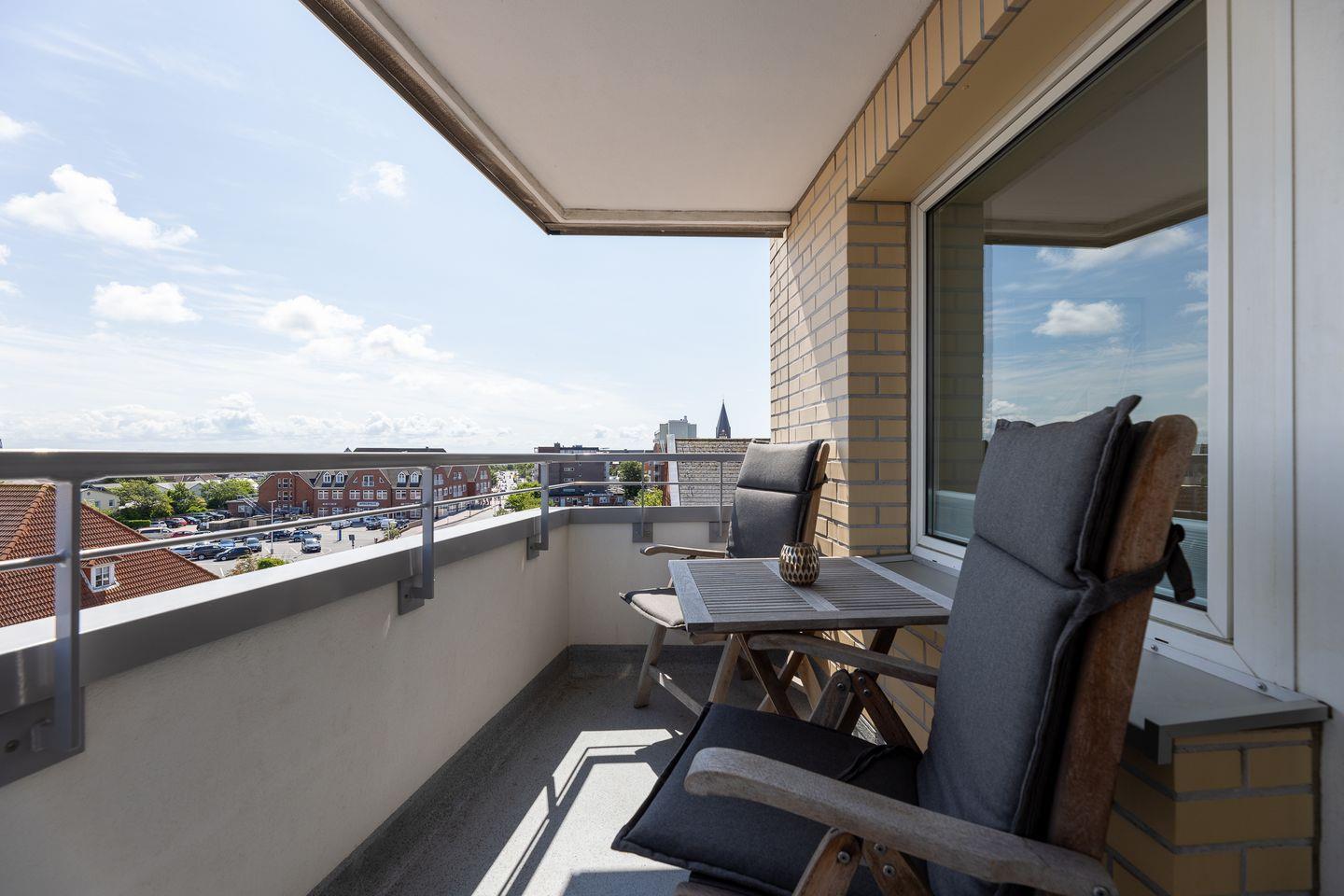 Helle Farben treffen auf hochwertige Einrichtungselemente und ergeben so einen erholsamen Rückzugsort, inmitten von Westerland. Im Wohnzimmer laden neben der Couch gleich zwei ultra bequeme Sessel zum Lesen und Fernsehen ein, während der Balkon (Ost) zum Frische-Luft-Schnuppern einlädt. Die separate Küche hat neben ihrer umfassenden Ausstattung auch einen kleinen Esstisch zu bieten und auch das ganz in Weiß gehaltene Duschbad lässt nichts vermissen.