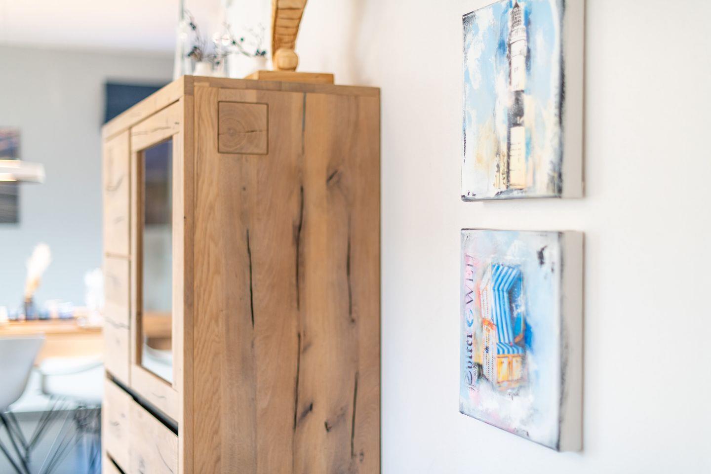 Das lichtdurchflutete Wohnzimmer ist stilvoll eingerichtet und lädt mit komfortablen Sofas und einem LED-TV zu entspannten Stunden ein. Der Essbereich, der sich harmonisch in den Wohnraum einfügt, bietet Platz für gemeinsame Mahlzeiten. Von hier aus haben Sie direkten Zugang zur möblierten Südterrasse mit Strandkorb und einem gepflegten Garten – ideal für sonnige Stunden und laue Abende in privater Atmosphäre.