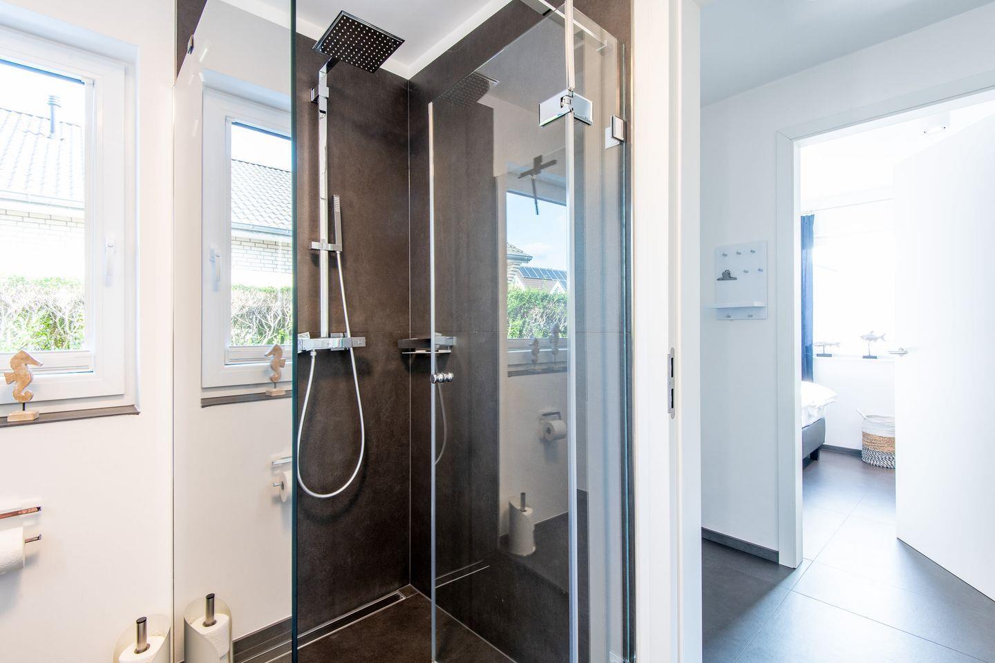 Das elegante Badezimmer ist mit einer ebenerdigen Rainshower-Dusche, WC, Handtuchheizkörper, Föhn und integriertem Radio ausgestattet – ideal für einen erfrischenden Start in den Tag oder entspannte Abendmomente.