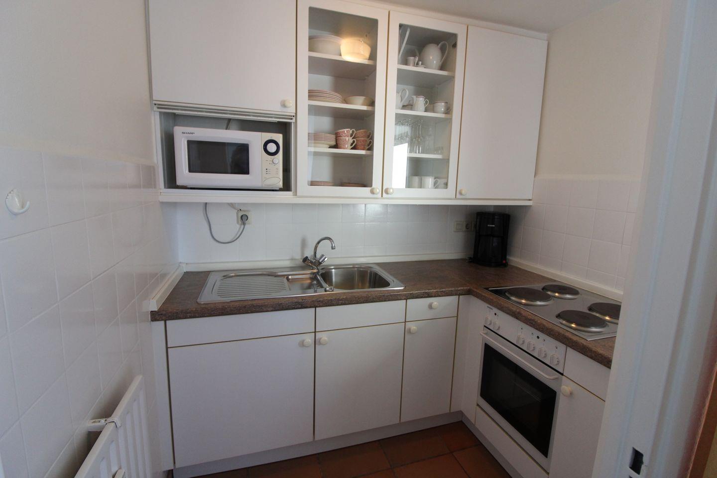 • Küche: Kleine Küche mit Fenster, Kochfeld, Mikrowelle, Kühlschrank mit Gefrierfach