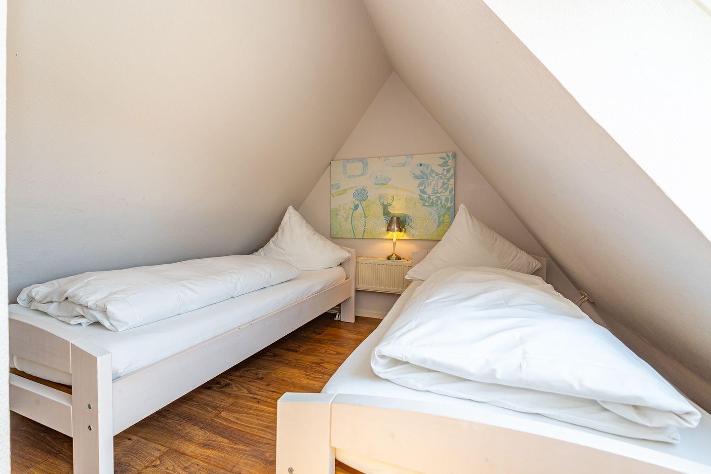 Die Ferienwohnung 2 im Haus Strandberg erstreckt sich über zwei Ebenen (OG und DG) und bietet ausreichend Platz für bis zu 4 Personen. Im OG befinden sich ein Duschbad mit WC, eine offene Küche (Mikrowelle, Geschirrspüler, Nespressomaschine) mit Essbereich, ein Schlafzimmer mit einem Doppelbett sowie der Wohnbereich, der mit einem Fernseher ausgestattet ist. Vom Wohnbereich führt eine Treppe ins DG, wo sich das zweite Schlafzimmer mit zwei Einzelbetten befindet. Im Sommer stehen Ihnen im Gemeinschaftsgarten 2 Strandkörbe zum Sonnenbaden zur Verfügung. Der Garten kann von allen 3 Parteien des Hauses genutzt werden. Die Ferienwohnung verfügt über einen WLAN-Anschluss. Kostenfreie Parkmöglichkeiten finden Sie an der Straße direkt am Haus. Ein guterzogener Hund ist nach vorheriger Anmeldung erlaubt (10,- € pro Tier/Tag).