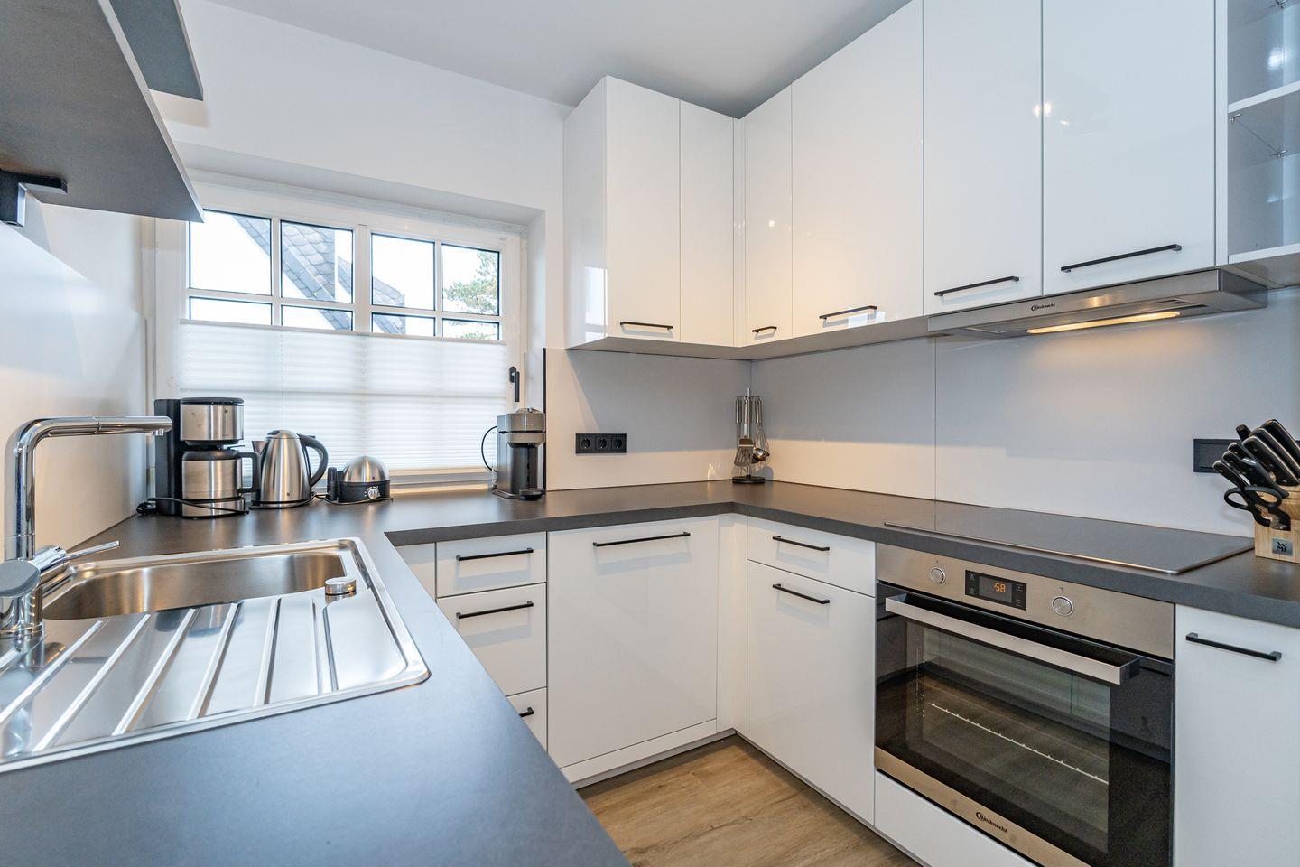Sie bietet Platz für bis zu 3 Personen. Die ca. 65 qm Wohnfläche verteilen sich auf zwei Ebenen. Im EG befinden sich die offen gestaltete Küche mit angrenzendem Essbereich und das gemütliche Wohnzimmer. Im Wohnzimmer steht Ihnen ein Flachbildfernseher zur Verfügung. Die Ausstattung (Backofen, Spülmaschine, Cerankochfeld, Kaffeemaschine, Nespresso Maschine, Toaster, Wasserkocher) der hochwertigen Küche lässt keine Wünsche offen. Vom Wohnzimmer gelangt man auf die Terrasse mit Strandkorb und Gartenmöbeln, die zum Verweilen einlädt. Im Souterrain befinden sich ein Schlafzimmer mit Einzelbett (90 x 200 cm) und TV, ein Schlafzimmer mit Doppelbett und TV, ein Gäste-WC und das Bad mit bodentiefer Dusche und WC.