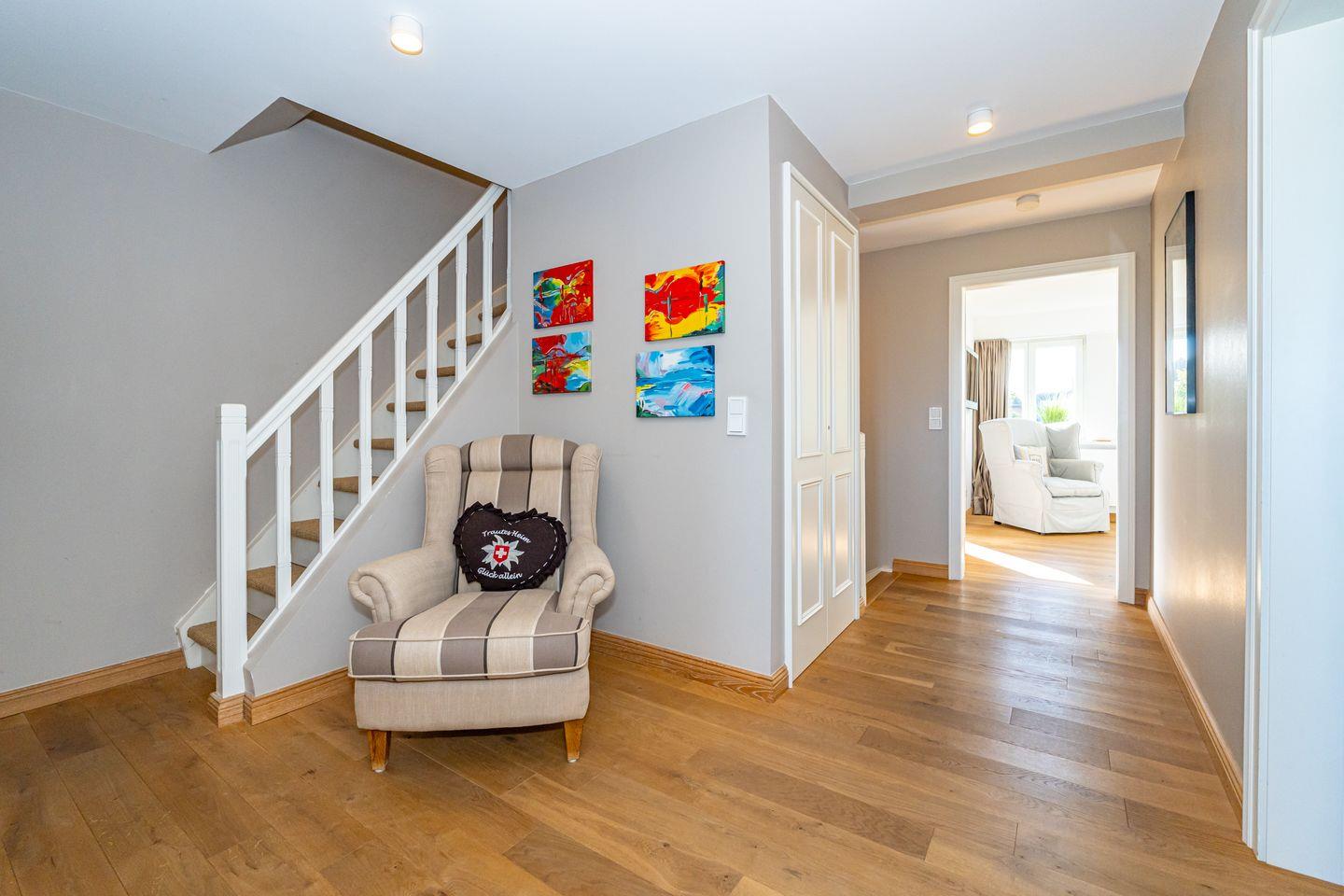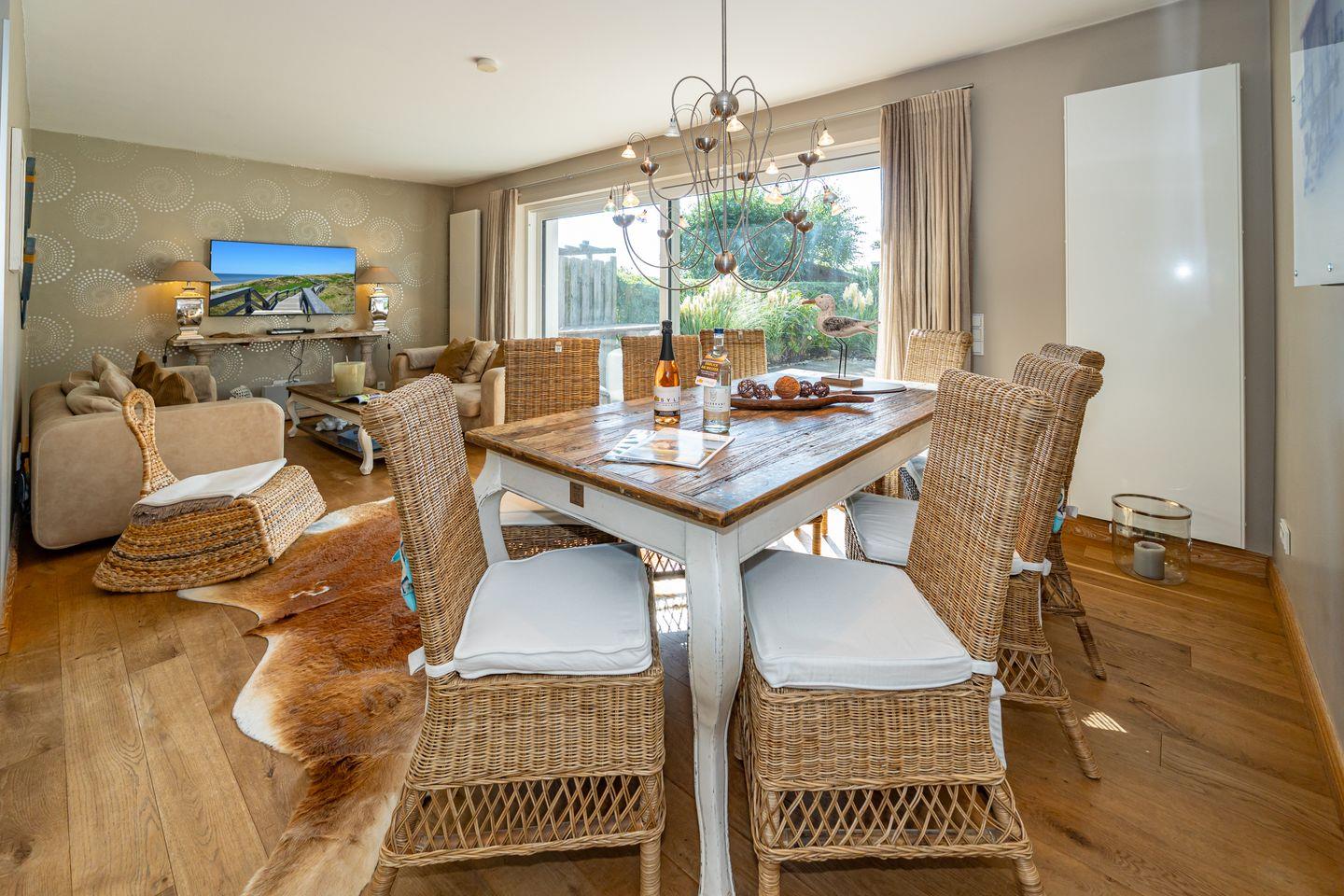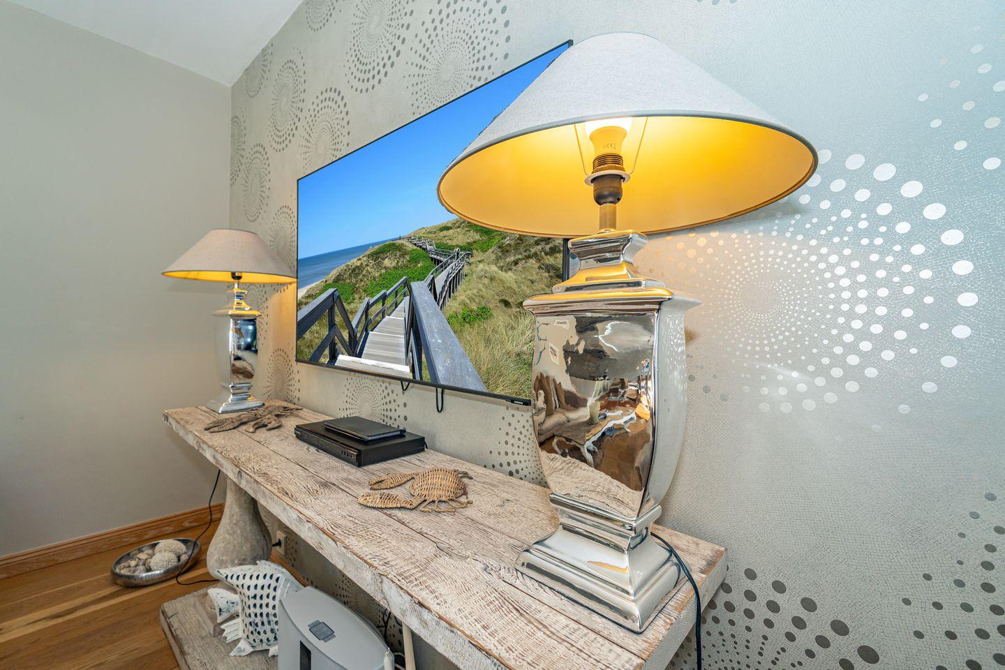 Im Süden von Westerland liegt dieses großzügige und luxuriöse Mittelhausteil über drei Ebenen (ca. 180 qm). Die Ausstattung lässt alle Gästeherzen höher schlagen: sehr schöne Farben, Stoffe und geschmackvolle Möblierungen schaffen ein luxuriöses Ambiente für unsere Gäste. Lassen Sie sich von Flamant & Riviera Maison Möbeln, tollen Wohlfühlbäder und wertigen Detaillösungen verzaubern. Im EG befinden sich der Flur über den Sie zum sehr schön gestalteten Wohn-/ Essbereich mit Flatscreen und gemütlicher Essgruppe sowie zu der offen gestalteten Küche mit Tresenblock, Backofen und Weinklimaschrank gelangen. Von hier aus haben Sie direkten Zugang zur schön angelegten Terrasse mit Gartenmöbeln (April bis Oktober) und eingezäuntem Garten. Ebenfalls im Erdgeschoss liegt das erste von vier Schlafzimmern mit Doppelbett (160 x 200 cm), großem Einbauschrank und Flat-TV sowie das mit Bad mit bodentiefer Dusche, WC, Waschmaschine und Trockner. Im OG erwarten Sie zwei weitere Schlafzimmer, jeweils mit Doppelbett (180 x 200 cm), sehr schönen Tischlereinbauten mit viel Stauraum und Flat-TV. Gleich zwei Wellness- Bäder verwöhnen Sie auf dieser Etage, eines davon mit Dusche/ WC, das andere Bad hält eine Wanne und WC für Sie bereit. Das Dachgeschoss beherbergt das vierte Schlafzimmer mit einem kuschligen Himmelbett (180 x 200 cm), als auch dem vierte Bad mit Dusche und WC. Als Highlight des Hauses befindet sich im obersten Stockwerk eine Sauna, die nicht nur an kälteren Tagen zum Entspannen einlädt. Direkt vor der Haustür beginnen weitläufige Wiesen. Ein Pkw-Stellplatz befindet sich direkt am Haus. Der WLAN-Zugang steht unseren Gästen kostenlos zur Verfügung. Ein gut erzogener Hund ist nach Anmeldung im Winterhuus ein gern gesehener Gast (10,- € pro Tier/Tag).