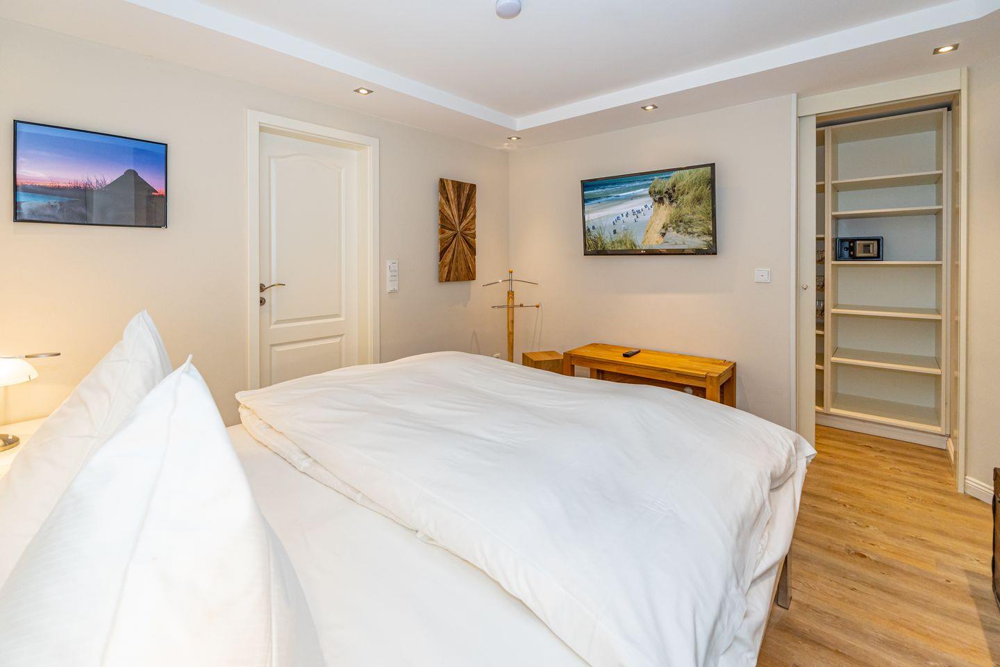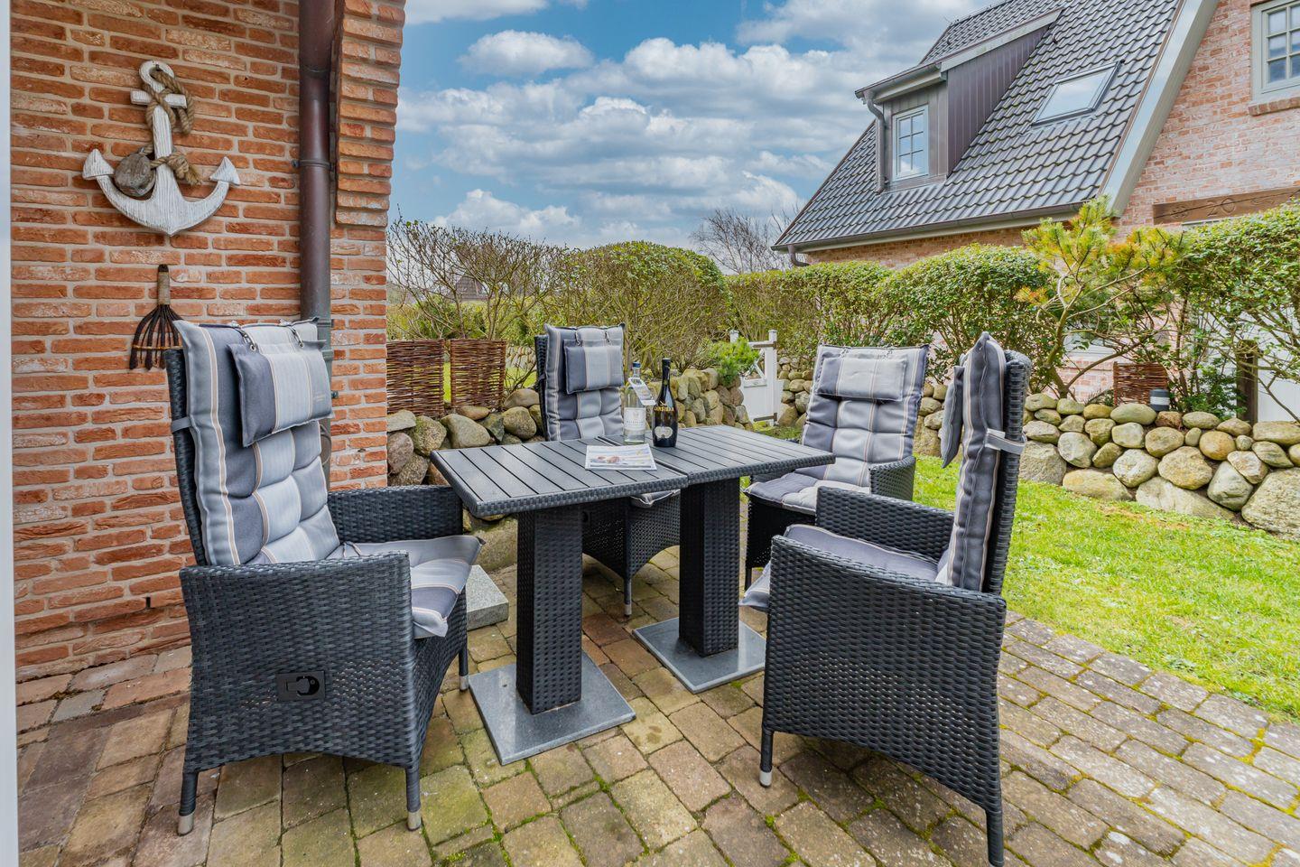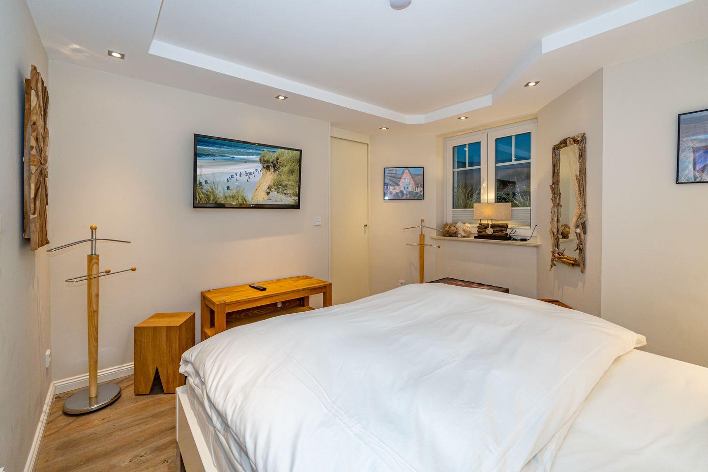 Diese 3- Zimmer-Ferienwohnung, mit eigenem Eingang (ca. 76 qm) liegt an der Ortsgrenze von Westerland und Wenningstedt. Ein Bäcker, ein Supermarkt, ein Fahrradverleih und eine Bushaltestelle sind fußläufig sehr gut zu erreichen. Im EG erwarten Sie ein modernes Wohn- / Esszimmer (Flachbild-TV), welches zum Beisammensitzen einlädt. Im Wohnzimmer befindet sich ein elektrischer Kamin der eine kuschelige Atmosphäre verbreitet. Von dort aus haben Sie den Zugang zu der Süd / West- Terrasse, wo Sie in gemütlichen Gartenstühlen und im Strandkorb die Sonne genießen können. Die Terrasse ist komplett von einem Friesenwall umgeben. Ebenfalls im Erdgeschoss zu finden ist eine komplett und hochwertig ausgestattete, offene Küche mit einer Filterkaffee / Kaffeepadmaschine und ein modernes Gäste- WC, mit Dusche und Handtuchheizkörper. Ein kombinierter Waschtrockner befindet sich im Abstellschrank im EG. Im Souterrain befinden sich zwei Schlafzimmer mit je einem Flatscreen, Doppelbetten je 180 cm x 200 cm und große Einbauschränke. Eines der beiden Schlafzimmer verfügt über einen begehbarem Kleiderschrank mit Safe. Das moderne Duschbad/ WC/ Handtuchheizkörper verfügt über eine Sauna, die nicht nur an kalten Tagen zum Entspannen einlädt.