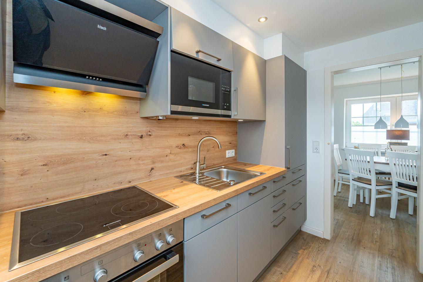 Die Ferienwohnung verteilt sich über zwei Ebenen. Durch den eigenen Eingang gelangen Sie in den Flur des Erdgeschosses. Neben der komplett ausgestatteten Küche (Nespessomaschine, Kaffeemaschine, Geschirrspüler, Backofen) ist die Wohnung mit einem angrenzenden, separaten Esszimmer ausgestattet.
