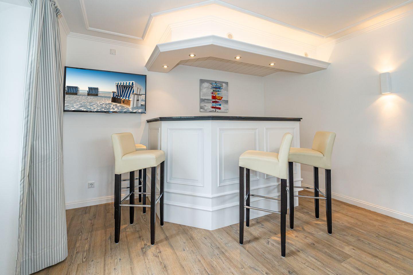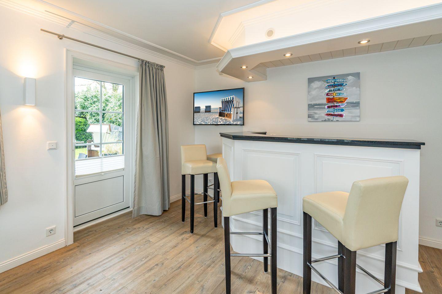 Über einen Flur mit Gäste-WC gelangen Sie in den Wohnraum mit Bar-Tresen und Flachbild-TV. Von hier aus haben Sie Zugang zur Terrasse und Strandkorbplatz. Vom Flur aus führt eine Treppe ins Souterrain, wo sich die beiden gemütlichen Schlafzimmer, jeweils mit Flachbild-TV, befinden. Auf dieser Ebene liegen zudem ein WC und ein Bad mit ebenerdiger Dusche/WC. Eine Münzwaschmaschine und -trockner befinden sich zur gemeinschaftlichen Nutzung im Nebengebäude.