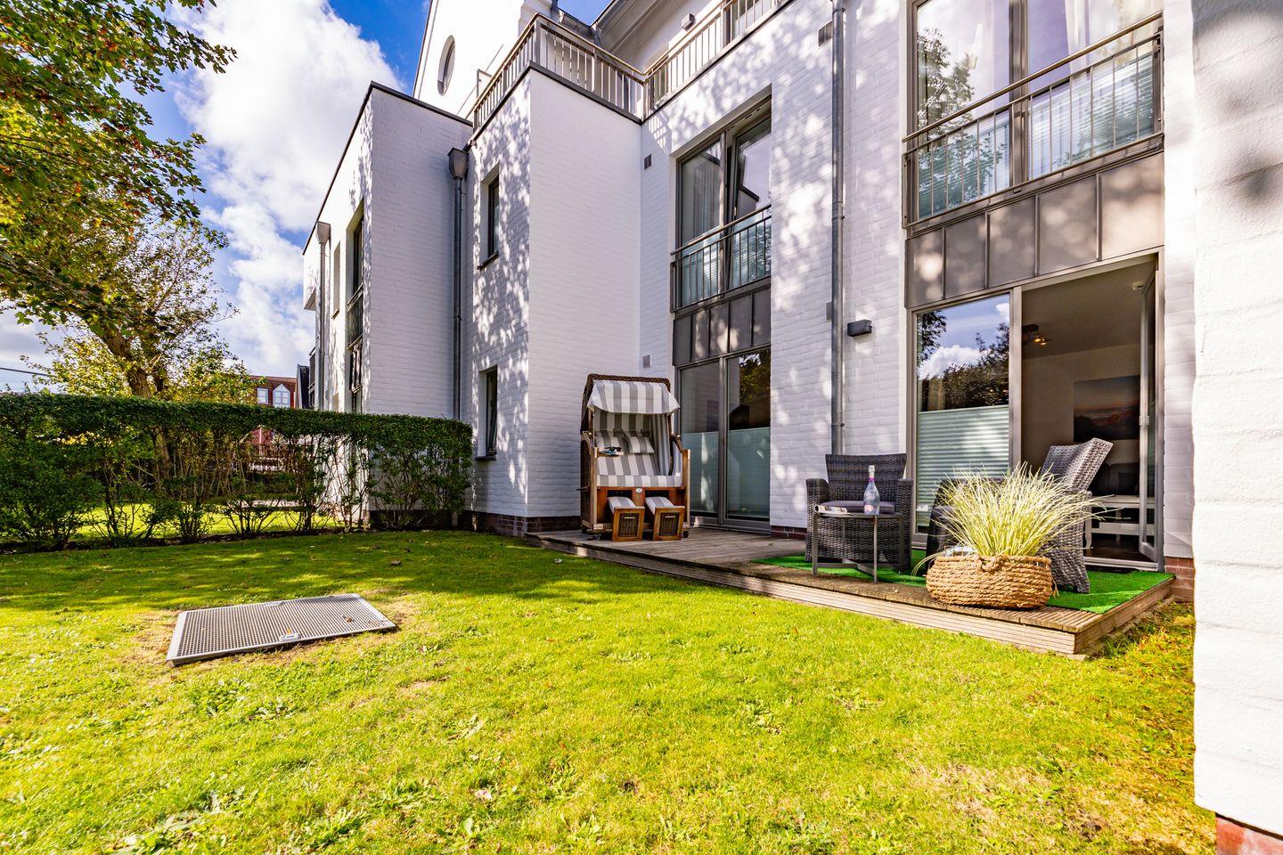 Die Stadtresidenz Nr. 4 in Westerland bietet auf 78 m² eine komfortable Ferienwohnung mit zwei Schlafzimmern, einer Kochnische und einer Terrasse mit Gartenblick. WLAN, TV und eine moderne Ausstattung gehören ebenso dazu wie ein Privatparkplatz. Nur 700 m vom Sandstrand entfernt, sind Einkaufsmöglichkeiten und Restaurants fußläufig erreichbar. Haustiere sind bis zwei erlaubt, Kinder willkommen.