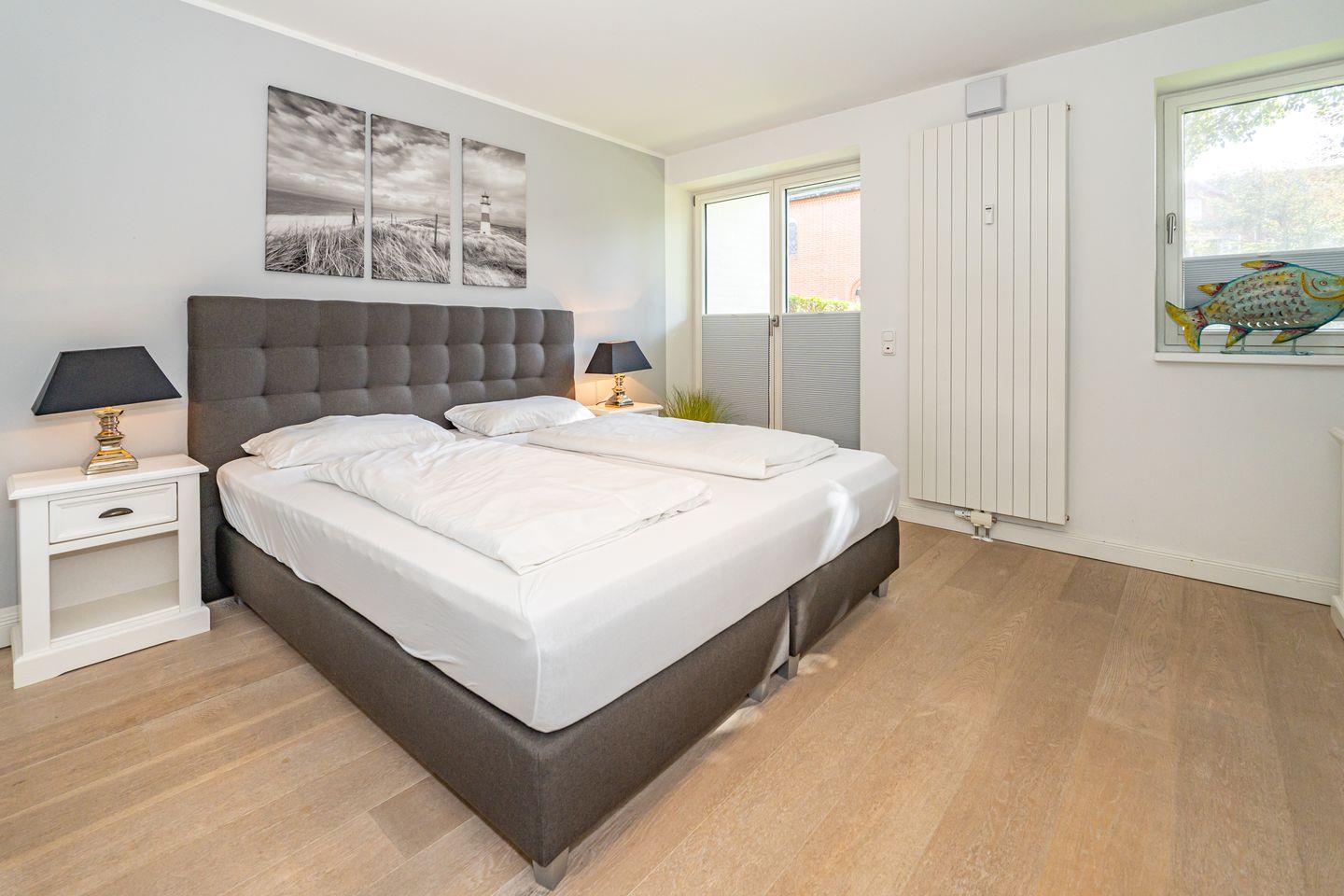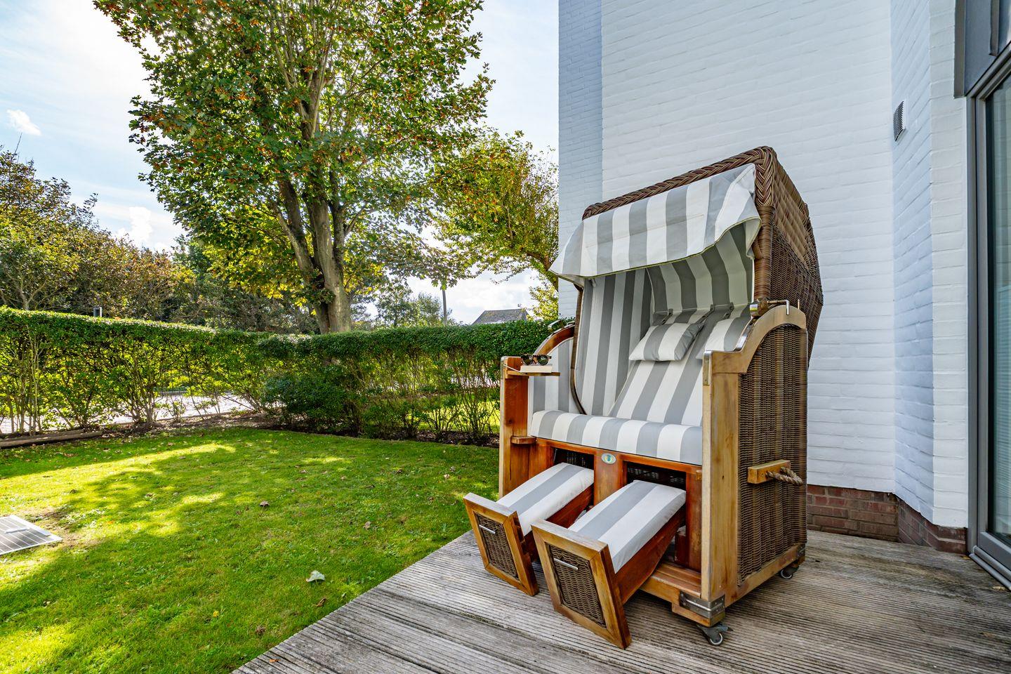 Diese 3-Zimmer-Ferienwohnung (78 qm) befindet sich in einem Gebäude mit 22 Wohneinheiten. Die ebenerdige Ferienwohnung im Erdgeschoss besticht durch den großen, geräumigen Flur mit Einbaugarderobe und dem hellen, großzügigen Wohnzimmer mit Flachbildschirm und Esstisch. Die komplett ausgestattete und offene Küche (Mikrowelle, Kaffeefiltermaschine, Kühlschrank, Cerankochfeld, Backofen) ist direkt durch einen großen Durchgang vom Wohnzimmer aus zu erreichen. Von dort gelangen Sie in den Abstellraum, dort stehen Ihnen Waschmaschine und Trockner zur Verfügung. Das Badezimmer verfügt über einen Handtuchtrockner und eine bodentiefe Dusche. Abgerundet wird die Wohnung mit einer Terrasse (Süd-West-Ausrichtung), welche vom Wohnzimmer aus zu betreten ist und mit einem kleinen Gartenanteil umrundet wird. Ihnen stehen zwei Schlafzimmer mit jeweils Boxspringbett und TV zur Verfügung. Die Ferienwohnung liegt im Herzen von Westerland und ist somit auch sehr Stadt- und strandnah gelegen. In dieser Nichtraucherwohnung sind guterzogene Hunde nach vorheriger Anmeldung erlaubt (10,- € pro Tier/Tag). Ein Pkw-Stellplatz befindet sich in der Tiefgarage (Durchfahrtshöhe max. 2 Meter).