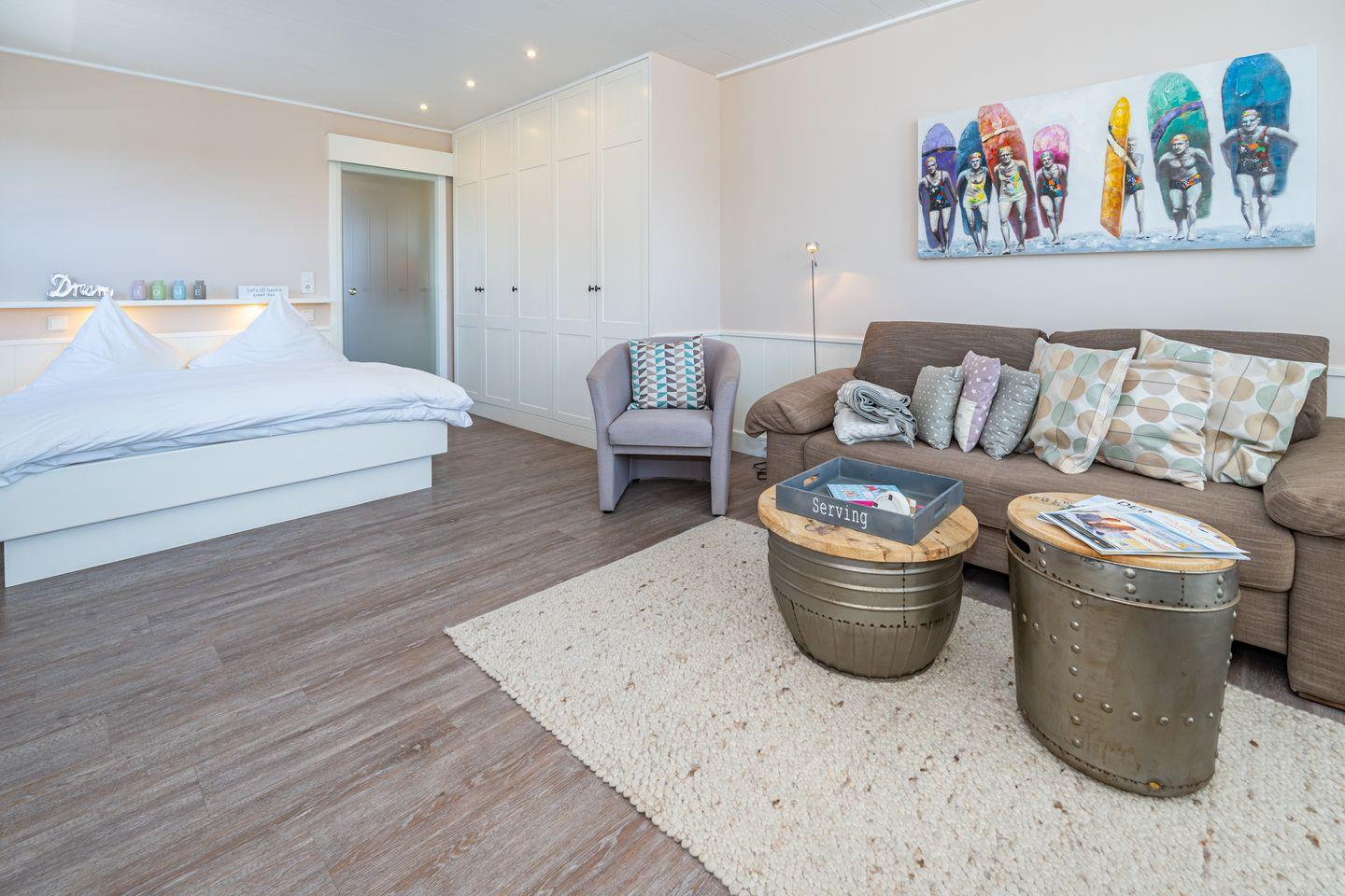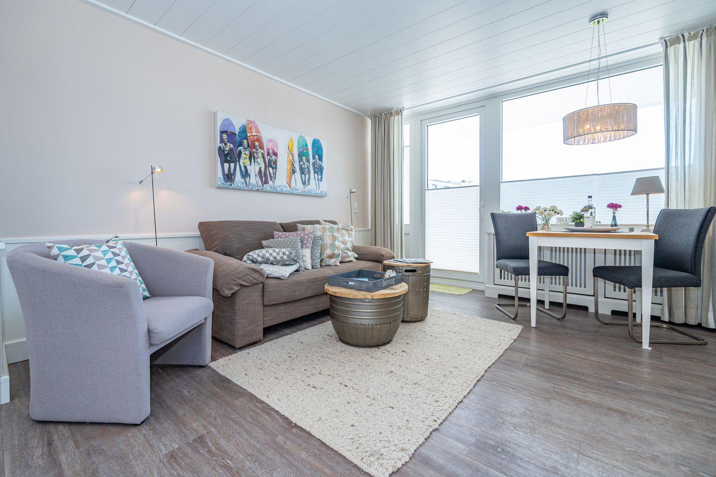 Zauberhafte Perle in Westerland! Erleben Sie die Insel von einer ihrer schönsten Seiten. Diese absolut zentrale, aber ruhige und strandnahe 1-Zimmer-Ferienwohnung (40 qm, 3. OG, ohne Fahrstuhl) mit sonnigem Südbalkon ist modern sowie traumhaft hell und freundlich. Der Wohn-/Ess-/Schlafbereich ist mit exklusiven Materialien und weißen Tischlereinbauten gestaltet worden. Sie betreten die Ferienwohnung über den kleinen Flur mit geschmackvoller Pantryküche (Cerankochfeld, Kühlschrank mit Gefrierfach, Mikrowellen-Backofen, Geschirrspüler, Nespresso-Maschine). Der Wohn- und Schlafbereich ist mit einem Doppelbett (2x 80x200 cm), Essplatz am Fenster, gemütlichem Sofa, Sessel, HiFi-Anlage und großem Flat-/Smart-TV ausgestattet. Das moderne Bad verfügt über eine Raindance-Dusche, WC, Waschbecken, Fön und Handtuchheizkörper. Vom herrlich sonnigen Balkon (mit Tisch und zwei komfortablen Stühlen) sowie vom Essplatz aus sehen Sie zur rechten Seite die Dünen, ein kleiner Blick auf die Nordsee rundet die Aussicht perfekt ab.