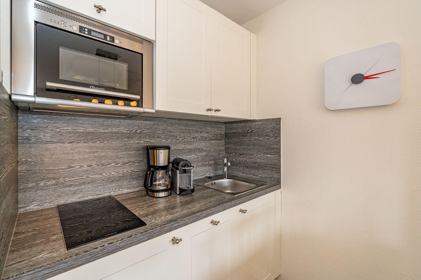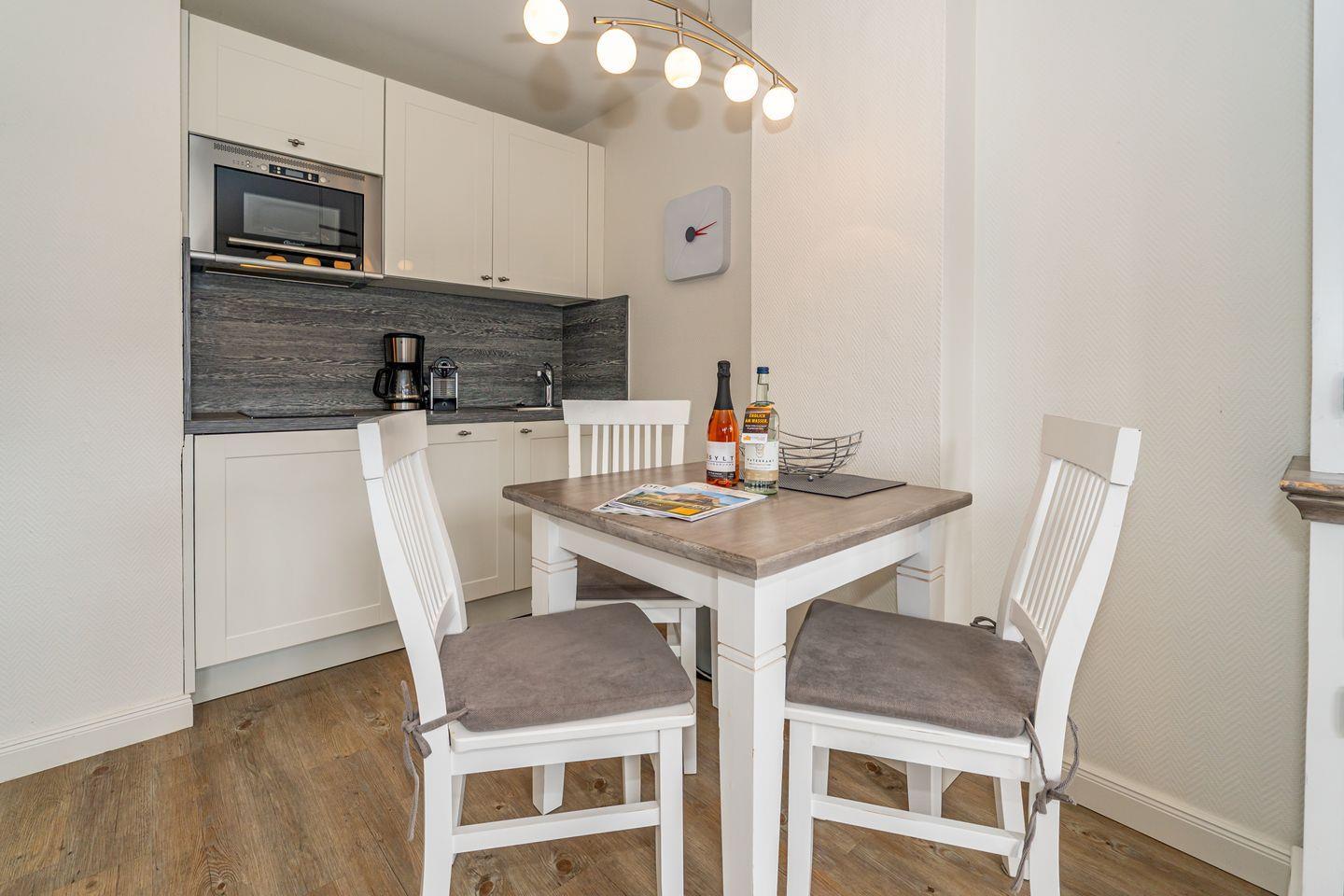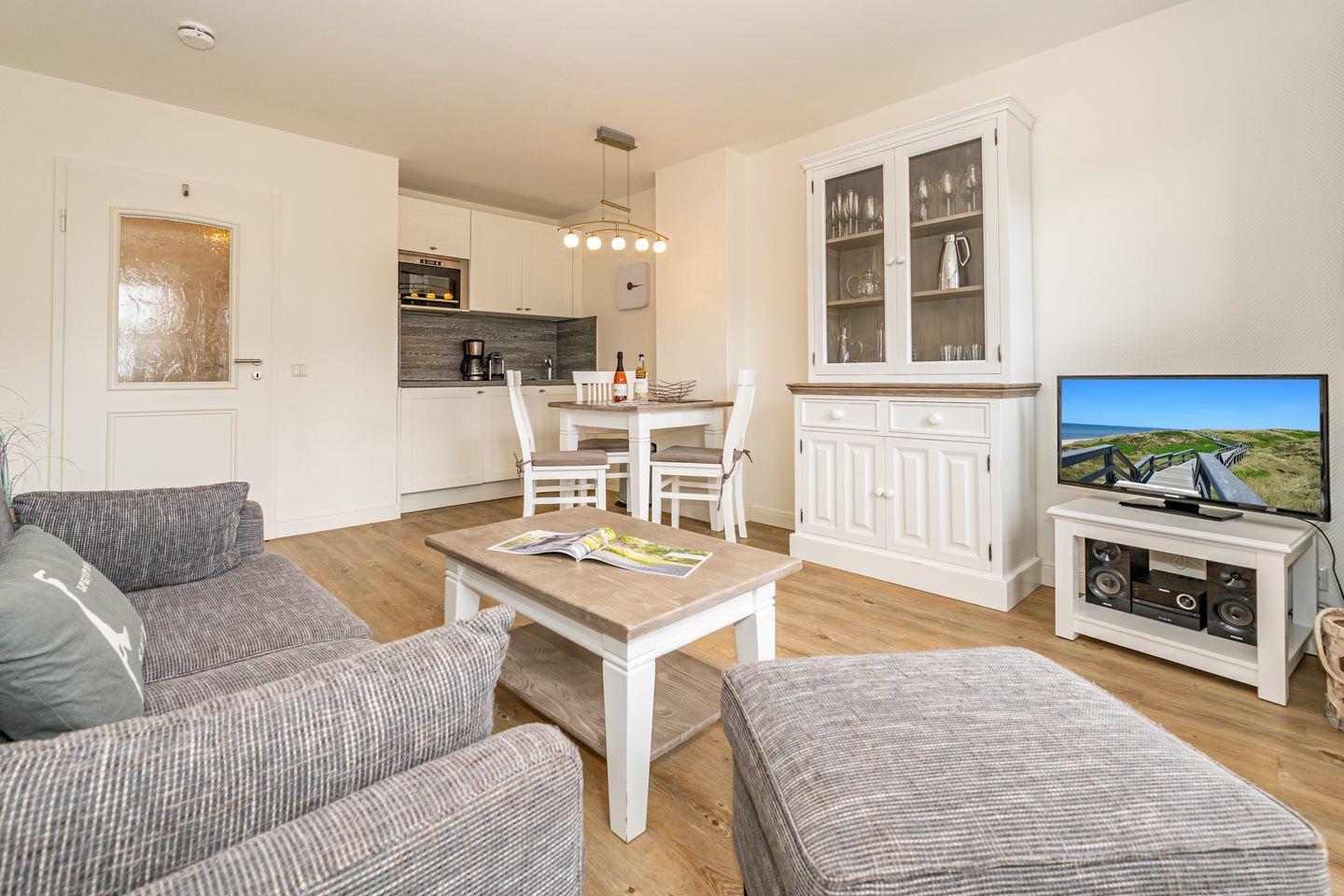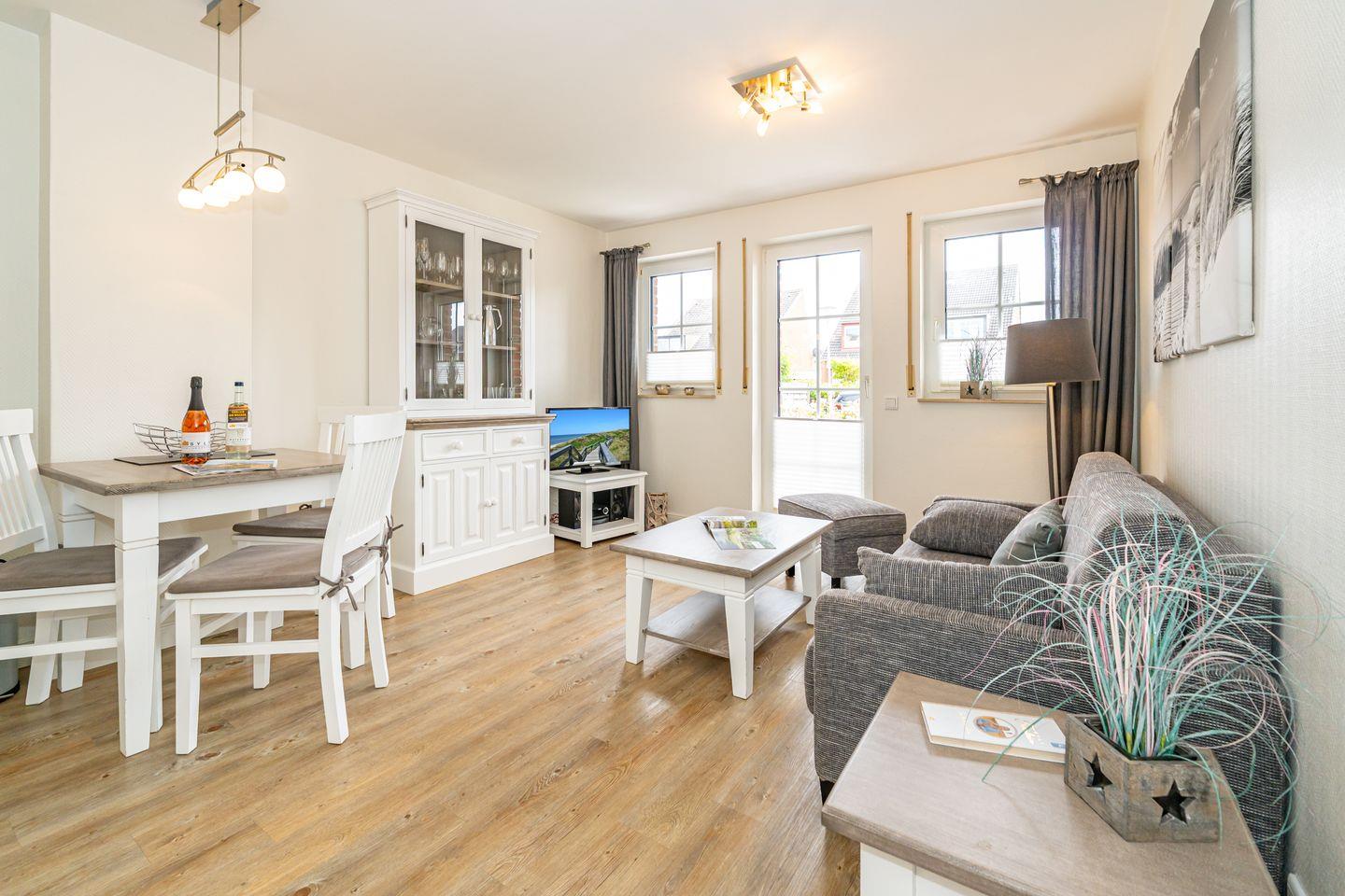 Vom Eingangsbereich kommen Sie in das gemütliche Wohn-/Esszimmer mit Sofa, TV, Essplatz und einer offen gestalteten Landhausküche (Geschirrspüler, Mikrowelle, Cerankochfeld, Nespresso-Maschine). Vor dem Wohnzimmer liegt die Südterrasse mit Gartenmöbeln (saisonal).