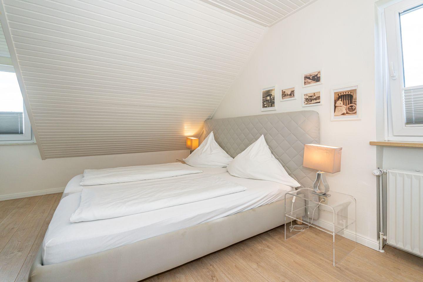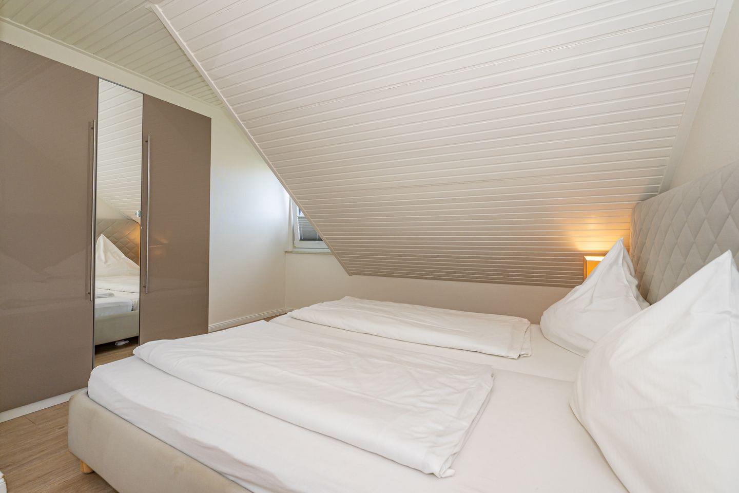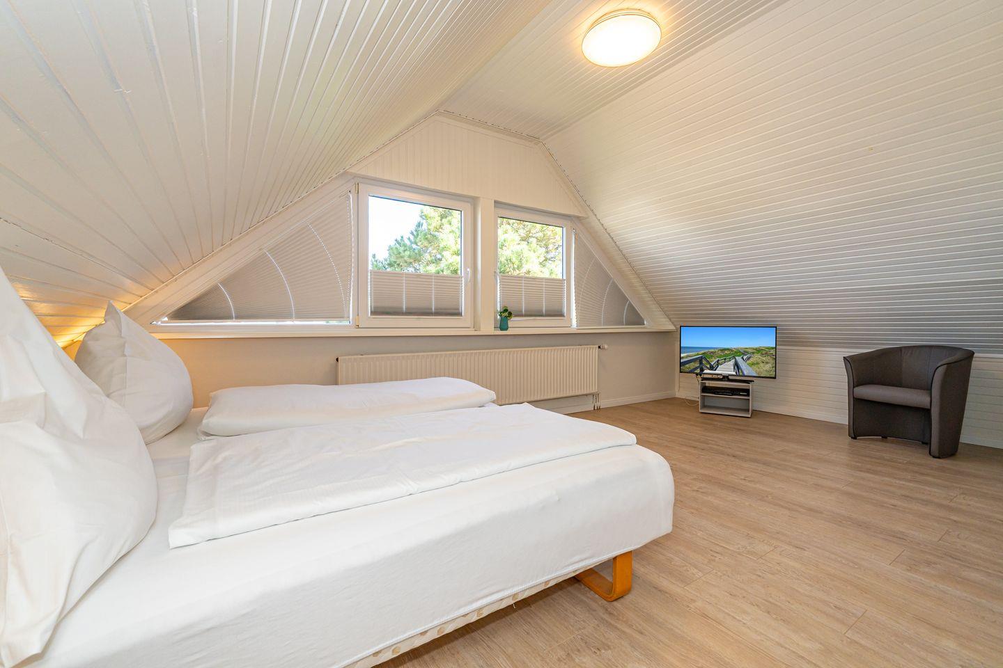 Diese 3- Zimmer-Ferienwohnung in Westerland befindet sich in ruhiger Lage. Die 75m² verteilen sich über zwei Ebenen, Obergeschoss und Dachgeschoss. Im Obergeschoss erwartet Sie ein Flur von wo die Zimmer abgehen. Die offene Küche ist ausgestattet mit einem Ceran-Kochfeld, Mikrowelle mit Backofenfunktion, Geschirrspüler, Espressomaschine (Nespresso), Filter-Kaffeemaschine, elektrischer Wasserkocher und Toaster. Angrenzend an die offene Küche befindet sich der Wohn- und Essbereich. Hier befindet sich ein Esstisch, Sofa und TV. Von hier aus haben Sie Zugang zum möblierten Balkon. Im Obergeschoss befindet sich eines der beiden Schlafzimmer mit Doppelbett und Kleiderschrank, sowie das Duschbad mit Haartrockner und Kombi-Waschtrockner und ein zusätzliches Gäste WC. Über eine Treppe gelangen Sie in das Dachgeschoss der Ferienwohnung wo sich das zweite großzügige Schlafzimmer mit zwei Schlafgelegenheiten befindet. Ein PKW Stellplatz steht Ihnen am Haus zur Verfügung.