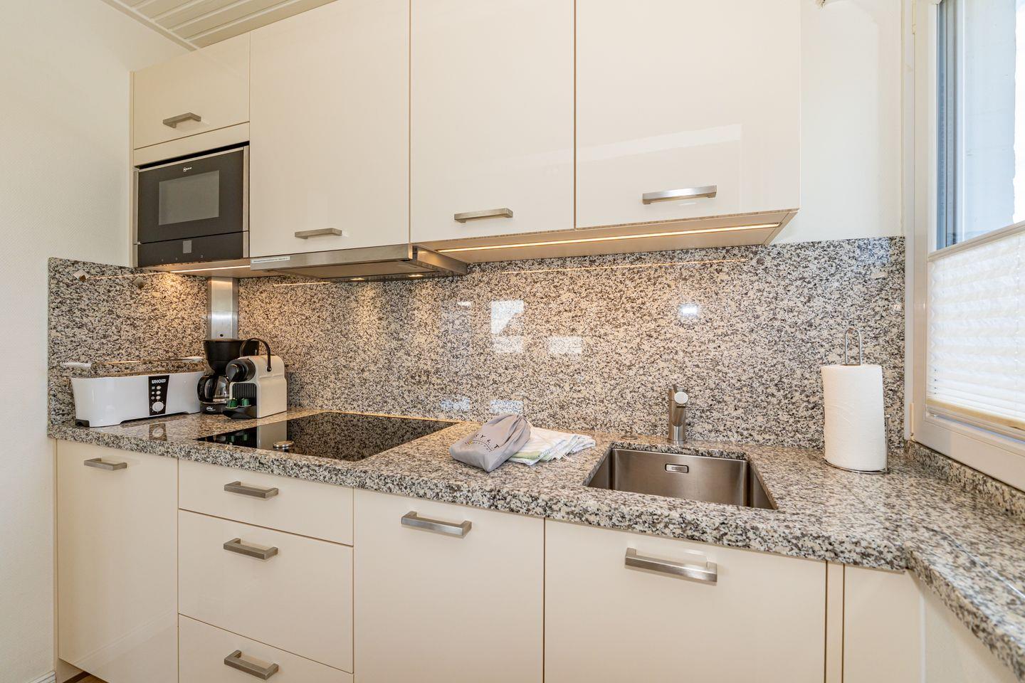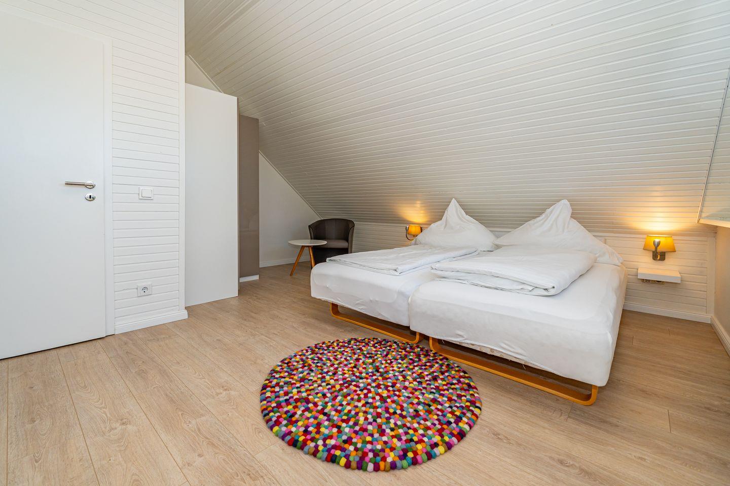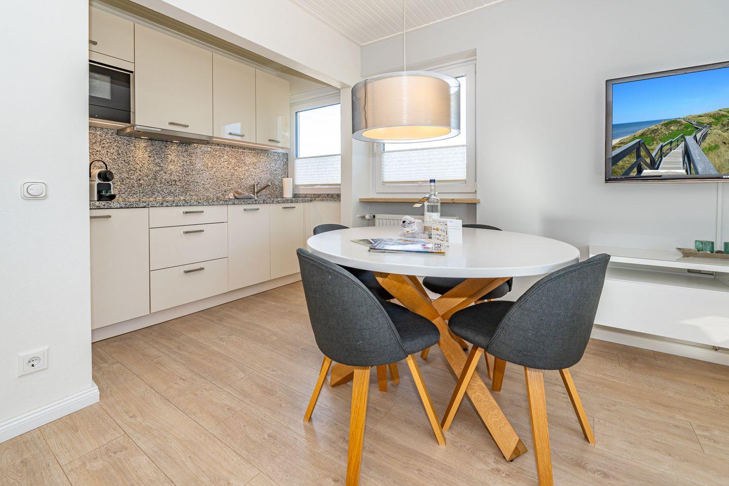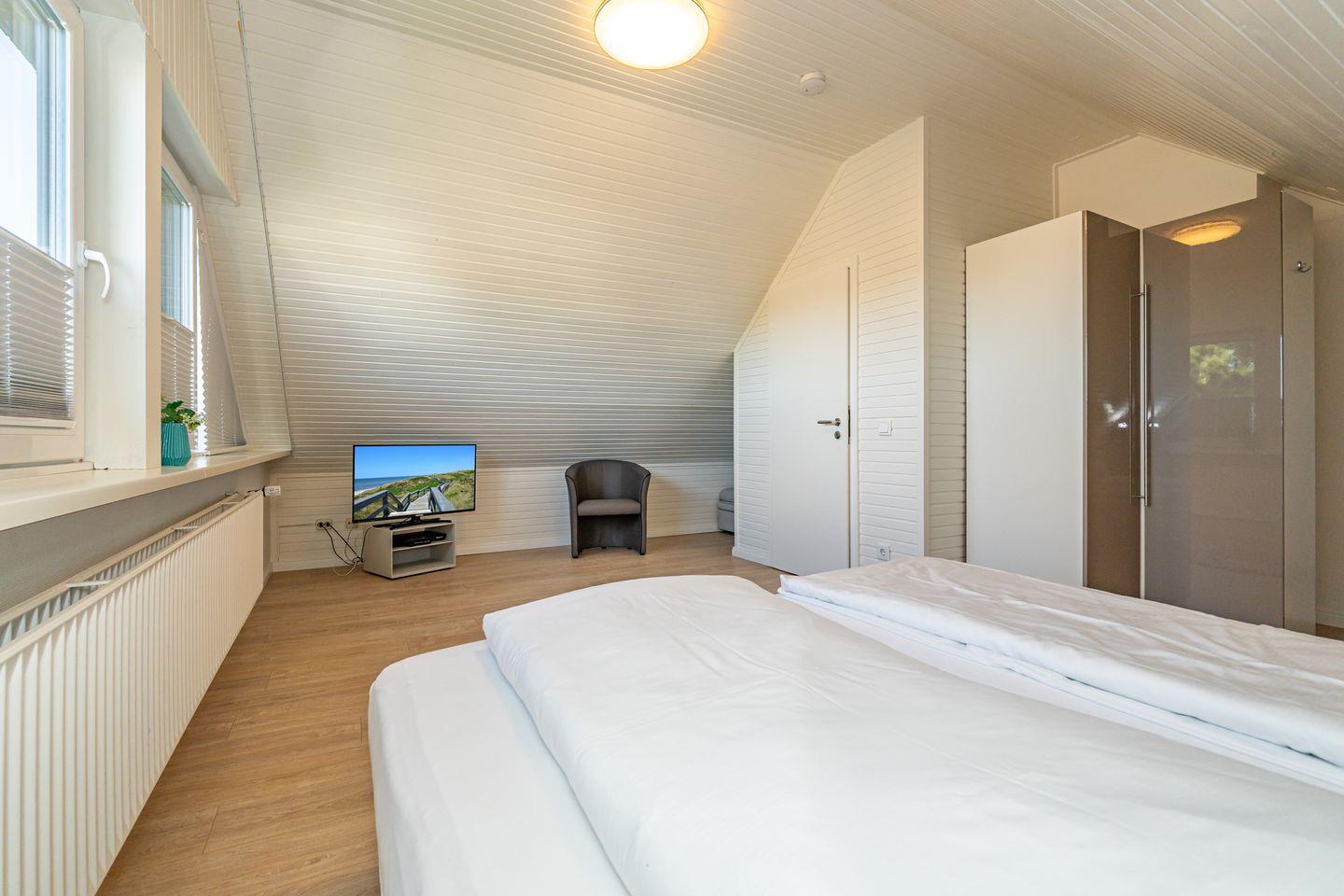 Diese 3- Zimmer-Ferienwohnung in Westerland befindet sich in ruhiger Lage. Die 75m² verteilen sich über zwei Ebenen, Obergeschoss und Dachgeschoss. Im Obergeschoss erwartet Sie ein Flur von wo die Zimmer abgehen. Die offene Küche ist ausgestattet mit einem Ceran-Kochfeld, Mikrowelle mit Backofenfunktion, Geschirrspüler, Espressomaschine (Nespresso), Filter-Kaffeemaschine, elektrischer Wasserkocher und Toaster. Angrenzend an die offene Küche befindet sich der Wohn- und Essbereich. Hier befindet sich ein Esstisch, Sofa und TV. Von hier aus haben Sie Zugang zum möblierten Balkon. Im Obergeschoss befindet sich eines der beiden Schlafzimmer mit Doppelbett und Kleiderschrank, sowie das Duschbad mit Haartrockner und Kombi-Waschtrockner und ein zusätzliches Gäste WC. Über eine Treppe gelangen Sie in das Dachgeschoss der Ferienwohnung wo sich das zweite großzügige Schlafzimmer mit zwei Schlafgelegenheiten befindet. Ein PKW Stellplatz steht Ihnen am Haus zur Verfügung.