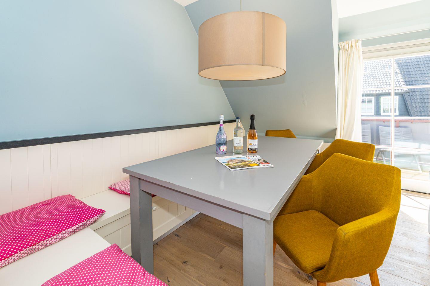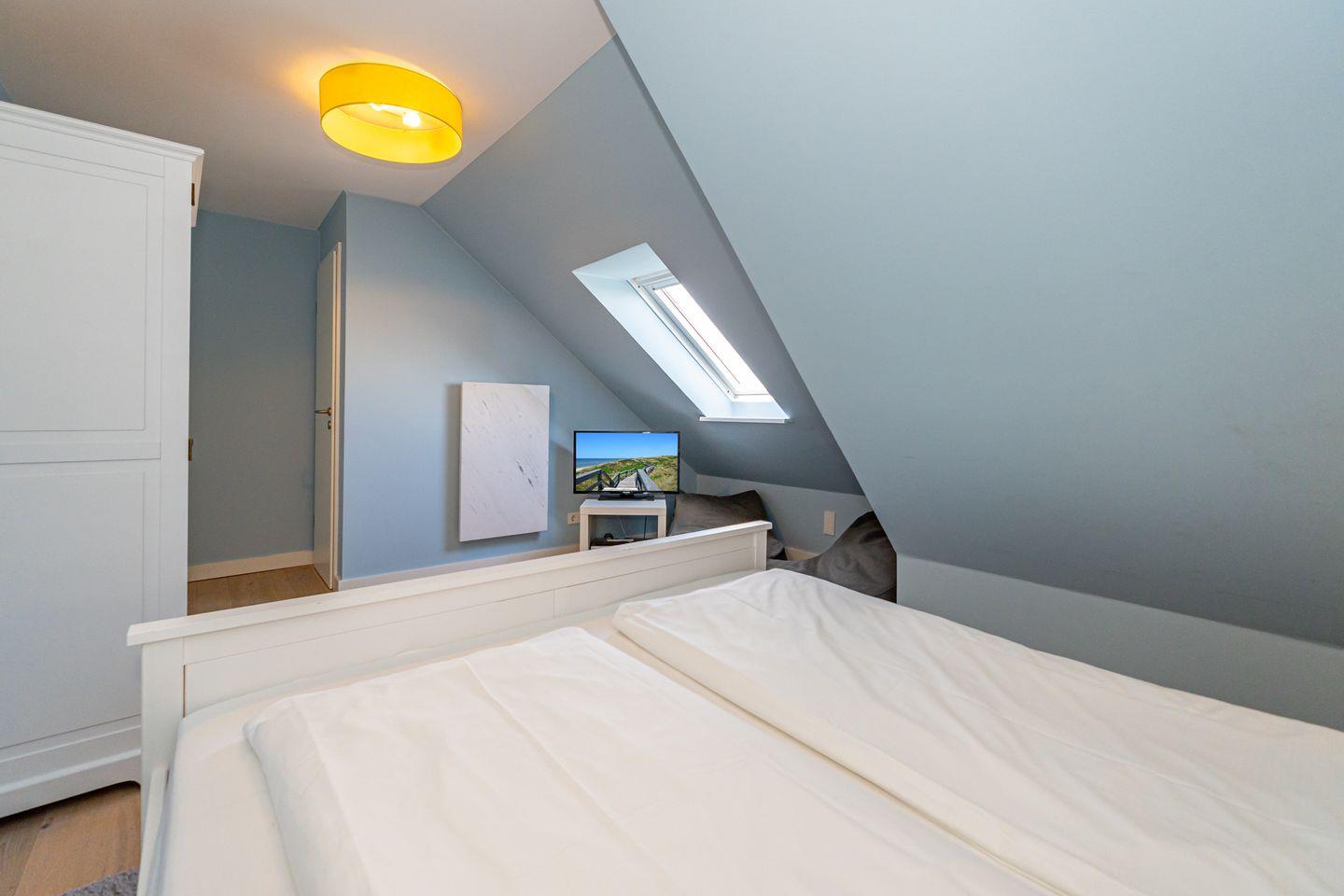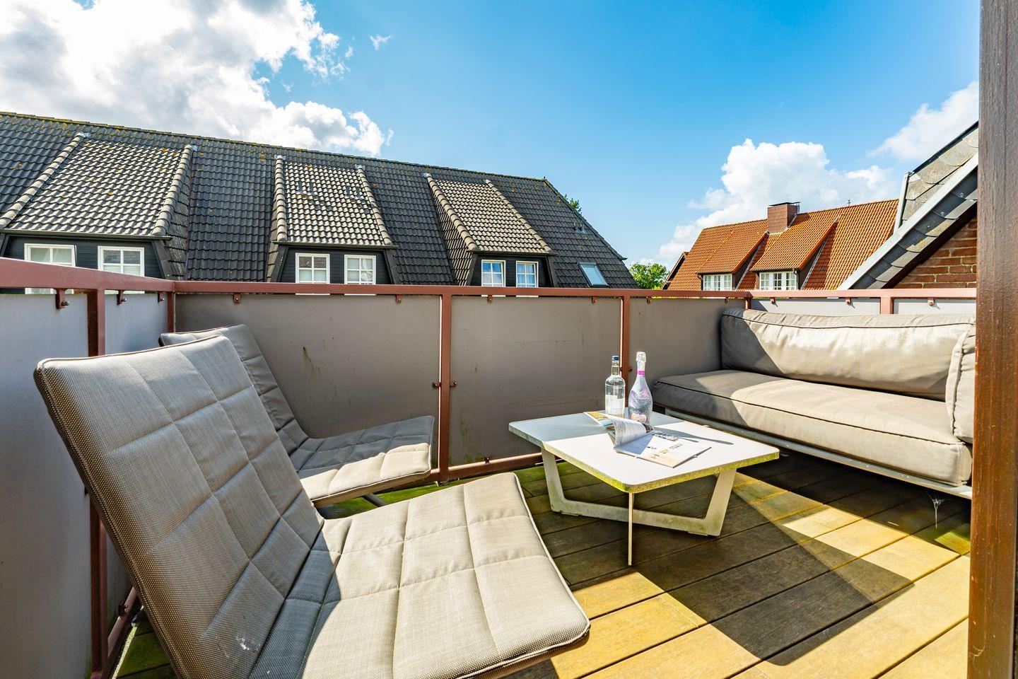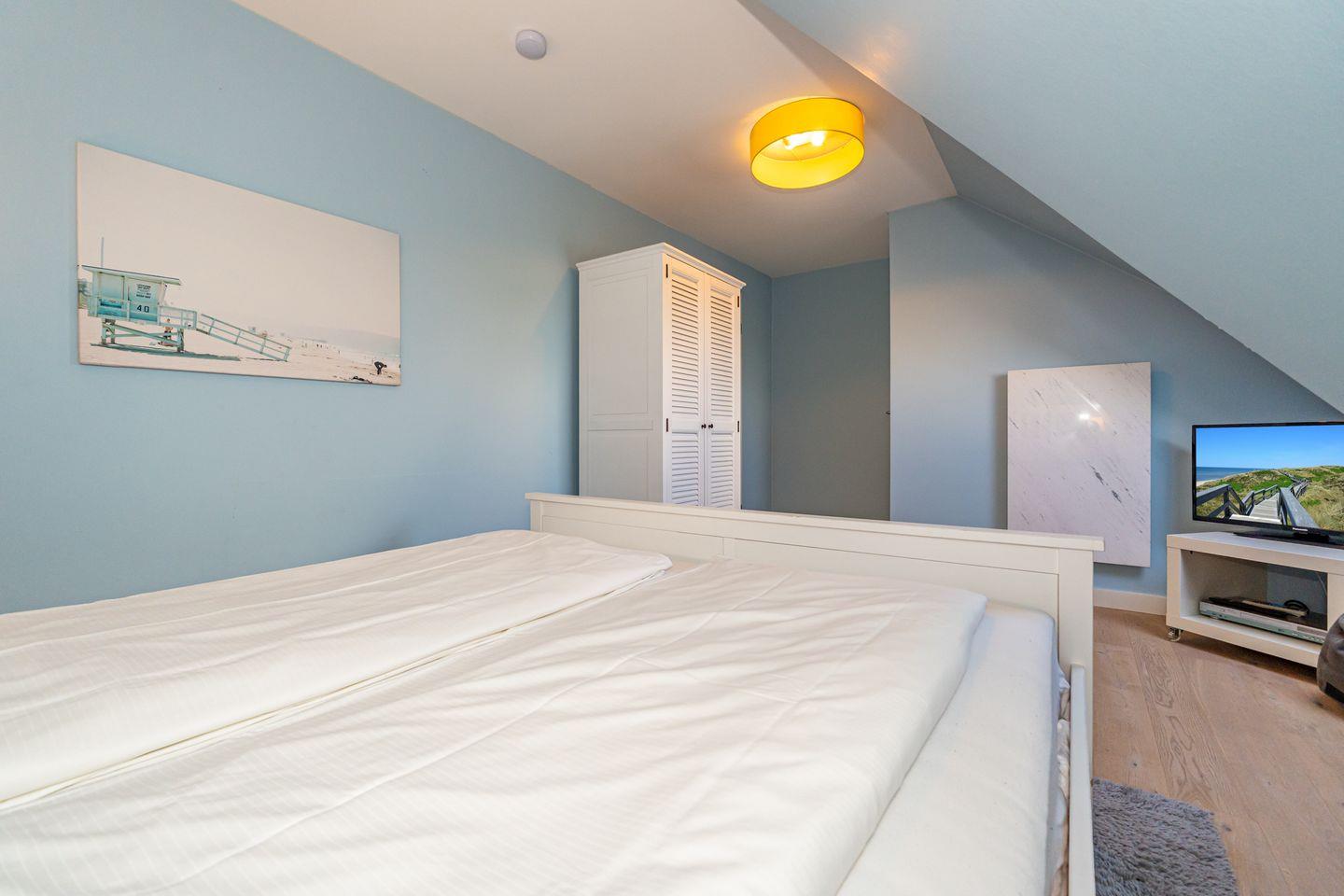 Der Wohnbereich ist ausgestattet mit Flat-TV, DVD Player großem Sofa und Sessel. Von hier ist der westlich ausgerichtete Balkon mit Möblierung zu erreichen, auf dem Sie auch noch am Nachmittag die Sonne genießen können und einen schönen Blick auf die Deichwiesen haben. Selbst ein Blick auf die Dünen können Sie von hier aus erhaschen. Ebenfalls auf dieser Ebene finden Sie die hochwertige, voll ausgestattete, offene Landhaus-Küche mit angrenzendem großen Esstisch. Vom Flur im OG erreichen Sie zudem noch das Doppelbettschlafzimmer mit großem Kleiderschrank, als auch das Duschbad mit Waschmaschine. Über eine gut begehbare Treppe gelangen Sie ins Dachgeschoss, wo Sie ein weiteres Doppelbettschlafzimmer mit TV und DVD Player sowie ein Zimmer mit Einzelbett, ideal für Ihren Nachwuchs, erwarten.
