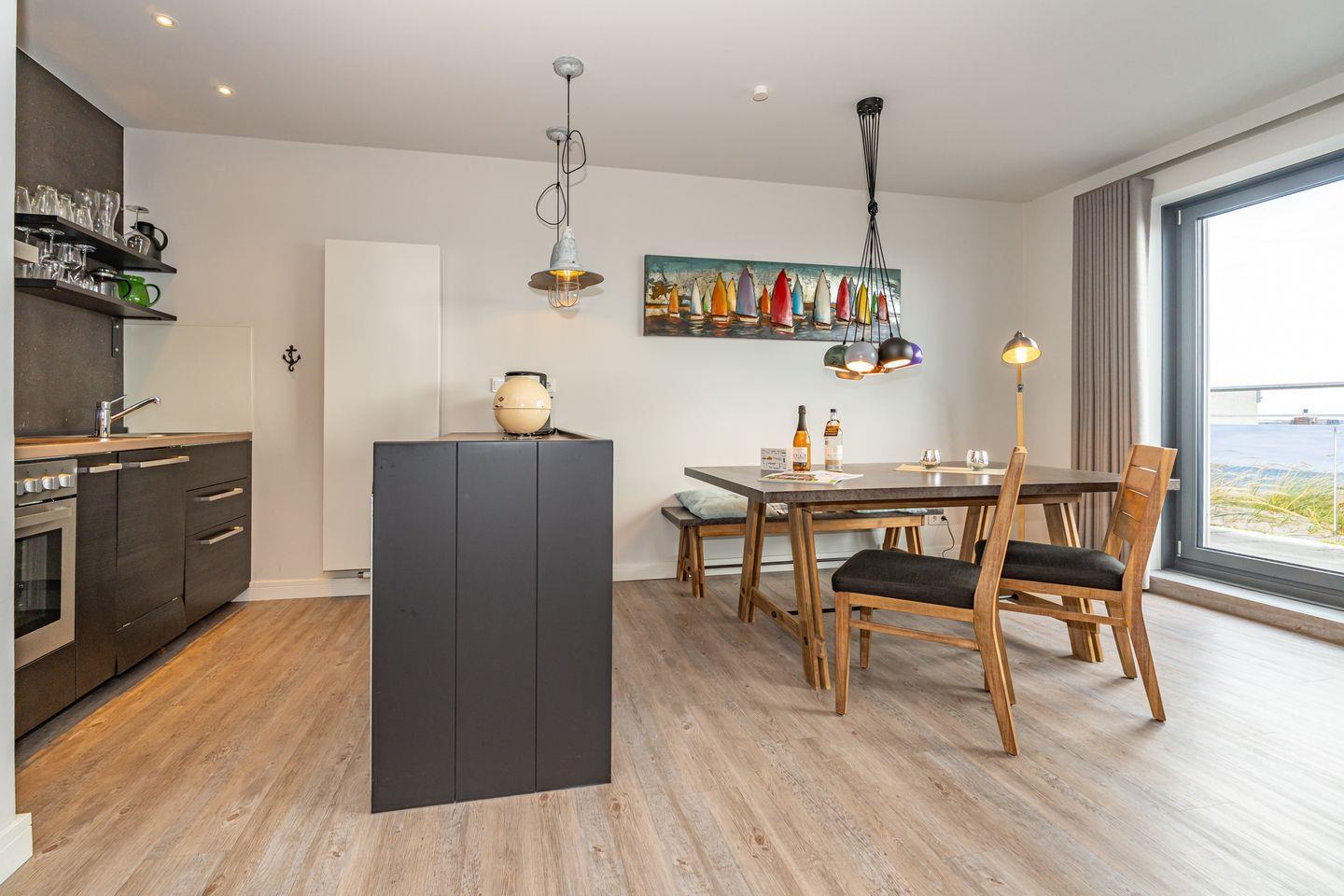 2- Zimmer Penthouse Ferienwohnung im Herzen von Westerland (65 qm) mit seitlichem Meerblick, über eine Ebene für bis zu 2 Personen. Sehr hochwertig und geschmackvoll eingerichtet. Ein stylisches Wohnzimmer mit Couch und Flatscreen., angrenzend ein einladender, offener Essbereich mit Esstisch, zwei Stühlen und eine Bank. Offene Küche mit Kapselkaffeeautomat, Geschirrspüler, Ceranfeld, Backofen und dem üblichen Komfort. Ein helles Schlafzimmer mit Doppelbett (2x 90x200cm), Kleiderschrank und TV. Badezimmer (Duschbad) mit Dusche, WC, Waschbecken, Handtuchwärmer und Föhn. Zur Wohnung gehört ein Tiefgaragenparkplatz, von hier aus erreichen Sie die Penthouse Ferienwohnung mit dem Fahrstuhl. Bitte beachten Sie, dass Haustiere in dieser Ferienwohnung nicht erlaubt sind und diese Ferienwohnung eine Nichtraucherwohnung ist. Vom Wohnbereich und vom Schlafzimmer haben Sie Zutritt zum Balkon mit Gartenmöbeln.