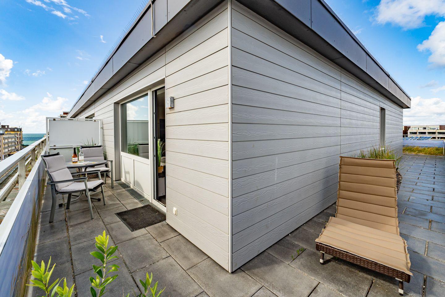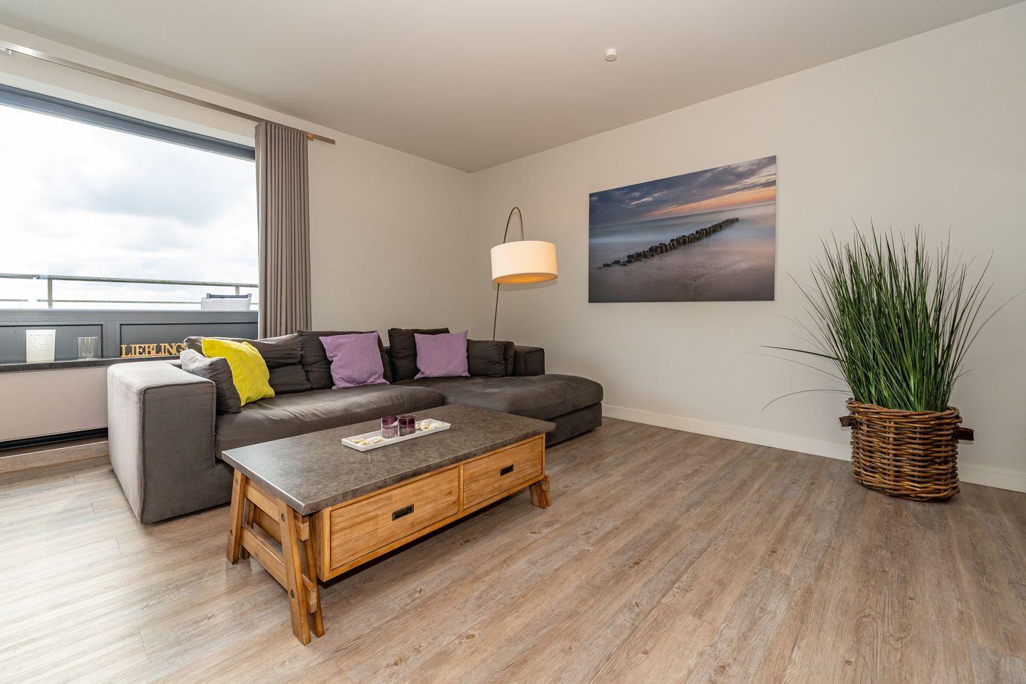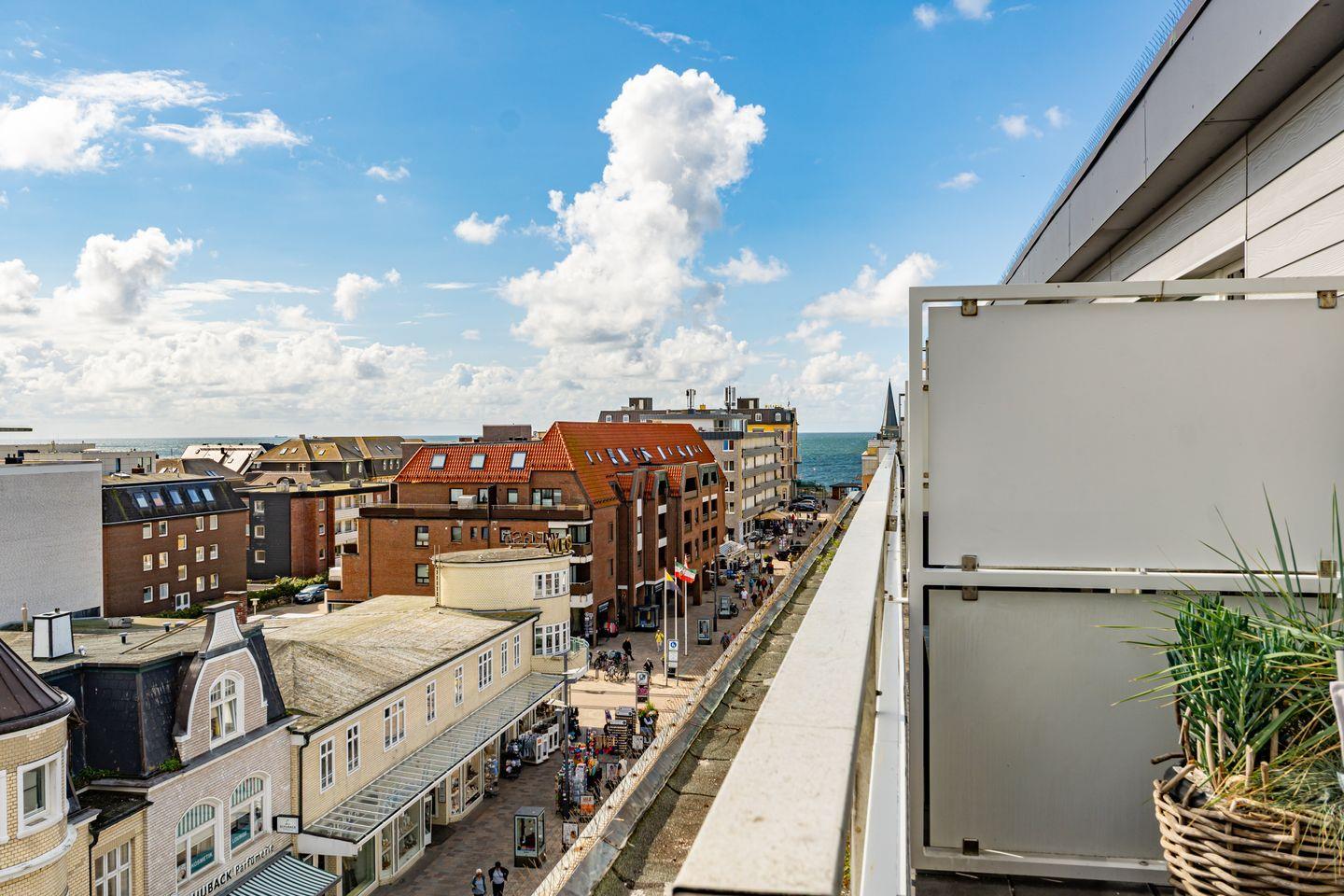 Exklusive Penthouse-Ferienwohnung mit seitlichem Meerblick und großem Balkon in Westerland, nur 250 m vom Strand entfernt.