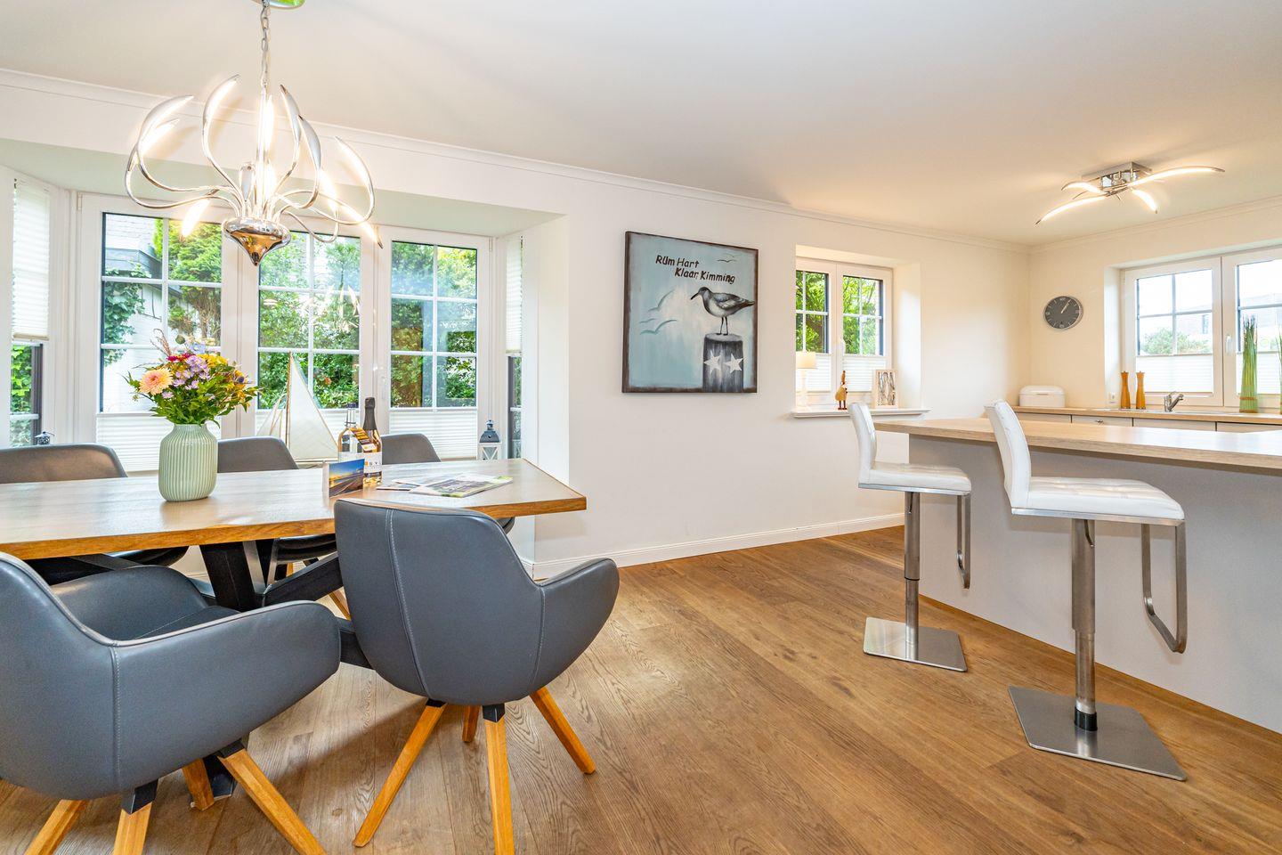 Durch die zentrale Lage der "Gode Stuv" haben Sie alle Möglichkeiten, die Insel Sylt zu erkunden. Schnell sind Sie auch fußläufig in der Westerländer Innenstadt und natürlich am wunderschönen Sandstrand. Eine gemütliche Sofalandschaft mit Elektrokamin und Blick in Ihren eigenen Garten mit Südwestterrasse, sind nur einige Höhepunkte der "Gode Stuv". Den Garten werden Sie schnell lieben lernen: Lädt Sie doch die eigene Blockhaussauna mitten im Garten zum entspannen ein. Genießen Sie auch den Strandkorb (saisonal) und die hochwertigen Lounge-Möbel. Die helle, offene Küche mit coolen Barhockern, lädt genauso wie der große Esstisch zu lauschigen Nachmittagen mit der ganzen Familie oder Freunden ein. Im Obergeschoss finden Sie zwei gleichgroße Schlafzimmer mit Boxspringbetten (180m x 200 cm), sowie das Badezimmer mit ebenerdiger Dusche. Im Dachgeschoss befindet sich das dritte Schlafzimmer mit einem Boxspringbett (160 x 200 cm). Alle Schlafzimmer verfügen über ein TV-Gerät. Auch eine Gästetoilette mit ebenerdiger Dusche, sowie eine Waschmaschine im Erdgeschoss, gehört mit zur Ausstattung. Ein Stellplatz, für Ihr Auto ist selbstverständlich direkt am Ferienhaus für Sie reserviert. Haustiere sind nach vorheriger Anmeldung und gegen Gebühr erlaubt (10,- € pro Tier/Tag).